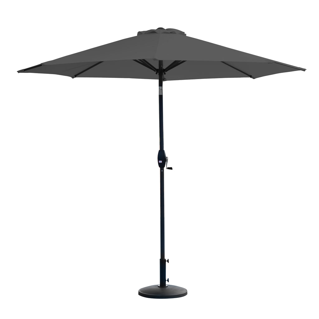 Stay in the shade this summer with this beautiful 9 ft. umbrella. Made of a solid-colored polyester canopy that shields you from harmful UV rays and has a weather and water-resistant treatment to keep the canopy looking great each season. To keep you safe from the sun, the weather-resistant pole has a simple crank lift and a manual push-button tilt to open the umbrella with ease and adjust the canopy to block the sun. There is no need to search for the ideal base because a base includes a lovely metal base.