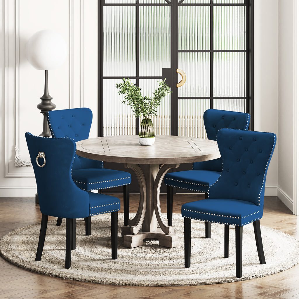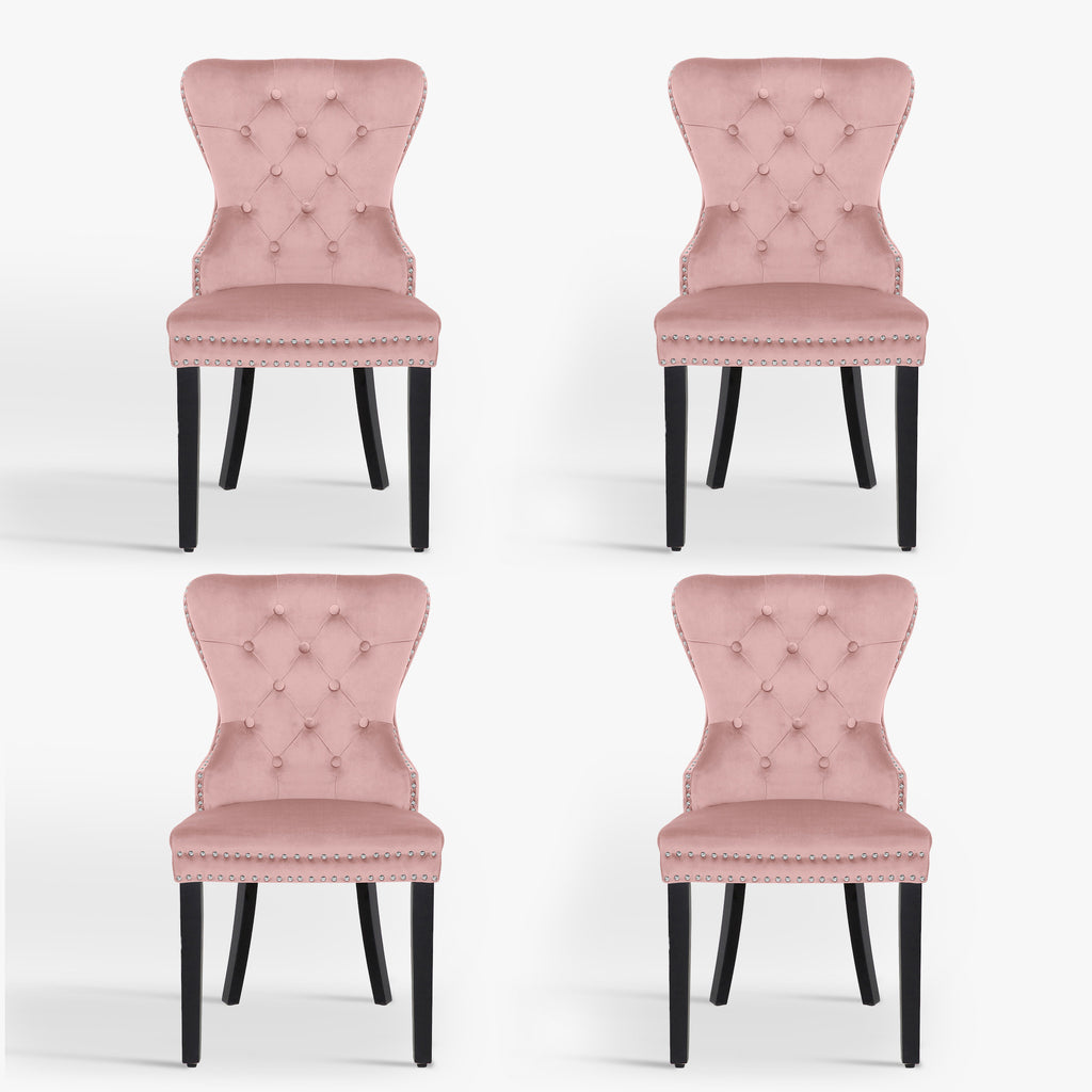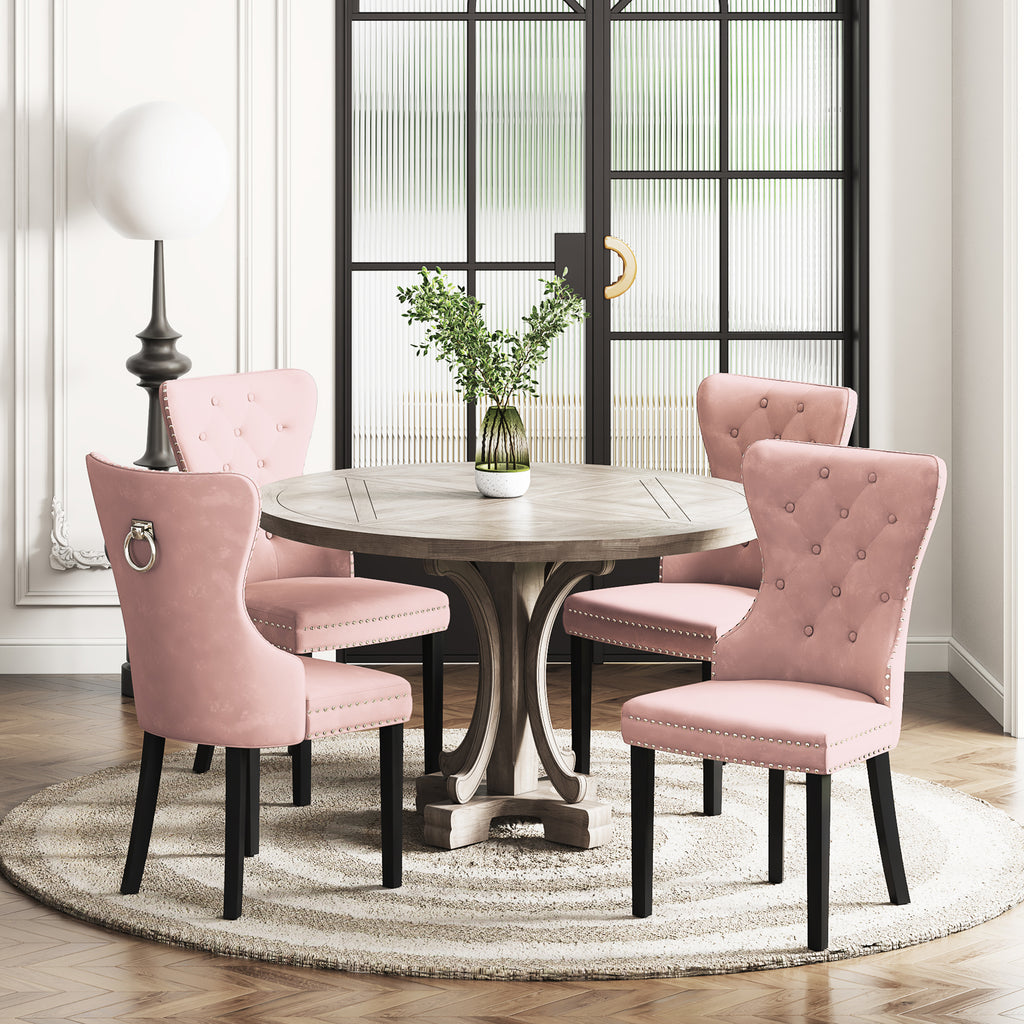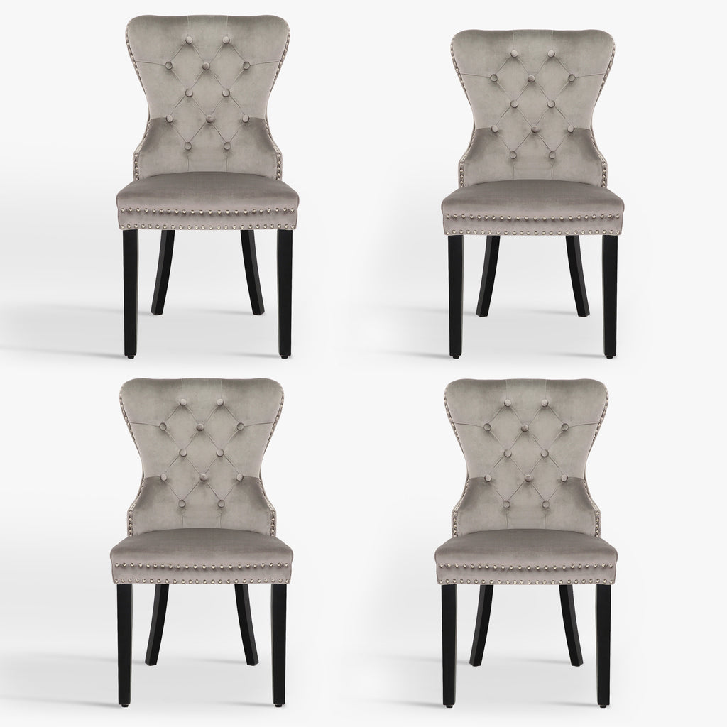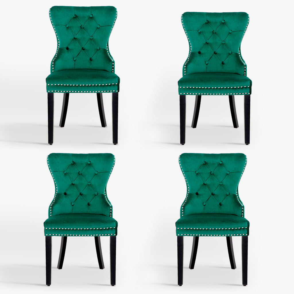 Add some style and glam up your dining room with this lovely four-piece velvet dining chairs. The diamond button-tufted design, silver nailhead trim, silver pull ring on the back for easy movement of the chair, and wingback design make the chairs a standout conversation piece. A velvety fabric that is soft to the touch and provides amazing comfort, especially thanks to the thick cushion that is perfect for gathering around the dinner table for hours. If the chairs are not perfectly leveled, a handy foot leveler are on the front legs to adjust for the perfect level.
