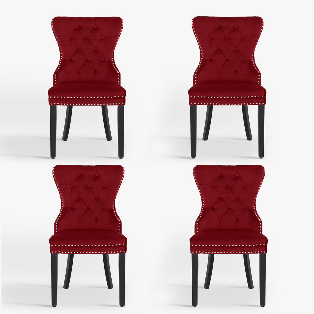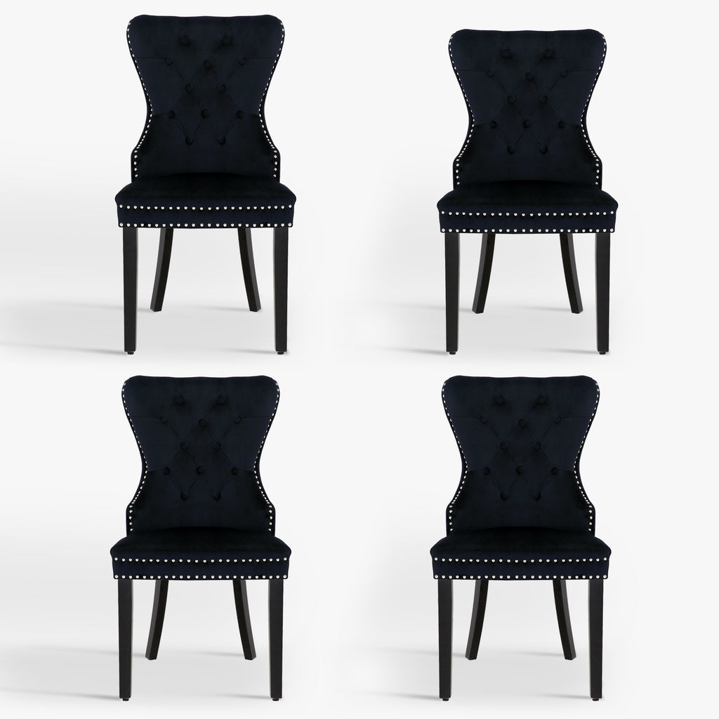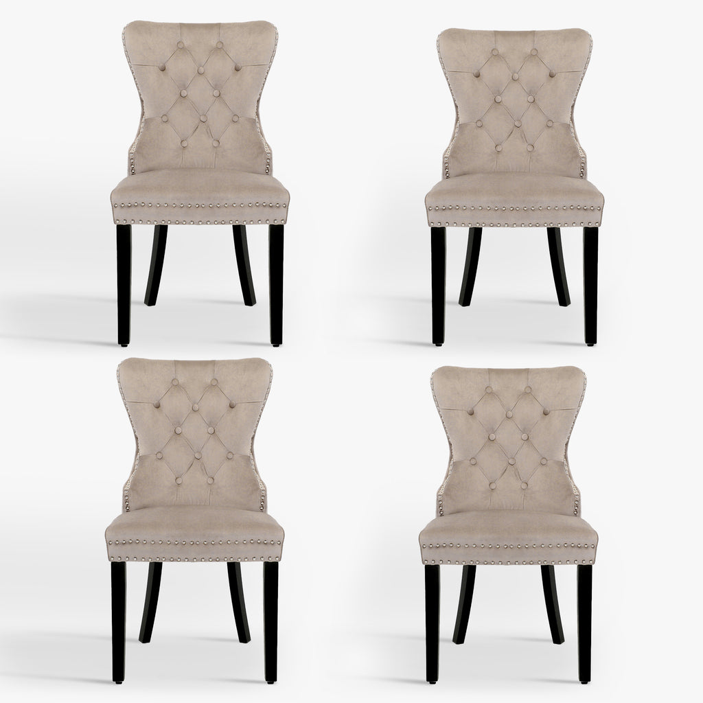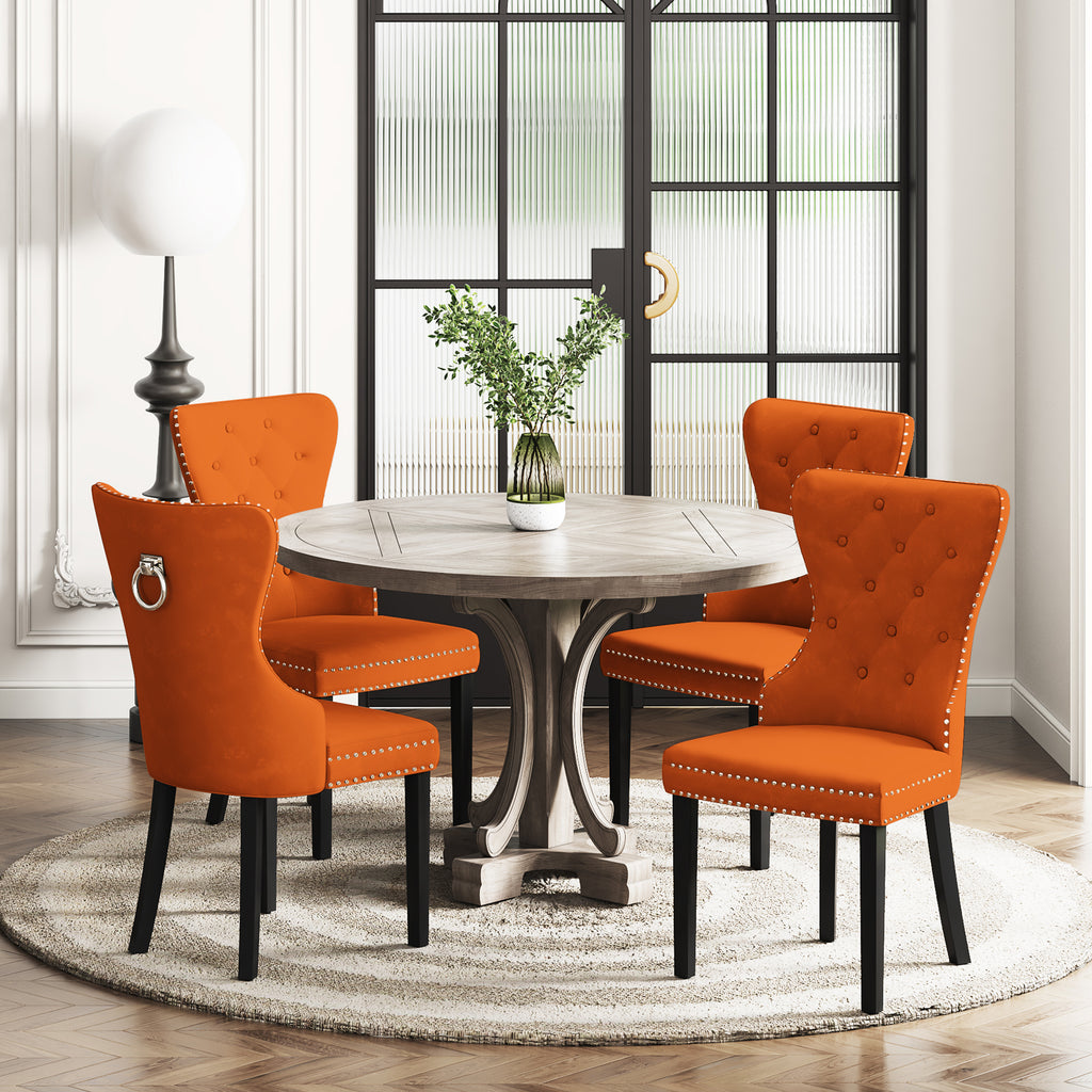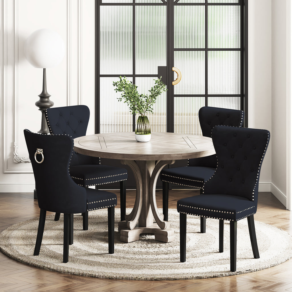 Add some style and glam up your dining room with this lovely four-piece velvet dining chairs. The diamond button-tufted design, silver nailhead trim, silver pull ring on the back for easy movement of the chair, and wingback design make the chairs a standout conversation piece. A velvety fabric that is soft to the touch and provides amazing comfort, especially thanks to the thick cushion that is perfect for gathering around the dinner table for hours. If the chairs are not perfectly leveled, a handy foot leveler are on the front legs to adjust for the perfect level.