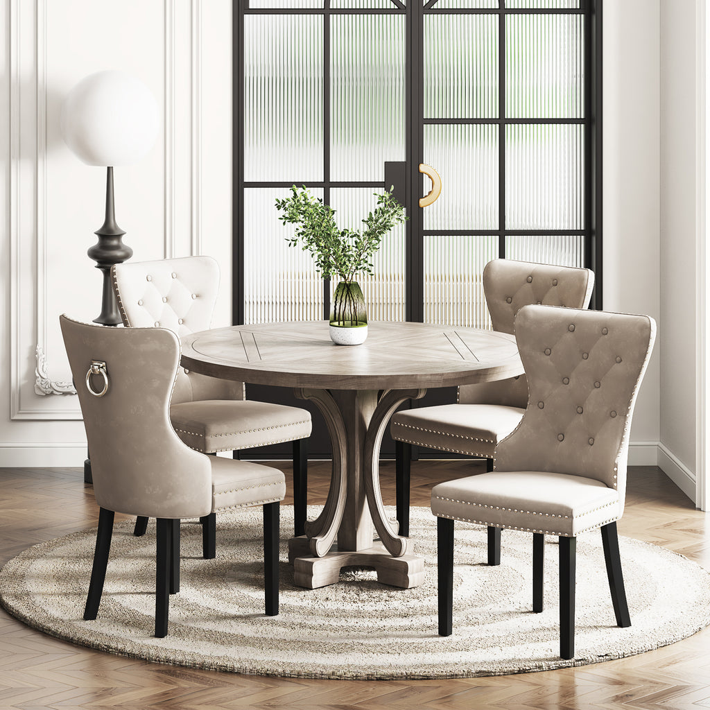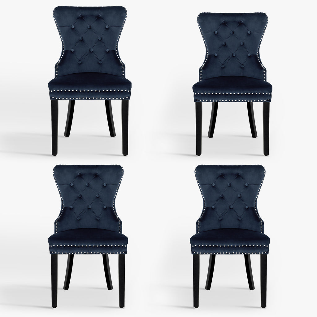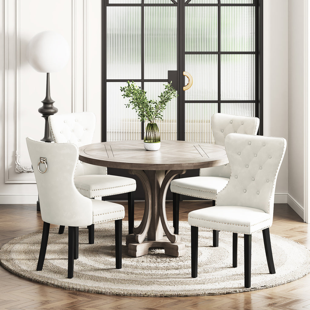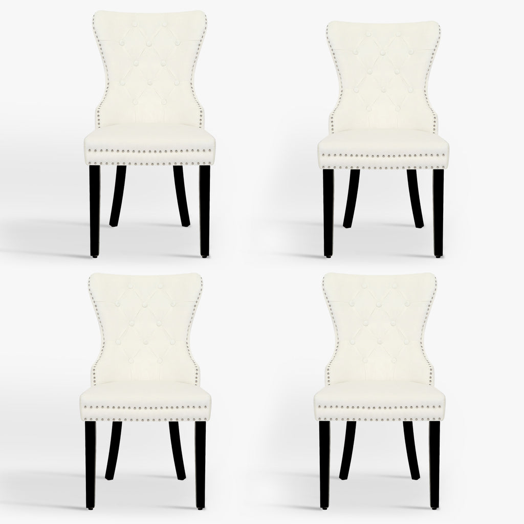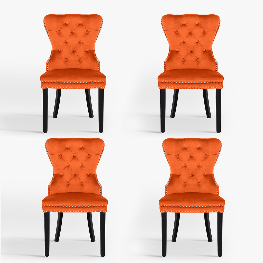 Add some style and glam up your dining room with this lovely four-piece velvet dining chairs. The diamond button-tufted design, silver nailhead trim, silver pull ring on the back for easy movement of the chair, and wingback design make the chairs a standout conversation piece. A velvety fabric that is soft to the touch and provides amazing comfort, especially thanks to the thick cushion that is perfect for gathering around the dinner table for hours. If the chairs are not perfectly leveled, a handy foot leveler are on the front legs to adjust for the perfect level.