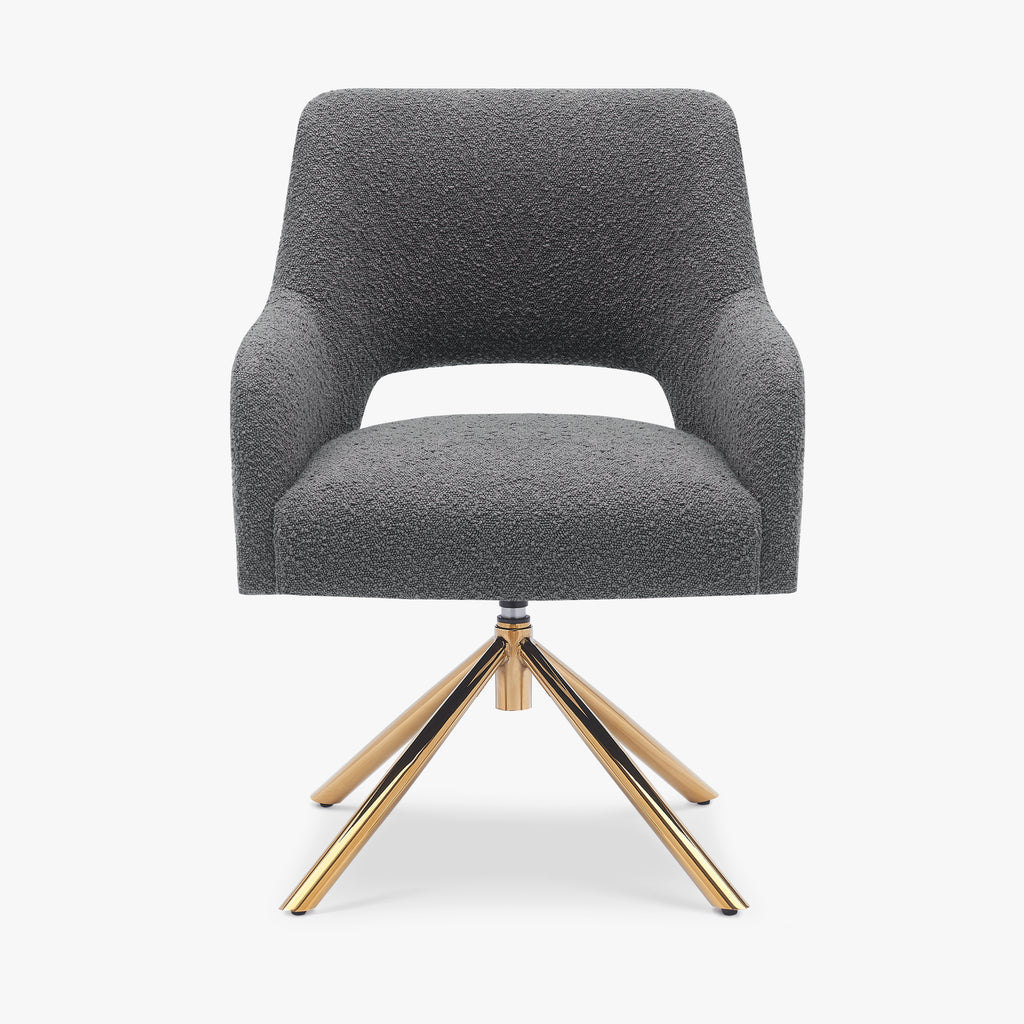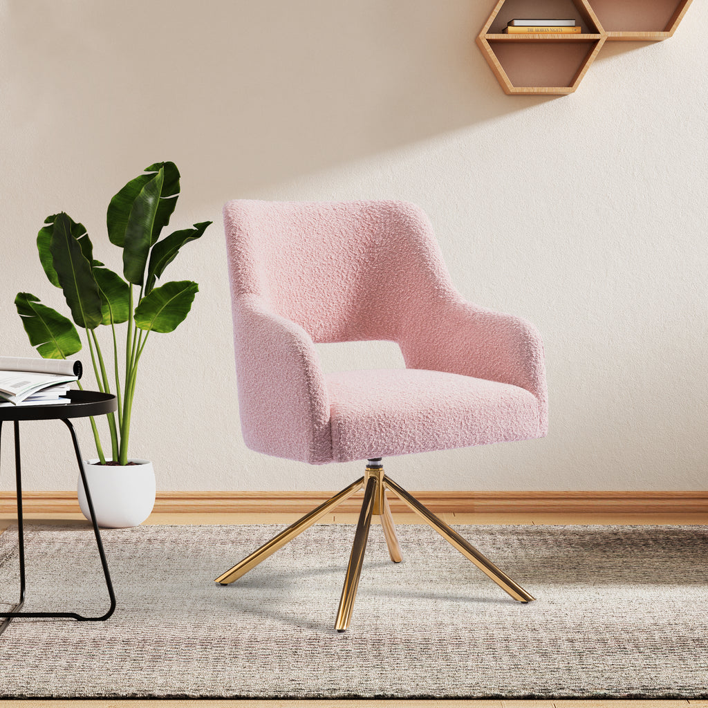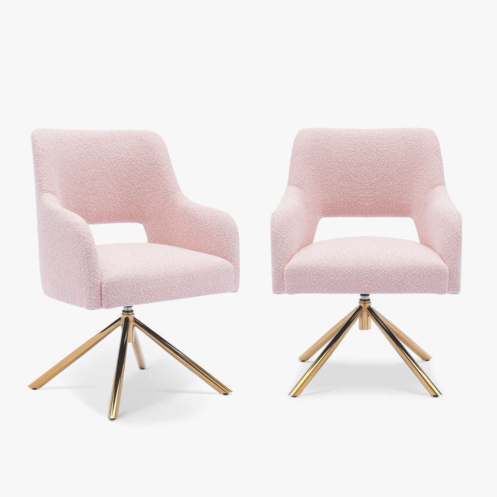 Revamp your home office or vanity area with a delightful duo of upholstered boucle Accent chairs. luxuriously cushioned and cozy, the meticulously designed boucle fabric offers water and stain resistance, adding an extra layer of protection and comfort with its soft and plush feel. enjoy spacious and comfortable seating provided by the wide and curved backrests, offering ample support and breathability. sink into the foam-filled seats offering superior comfort that springs back due to the foam's longevity. revel in the 360° swivel bases allowing easy movement without pulling the chairs out. safeguard your floors with the protective foot pads, ensuring damage-free floors and stable chair placement.