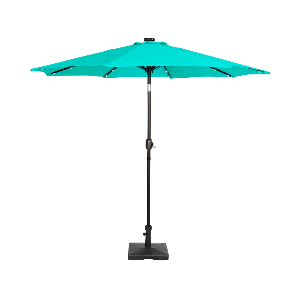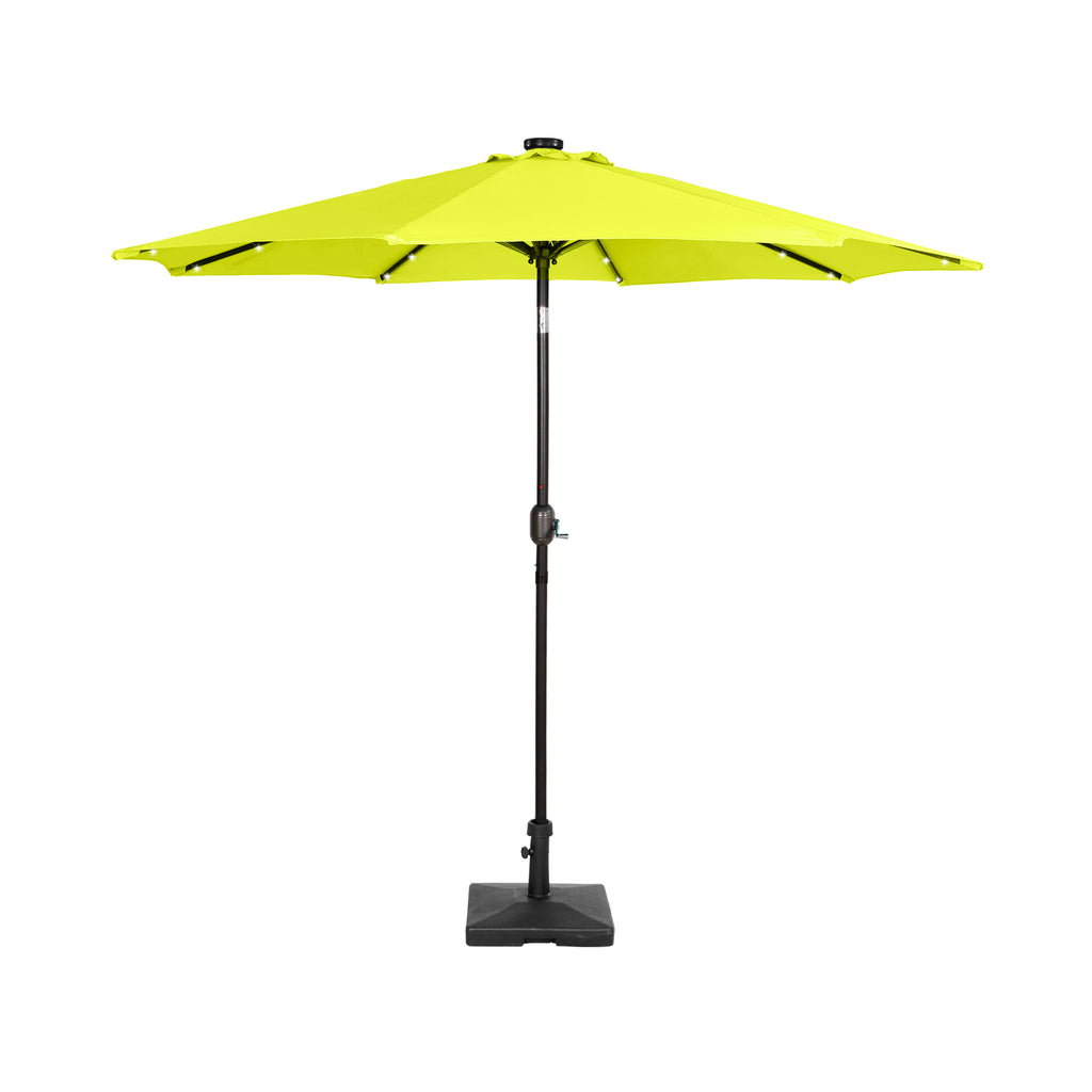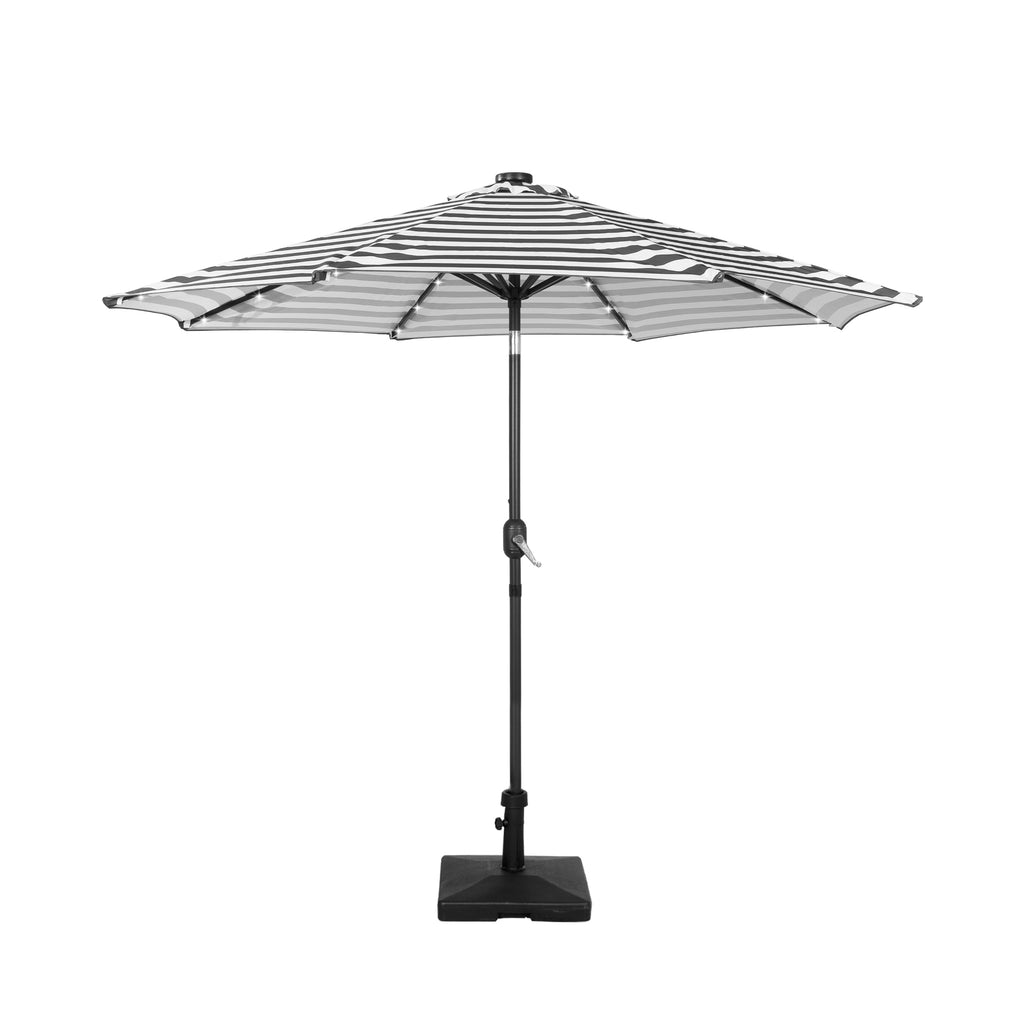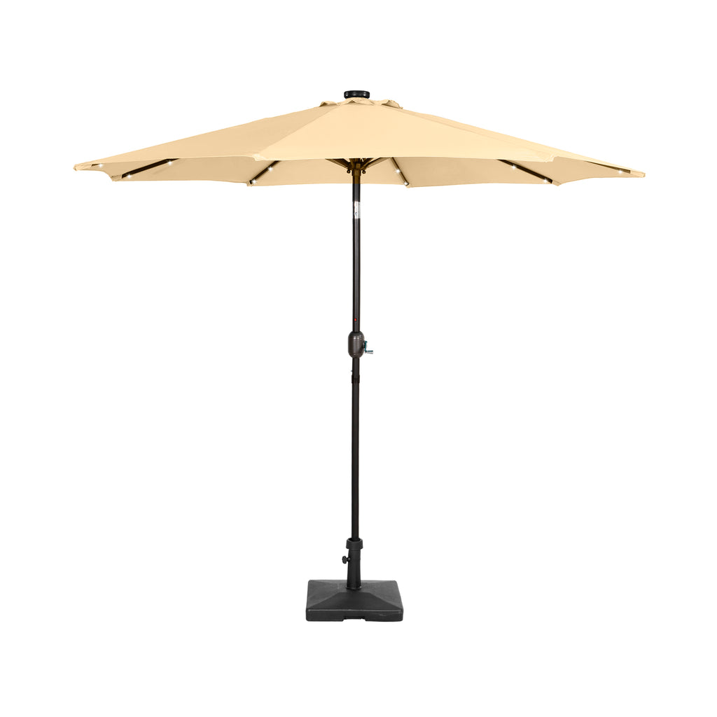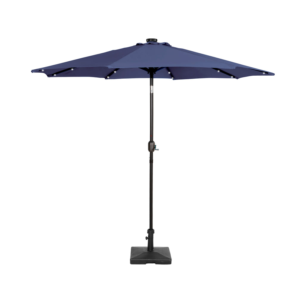 The 9-ft umbrella with LED lighting will keep you well-lit all night long while you unwind in the shade and relax at night under the light. The 32 solar-powered LED lights are powered by the solar panel on top of the umbrella, which keeps them on all night. It features a simple hand cranked lift and a easy-to-push button tilt that can easily cover the sun at any angle and power the solar lights at the same time! Keep cool all day long with the umbrella's vented design, that promotes airflow to keep you cool while under the umbrella and makes it easier for strong gusts to move through the fabric. With the round bronze base, it makes for a sturdier design. A long-lasting, water and fade-resistant polyester fabric blocks the sun and harmful UV rays. This umbrella is perfect for all your needs and will make the perfect addition to your backyard.