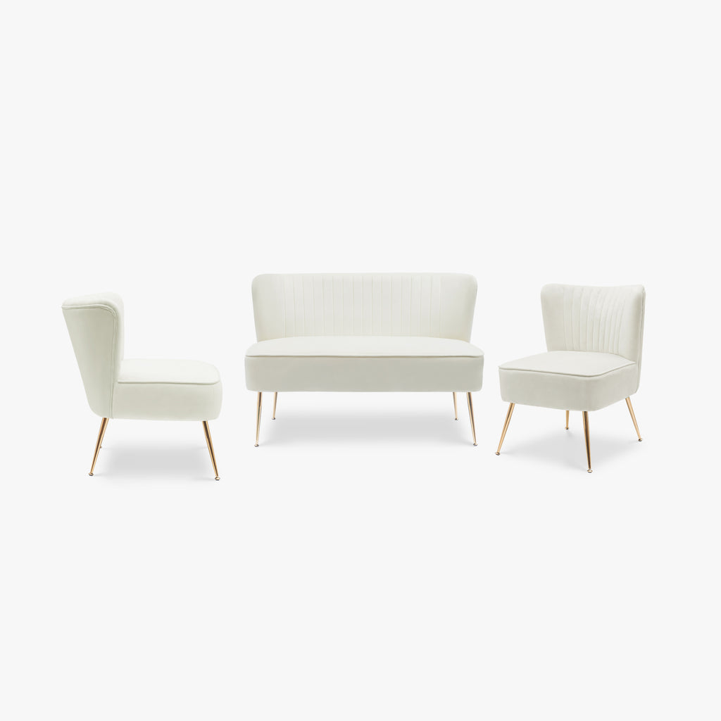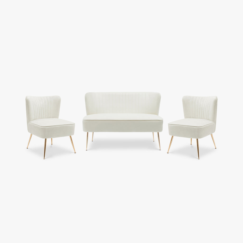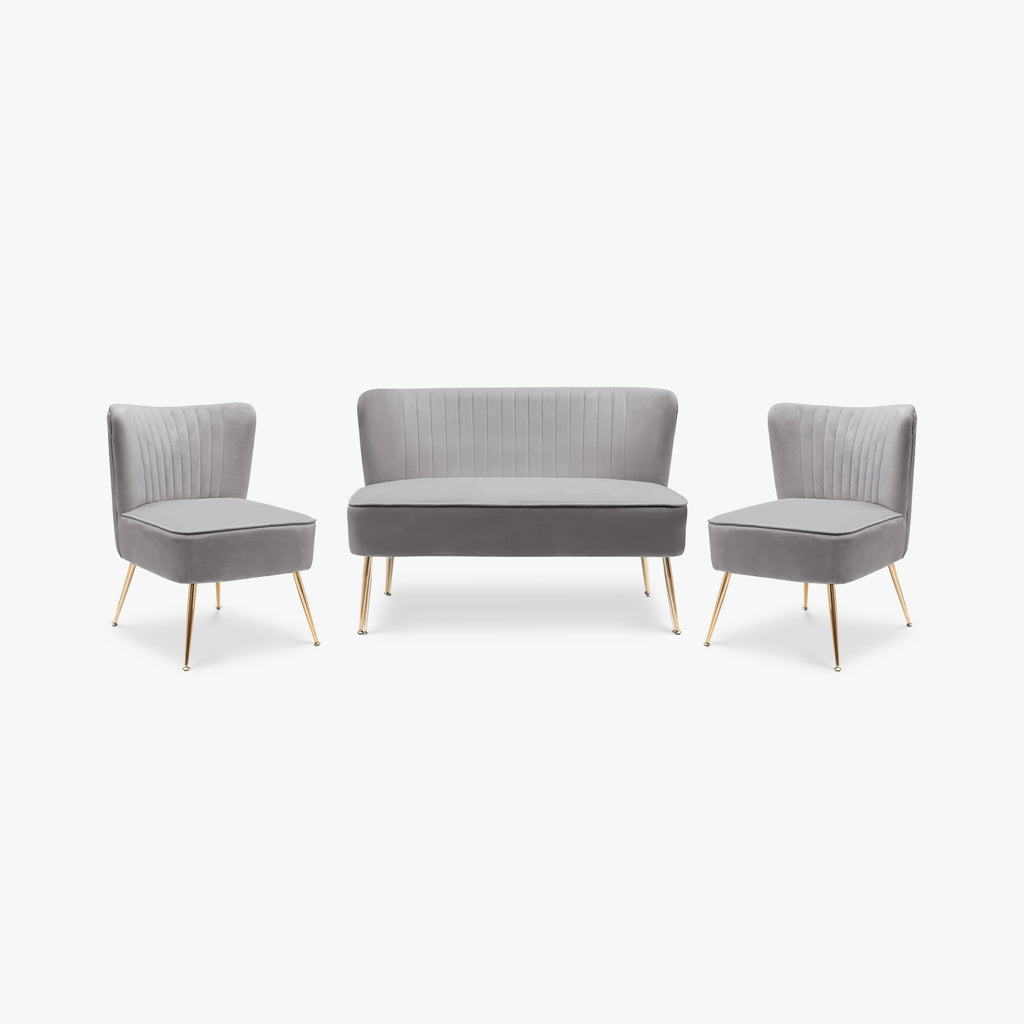 This sophisticated 3-piece living room ensemble presents a contemporary loveseat and accent chairs meticulously designed for compact living spaces or apartments. The loveseat spans 46 inches in width, while the accent chair offers a generous 22-inch width, providing ample seating area. Displaying an armless configuration, the set is adorned with a sleek velvet fabric upholstery, evoking an air of sophistication. Assuring utmost comfort, it features high-density foam seats and sinuous springs and elastic bands that uphold the cushions' shape. Constructed from a durable solid rubberwood, it showcases retro-inspired, gold-finished flared metal legs, adding a touch of refinement. Ideal for curating a comfortable and chic living ambiance.