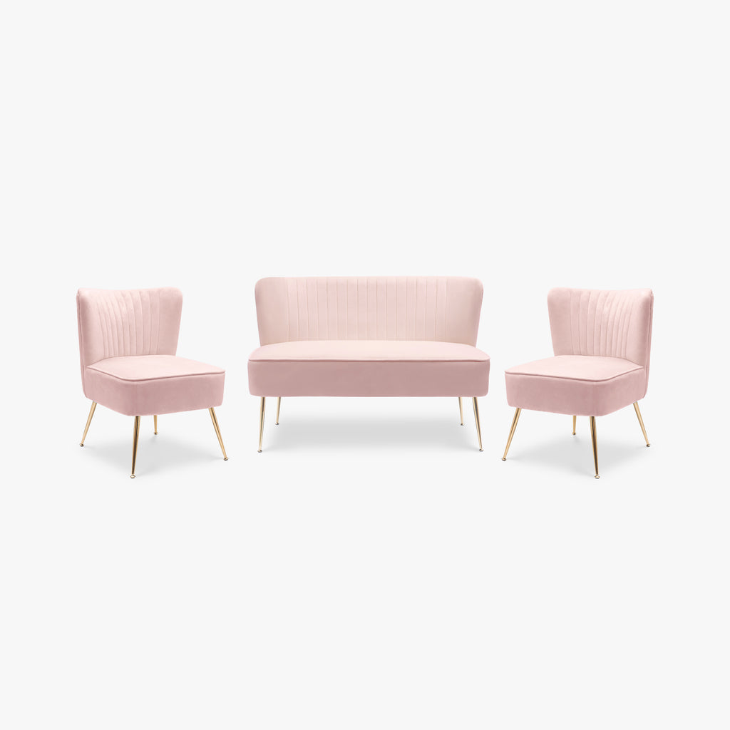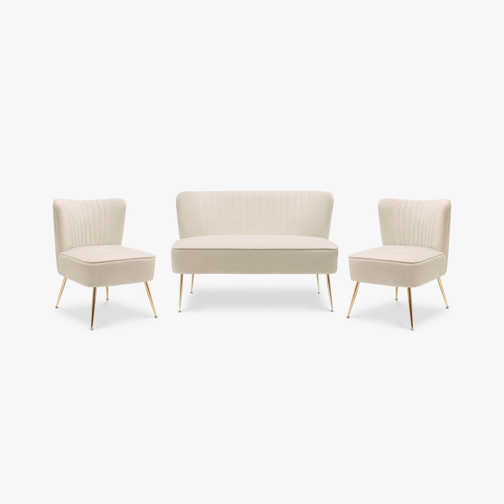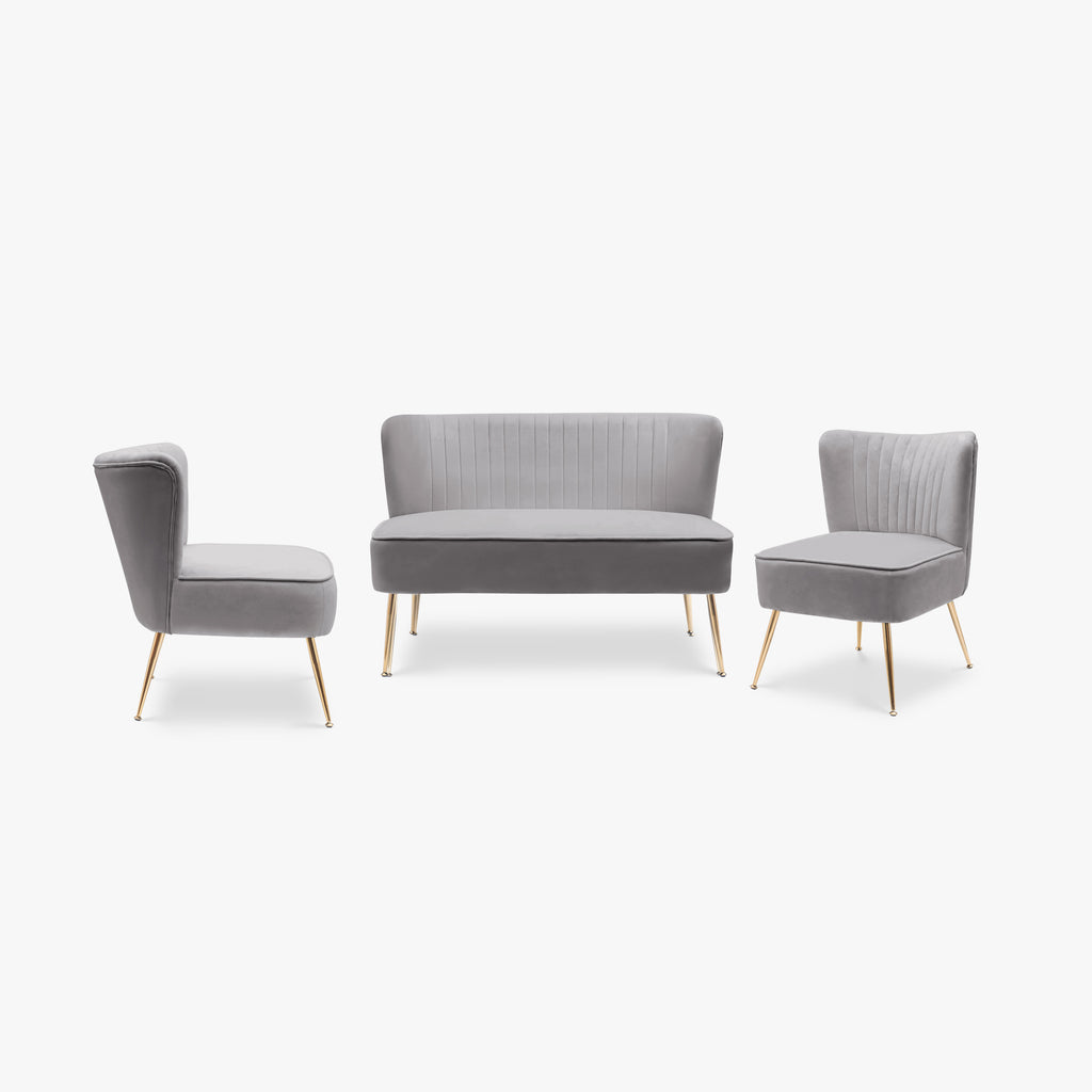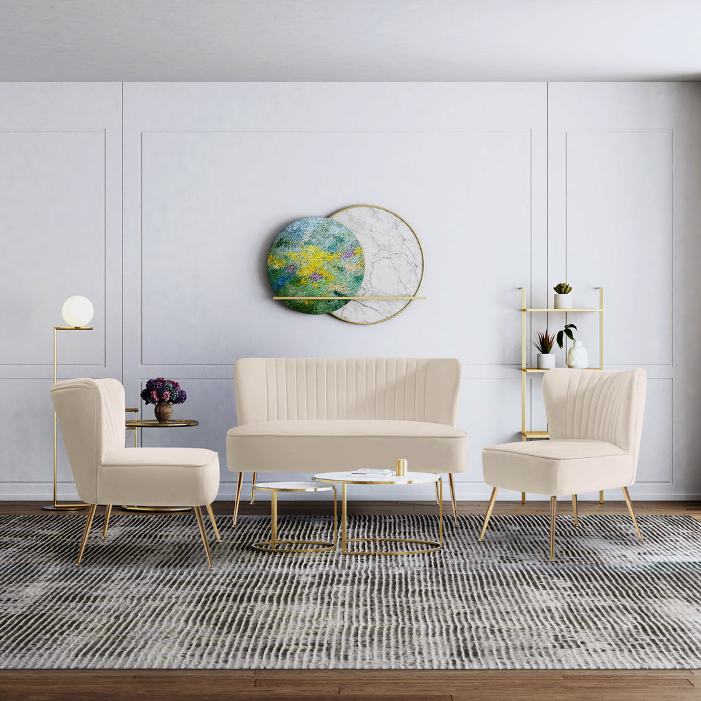 This sophisticated 3-piece living room ensemble presents a contemporary loveseat and accent chairs meticulously designed for compact living spaces or apartments. The loveseat spans 46 inches in width, while the accent chair offers a generous 22-inch width, providing ample seating area. Displaying an armless configuration, the set is adorned with a sleek velvet fabric upholstery, evoking an air of sophistication. Assuring utmost comfort, it features high-density foam seats and sinuous springs and elastic bands that uphold the cushions' shape. Constructed from a durable solid rubberwood, it showcases retro-inspired, gold-finished flared metal legs, adding a touch of refinement. Ideal for curating a comfortable and chic living ambiance.