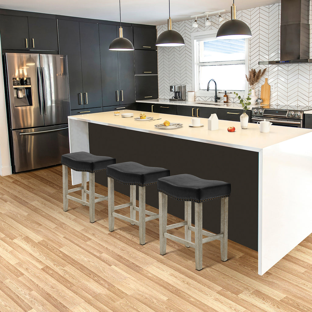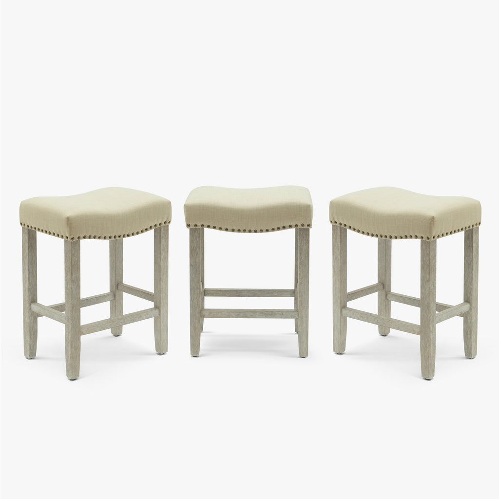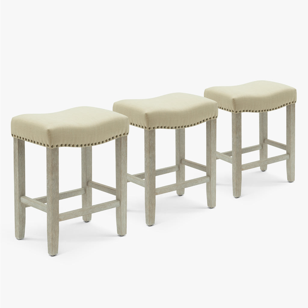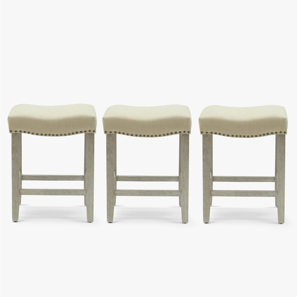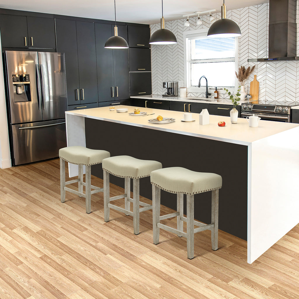 Enjoy a refreshing update to your home bar with this modern farmhouse 24" counter height barstool. The saddle-style seat delivers stylish comfort for your kitchen or bar area. Boasting a backless design and a convenient footrest for added comfort. Upholstered seat with a foam-filled cushioning and a subtle bronze nail head trim detailing for a modern touch on a traditional silhouette.