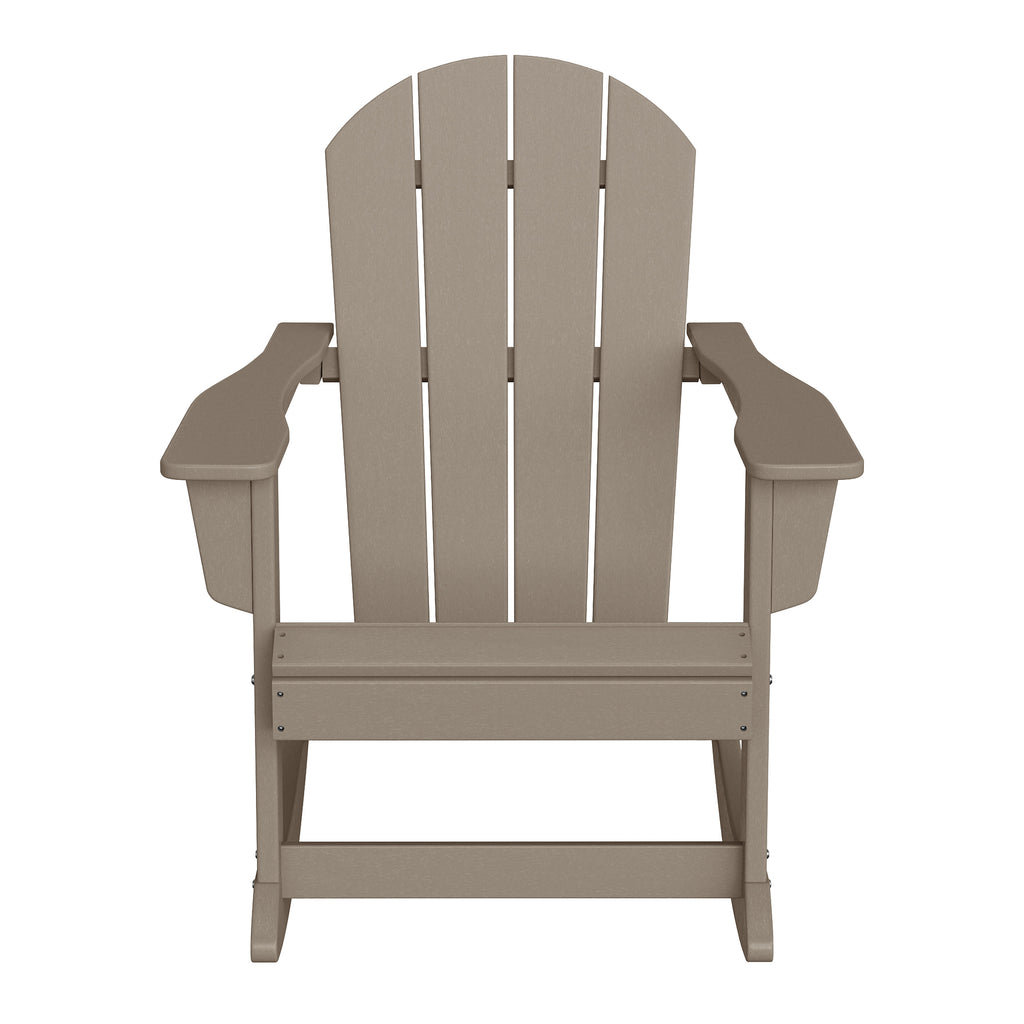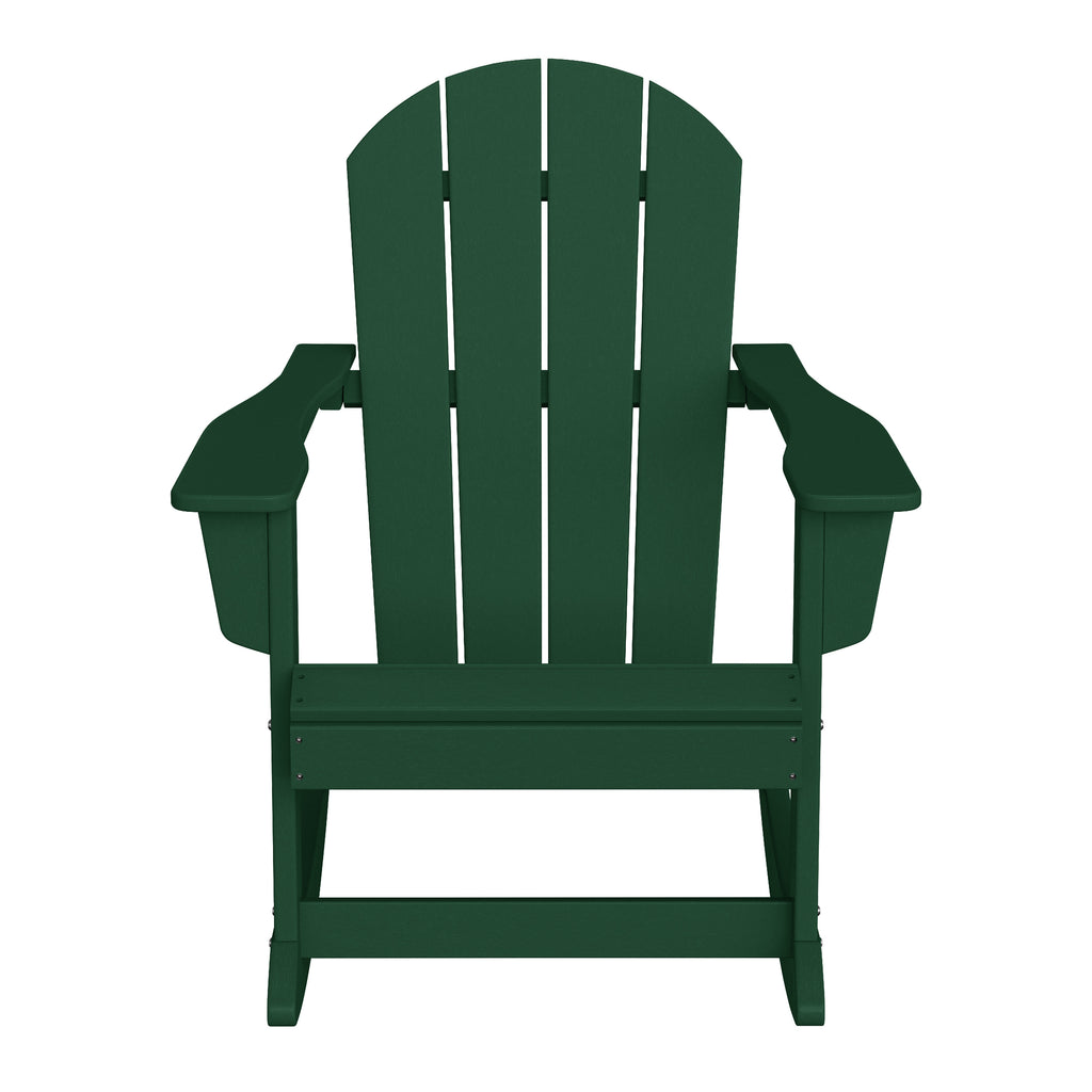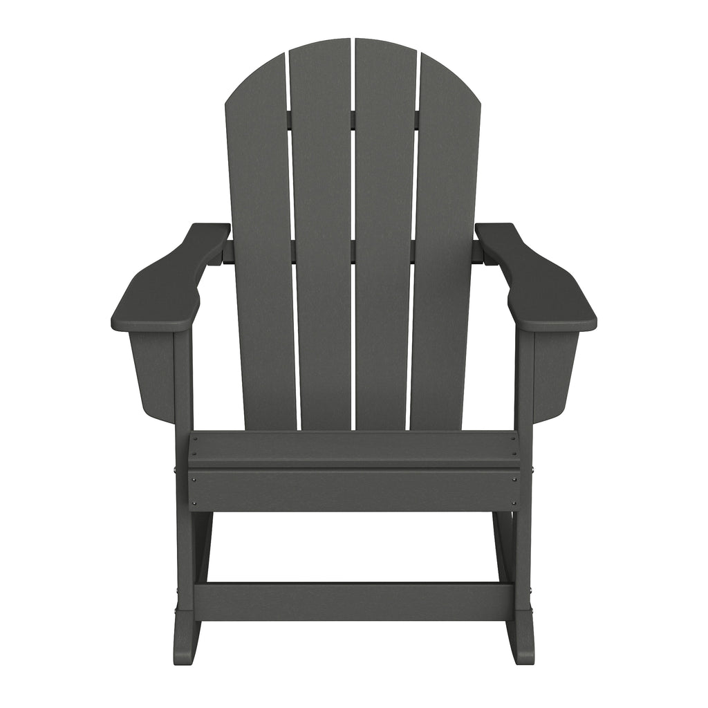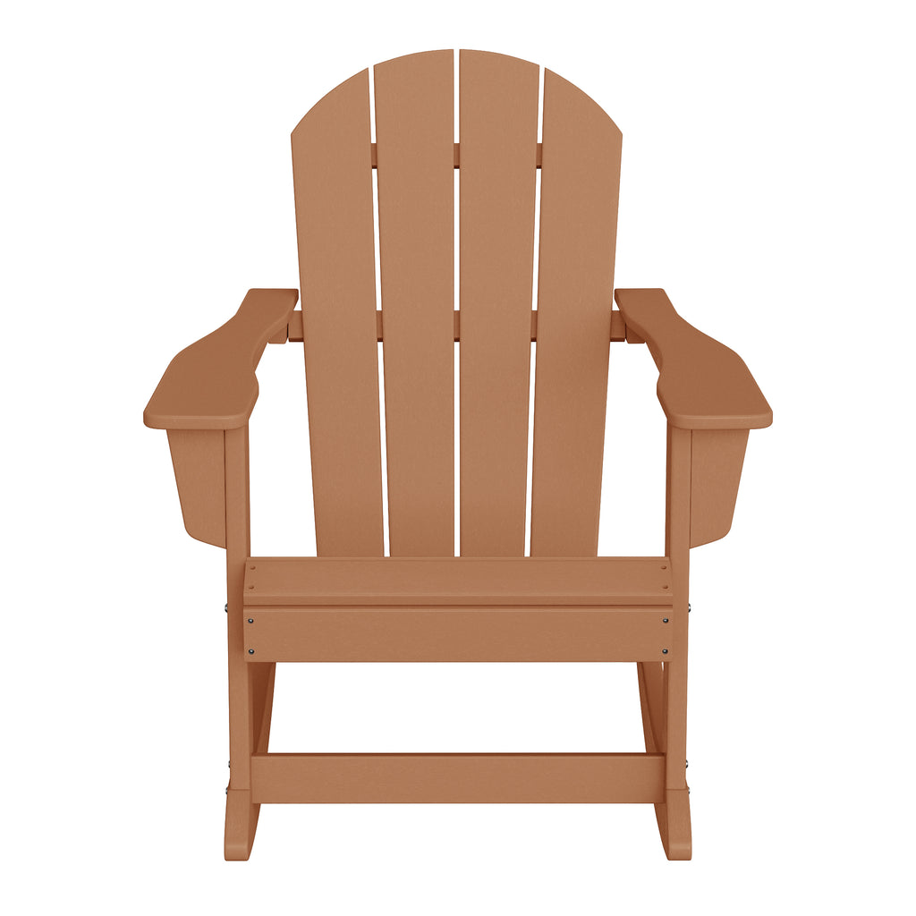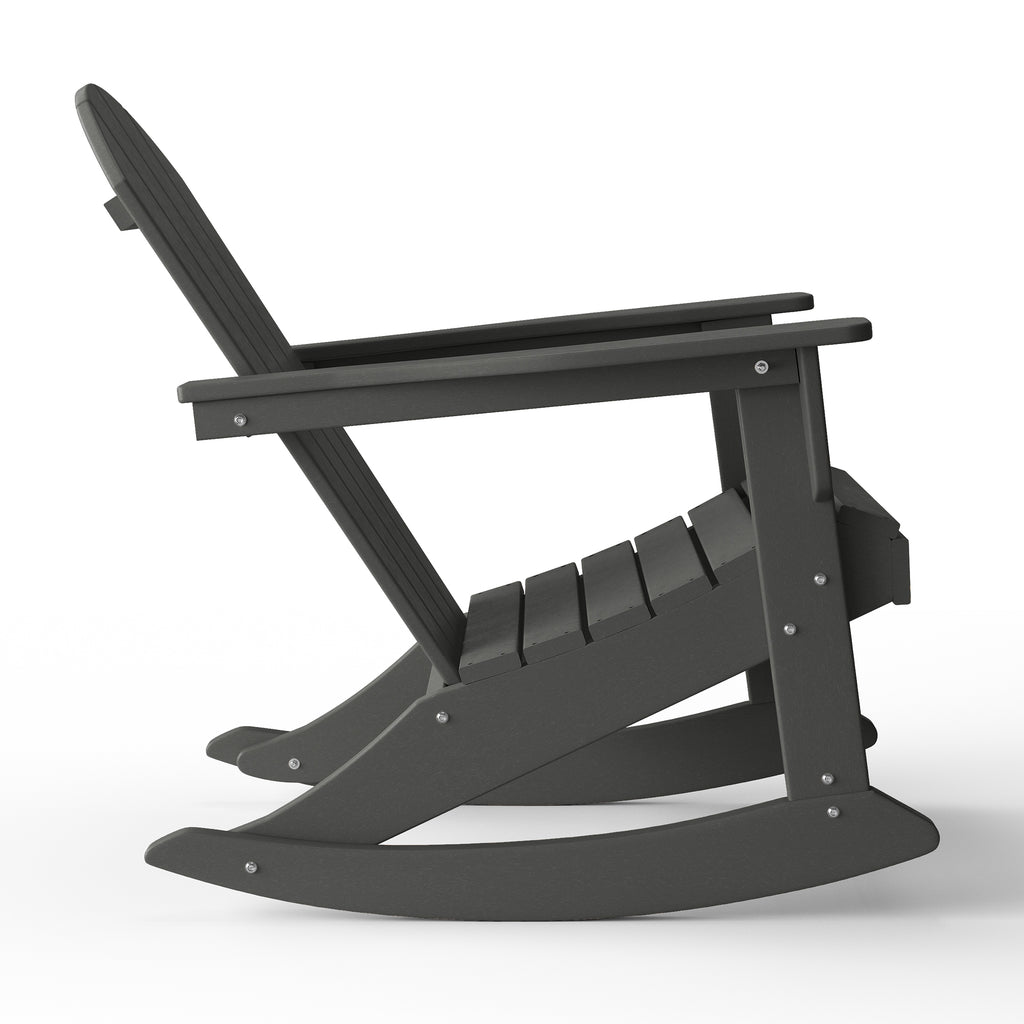 - Set Includes: Two (2) Adirondack rocking chairs, One (1) side table