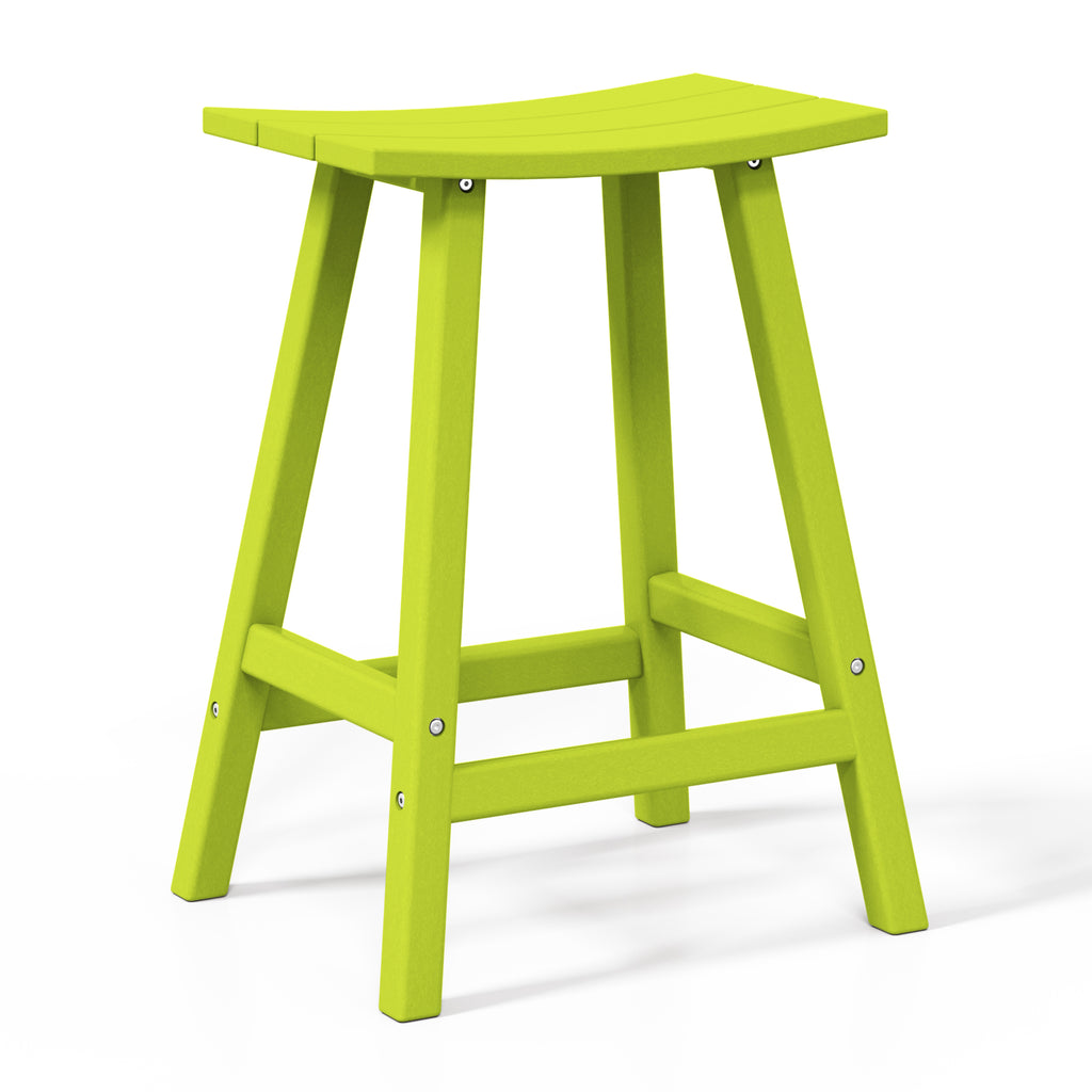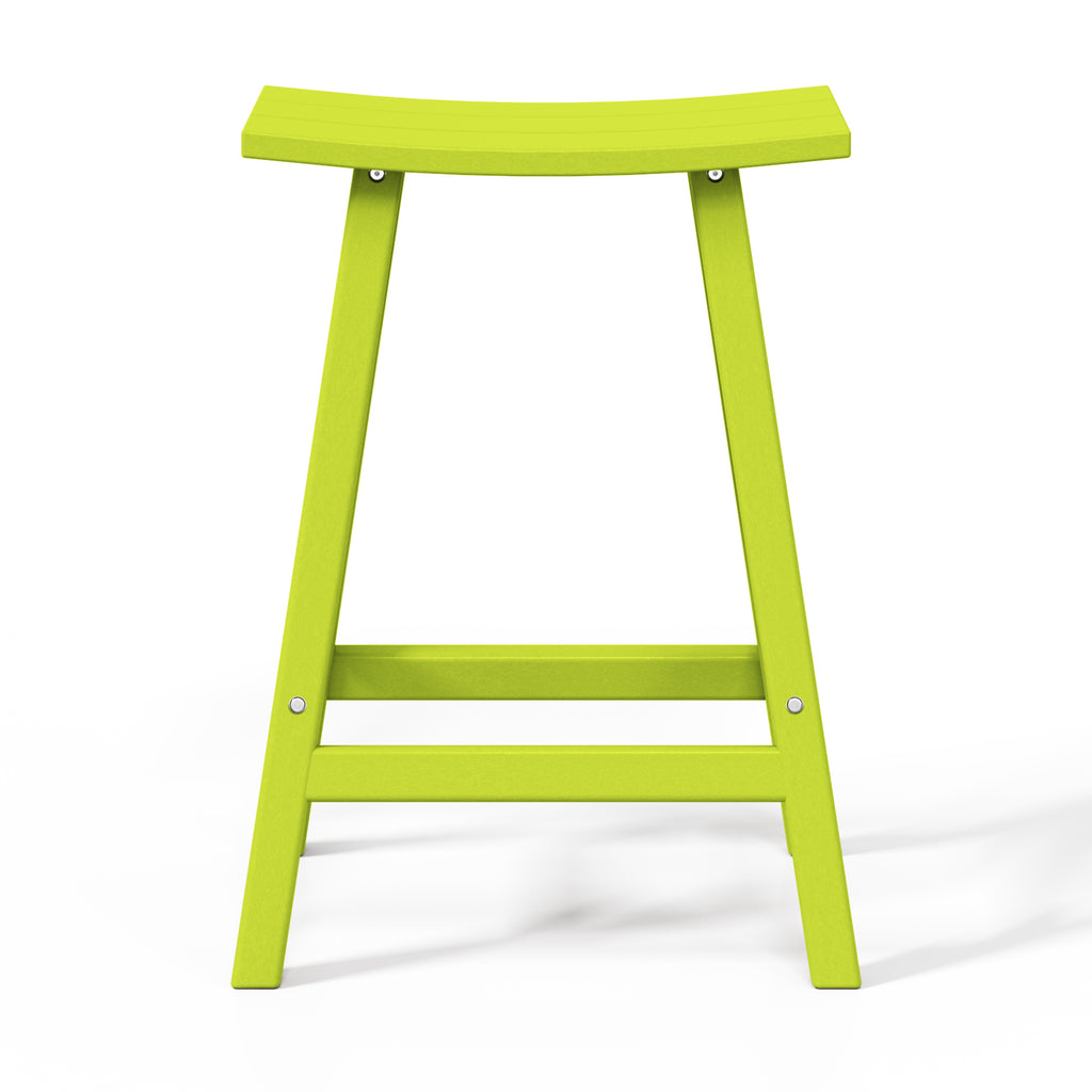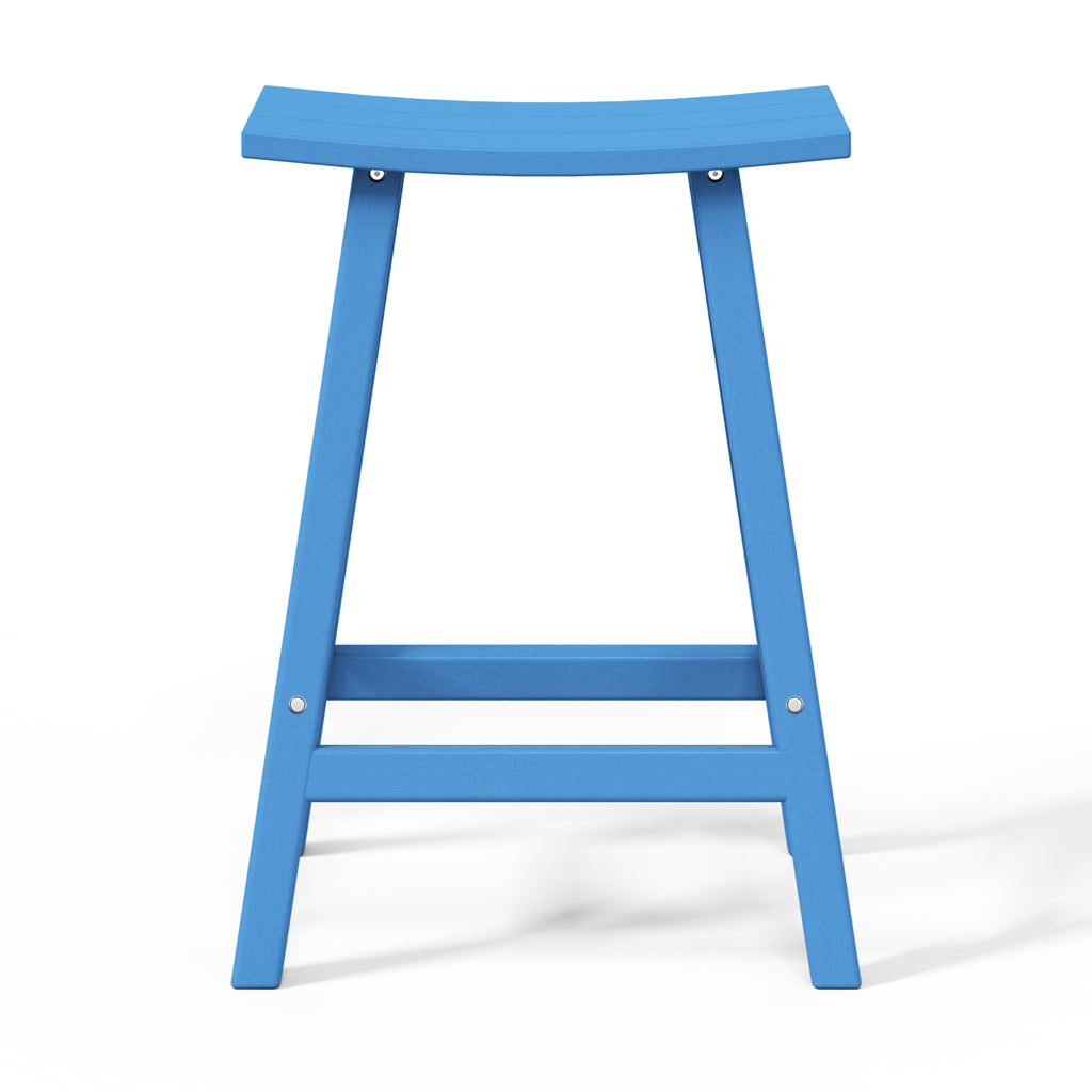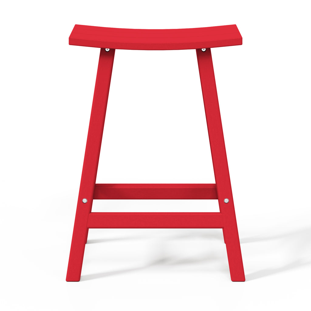 Comfort and style combined into this 24" Inch Outdoor Patio Bar Stool. The stool features solid HDPE construction that is made for daily outdoor use. UV and weather-resistant materials help keep its vibrant shine for many years of use. This outdoor bar stool is a great way to add convenient seating to the kitchen, home bar, den, outdoor patio and more. This set of bar stools is designed to add a classic style to your home or outdoor living space. Combines perfectly with other Adirondack style furniture to help complete your outdoor set up. Saddle slatted seats will bring an elegant and comfortable style to any patio bar area. The UV and weather resistant material make them able to last from season to season. fade-resistant to help keep its true color. Comfortable footrest and wide seating. A classic Adirondack Backless Barstools provide stylish comfort that is perfect for your backyard bar or lounge. Available in easy to match colors. Slide them up to a Patio bar or use at a kitchen counter.