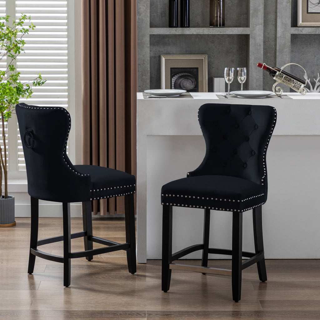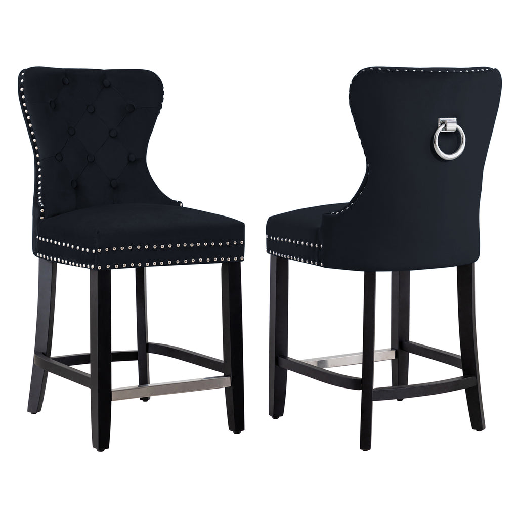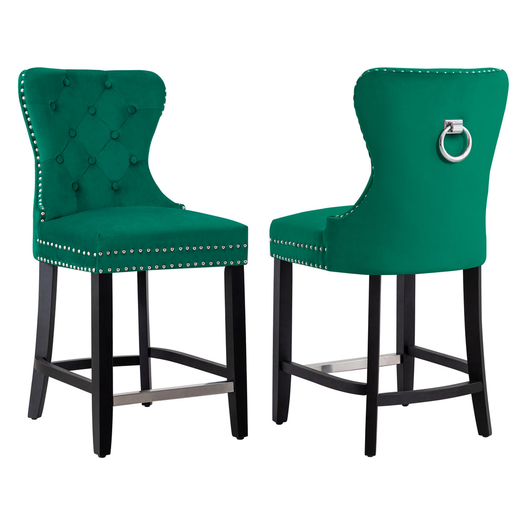Glam up your counter space with a set of two 24" velvet button-tufted stools. The wingback design and dazzling nailhead trim bring beauty and artistic flair to any dining space. For optimum sitting comfort, place your feet on the silver-plated footrest. The sturdy black rubberwood legs make these armless stools durable and comfortable. The ornamental ring will add a touch of style to your unique décor.