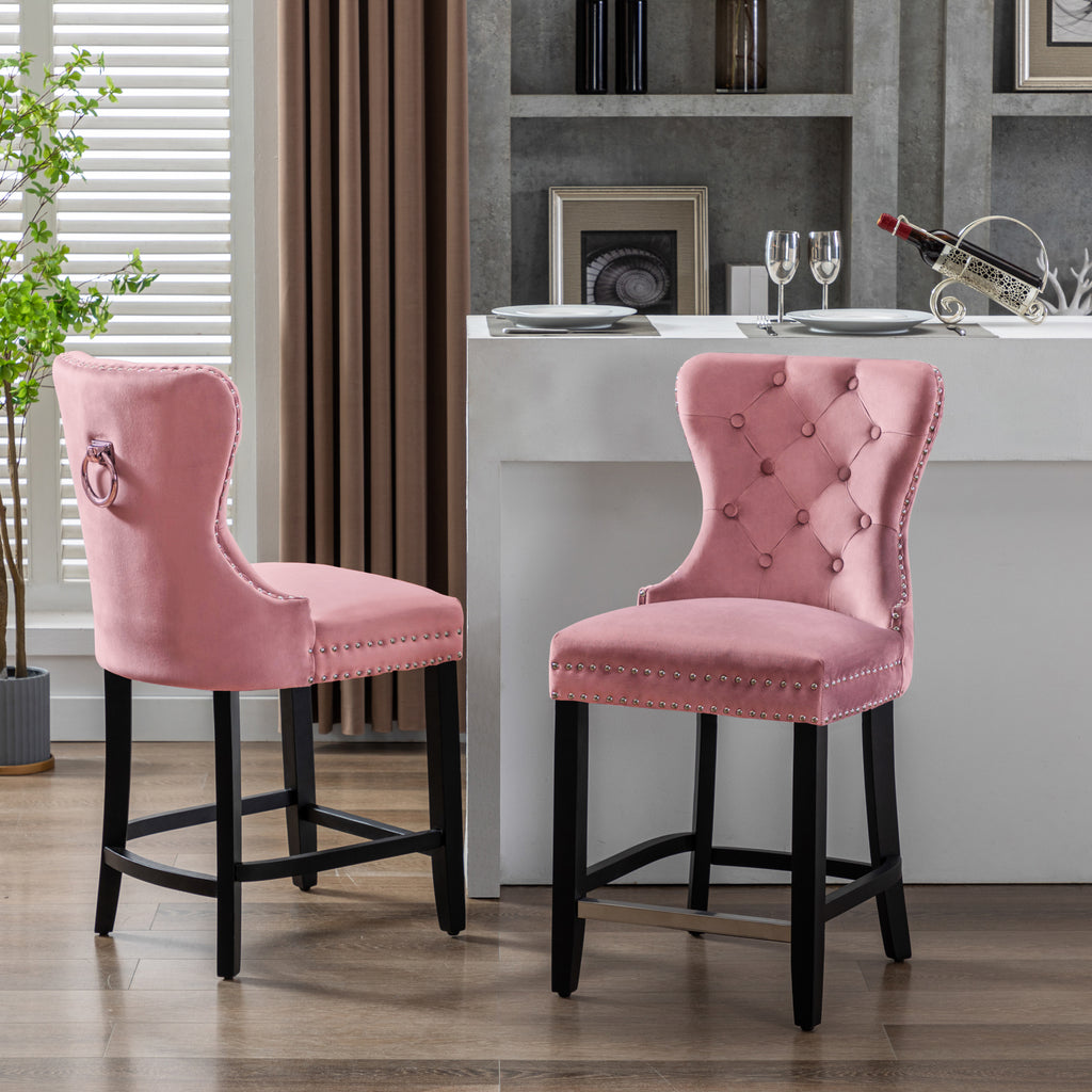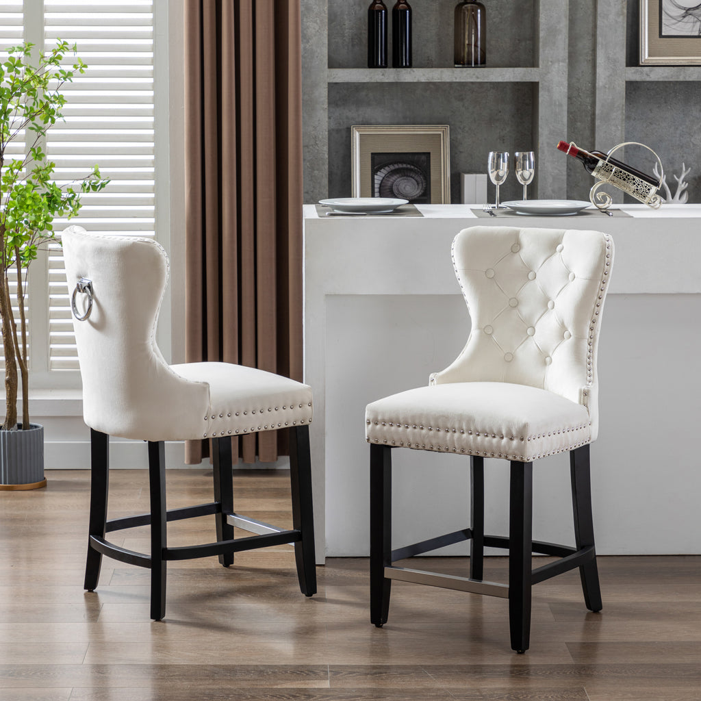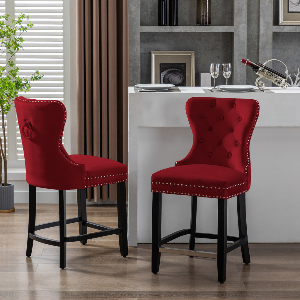 Glam up your counter space with a set of two 24" velvet button-tufted stools. The wingback design and dazzling nailhead trim bring beauty and artistic flair to any dining space. For optimum sitting comfort, place your feet on the silver-plated footrest. The sturdy black rubberwood legs make these armless stools durable and comfortable. The ornamental ring will add a touch of style to your unique décor.