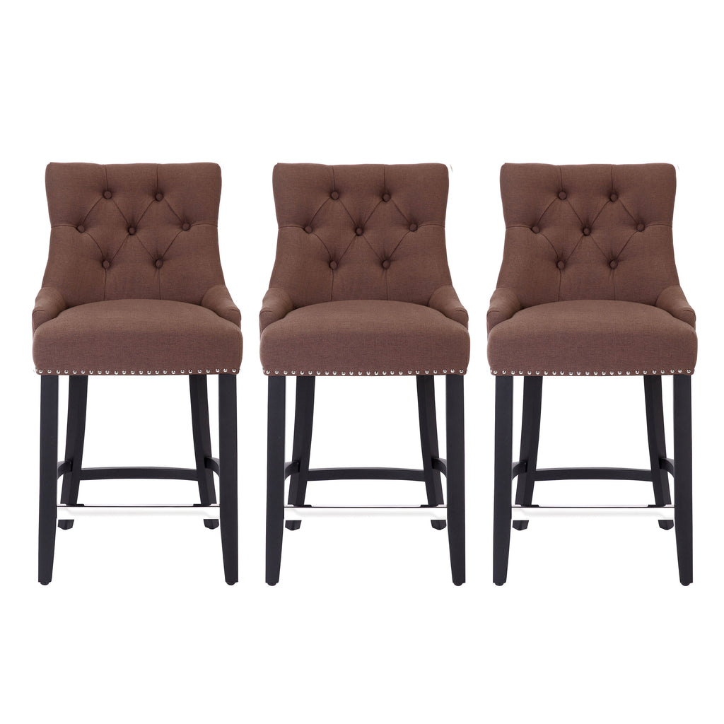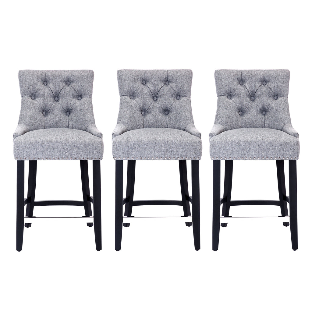Make your kitchen island stand out and turn into a place of elegance with this beautiful set of three 24-inch fabric upholstered counter stools. Featuring dense foam padding, sinuous spring support, and soft polyester/linen fabric upholstery. The diamond button-tufted pattern, polished silver nailhead trim, and sleek curves add a vintage aesthetic. The black solid rubberwood legs complement various types of interior decor styles, and the front footrest can be protected with an optional silver metal footrest cover that protects and adds a modern style to the footrest.