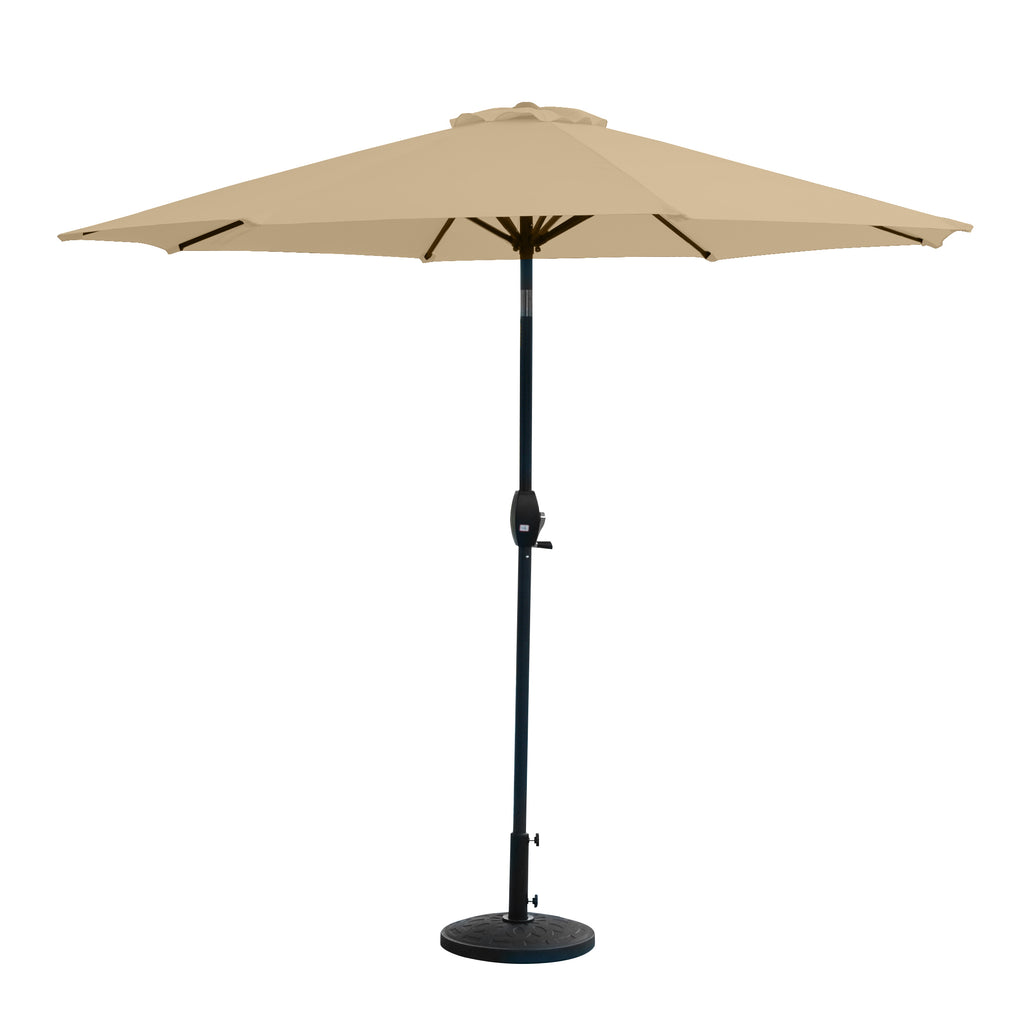 Sit under the shade this season with this simple and amazing market umbrella. The water resistant vented polyester canopy is perfect for blocking the bright sun and with the vented design it cools down the umbrella and prevents the wind from taking your umbrella. The canopy is supported by a strong steel frame and a rust-resistant metal pole with a 1.5" diameter, ensuring that the umbrella never loses its strength. Lift the umbrella with a simple hand crank and use the push button to tilt the umbrella to block the sun when it starts to set. No need to find the perfect umbrella base that fits your umbrella, the umbrella comes with a durable concrete base that is wrapped in resin that keeps the umbrella sturdy.