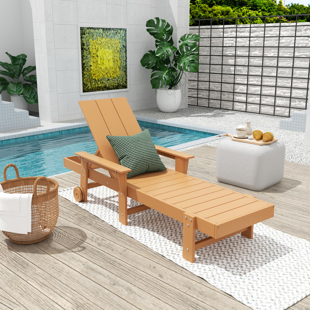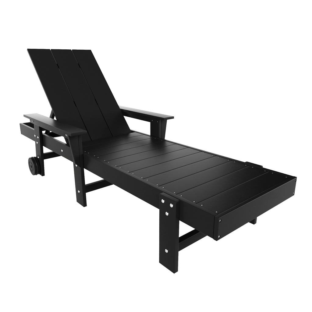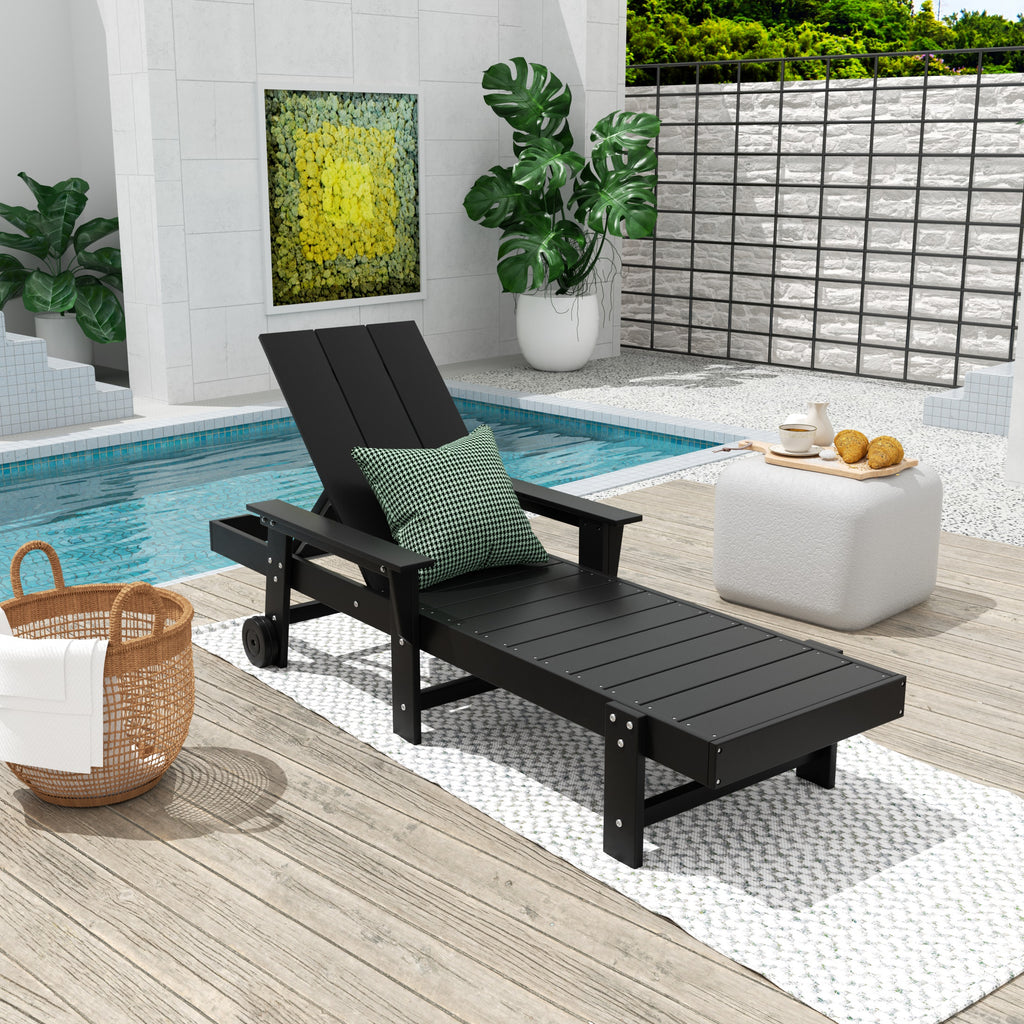 Lounge back and relax this summer with our charming Chaise Lounger with Arms and Wheels. Relax by the pool this season in style with the modern Adirondack backrest that is easy to adjust, so you can sit up, lay your arms on the armrest and read a book, or lay back and catch a tan. Made with a durable, eco-friendly HDPE material that is resistant to the harsh UV rays and has fade-resistant coloring, so you can keep your lounger looking great all season. If you need to move the lounger from storage or just need some more shade, simply pick up the lounger from the front and move to wherever you need with the helpful wheels that make moving it an ease. This lounger is sure to make your summer more relaxing and comfortable.