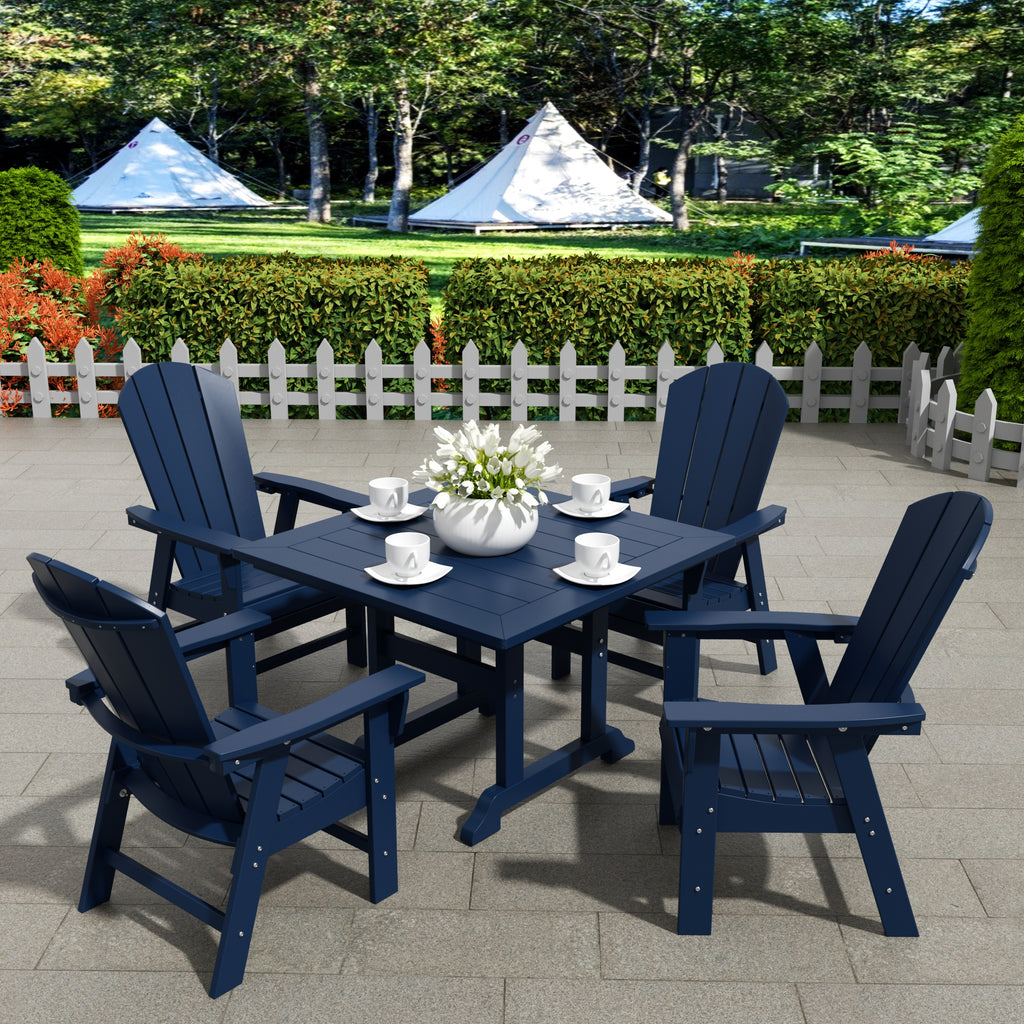 Impress your loved ones at your next outdoor family dinner with the 5-Piece outdoor dining set. This all-weather set seats up to four and features curved-back dining chairs with the look of Adirondack design. With a durable and spacious square dining table, this set is perfect for casual outdoor dining. Created with HDPE material adds durability and can withstand the outdoor elements thanks to the HDPE's natural UV and weather resistant. The dining table and chair are made to look like natural wood without any of the disadvantages of natural wood, meaning that this outdoor dining set isn't prone to splinters, cracks, or peeling.