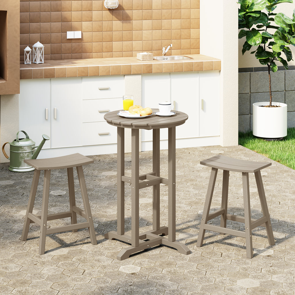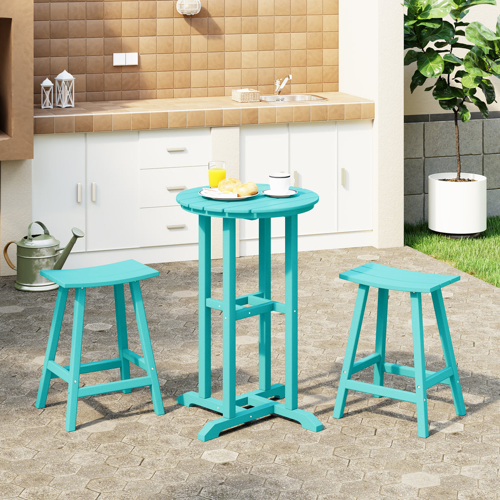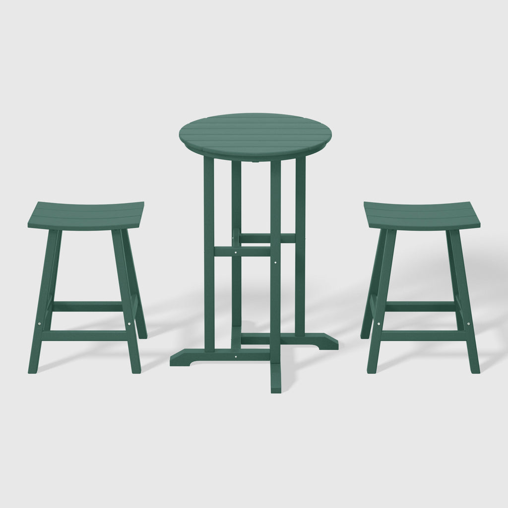 Elevate your outdoor haven with our exclusive patio furniture set—a refined ensemble featuring a distinguished 37" counter-height bistro bar table and two exquisite 24" counter-height bar stools, seamlessly blending style and opulent comfort. Immerse yourself in a palette of alluring, fade-resistant colors meticulously crafted from resilient HDPE material. This enchanting material not only boasts UV resistance but acts as a shield against the relentless sun, ensuring enduring magnificence. Bid farewell to concerns about splintering, cracking, chipping, or peeling—our HDPE stands as a testament to enduring luxury, requiring no painting, staining, or waterproofing. From the sumptuous saddle-style seats providing an extra layer of comfort to the robust leg design on the bistro table for added stability, this set is meticulously designed to elevate your outdoor experience. Let us redefine your outdoor patio—a space where family and furniture seamlessly unite in absolute splendor!