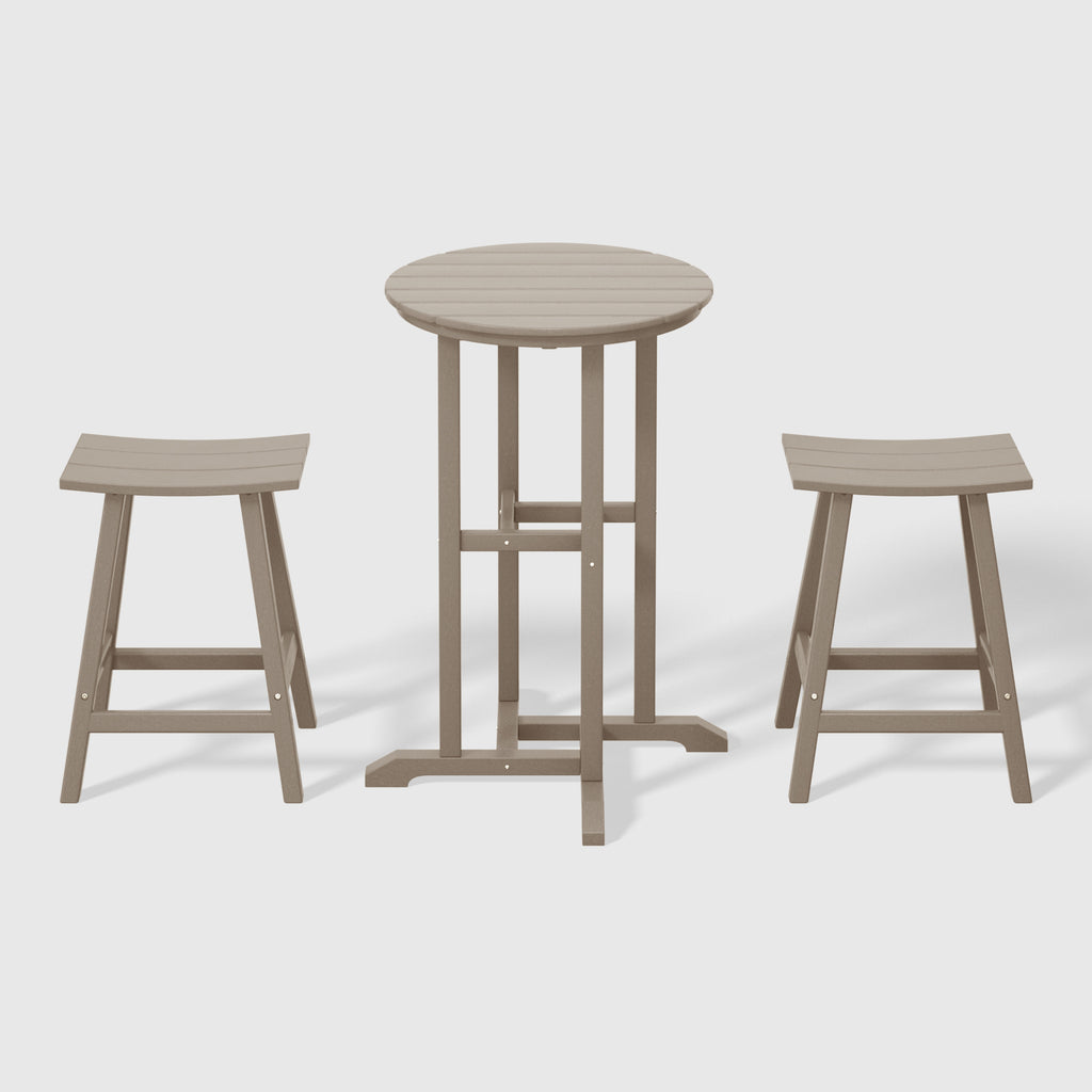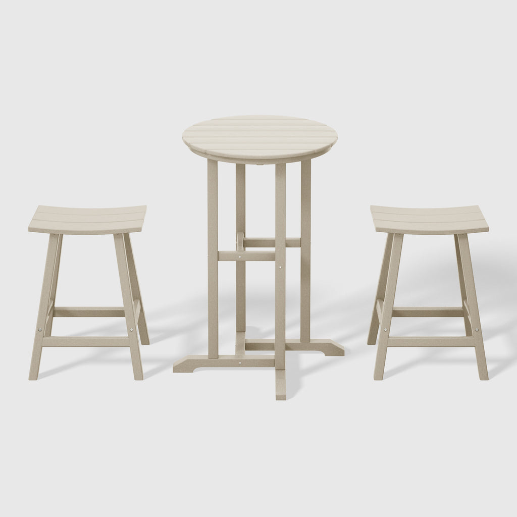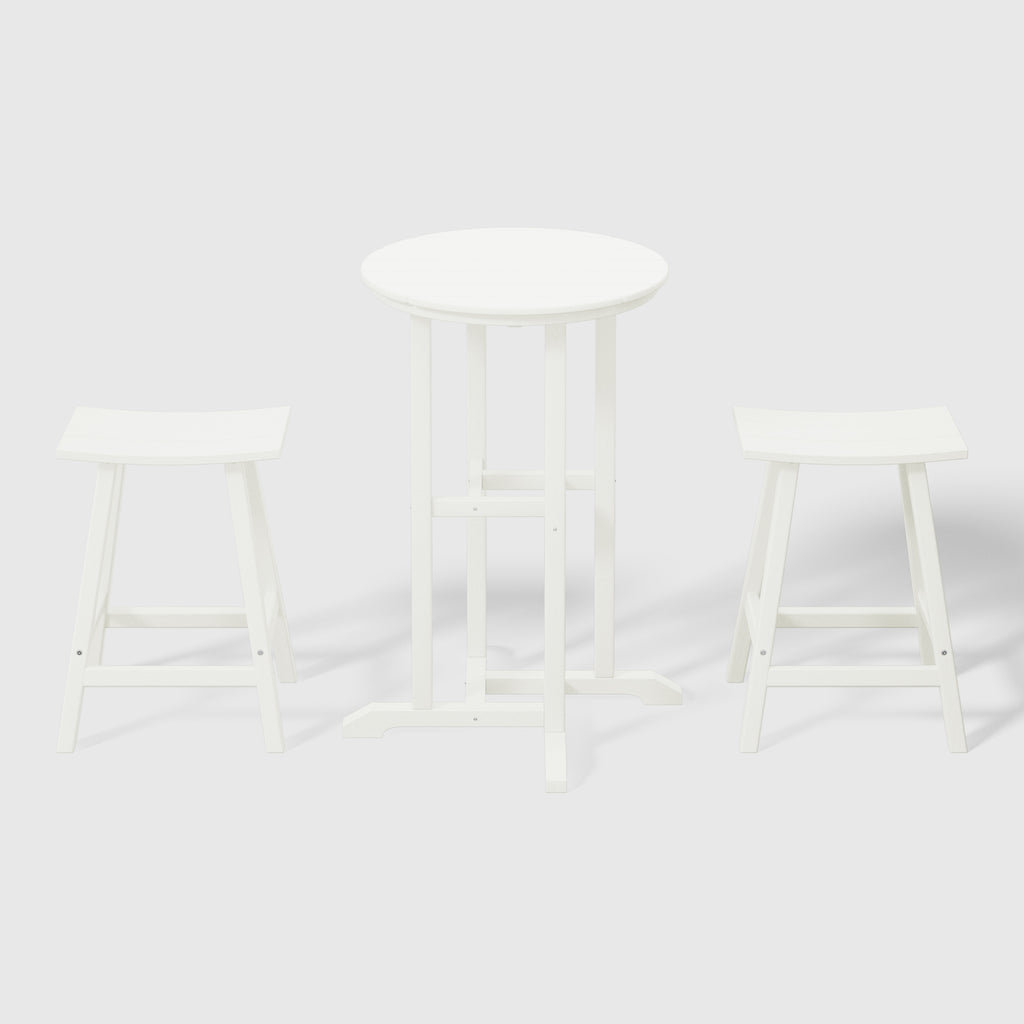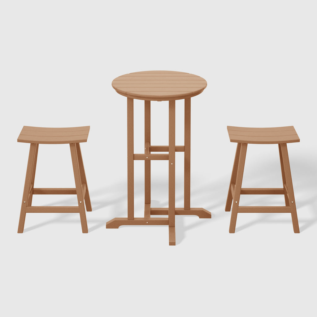 Elevate your outdoor haven with our exclusive patio furniture set—a refined ensemble featuring a distinguished 37" counter-height bistro bar table and two exquisite 24" counter-height bar stools, seamlessly blending style and opulent comfort. Immerse yourself in a palette of alluring, fade-resistant colors meticulously crafted from resilient HDPE material. This enchanting material not only boasts UV resistance but acts as a shield against the relentless sun, ensuring enduring magnificence. Bid farewell to concerns about splintering, cracking, chipping, or peeling—our HDPE stands as a testament to enduring luxury, requiring no painting, staining, or waterproofing. From the sumptuous saddle-style seats providing an extra layer of comfort to the robust leg design on the bistro table for added stability, this set is meticulously designed to elevate your outdoor experience. Let us redefine your outdoor patio—a space where family and furniture seamlessly unite in absolute splendor!