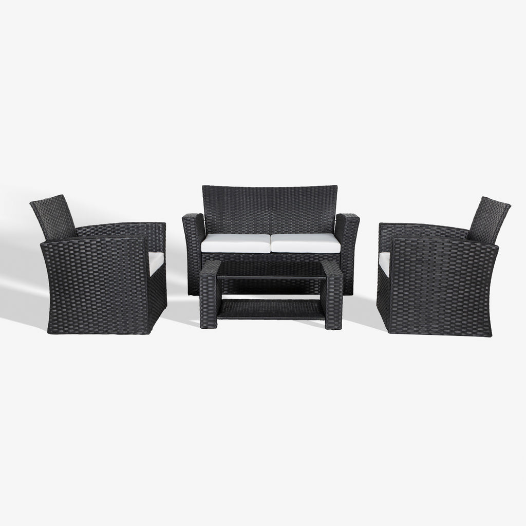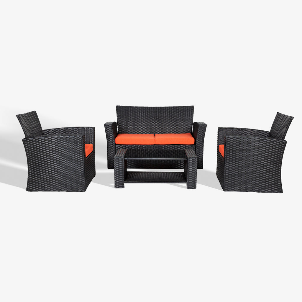 Lounging by the pool, patio, or balcony, no matter where you are, this patio set is sure to be the center piece for your outdoor living space. Each piece is designed with a sturdy steel and rattan wicker frame that can withstand even the worst weather, from windy rain to all-day sunshine. With comfortable cushions, you can spend hours chatting with friends or family while placing your drinks and snacks on the tempered glass coffee table. This cozy 4-piece set is certain to be the gathering of parties and the ideal addition to any outdoor living space.