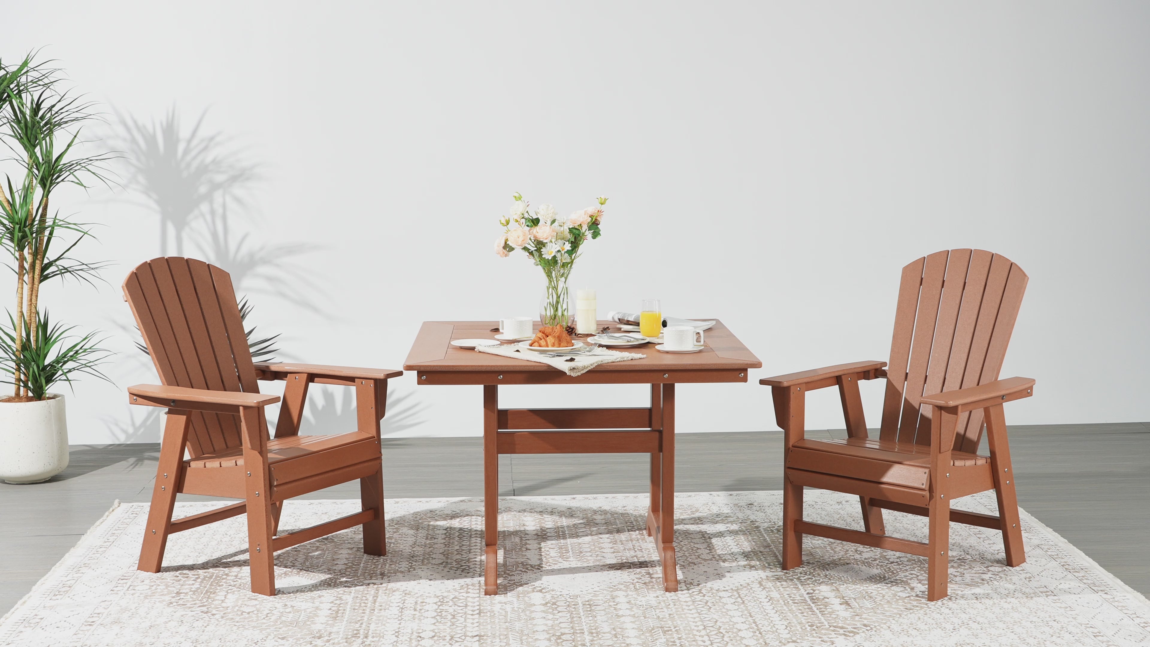 Sit back and relax in the oversized seat of the Adirondack dining chair. The chair’s curved shell-style backrest designed for comfort, this casual all-weather dining chair will bring a touch of laid back beach style to any outdoor space. Created with HDPE material adds durability and can withstand the outdoor elements thanks to the HDPE's natural UV and weather resistant. The dining armchair is made to look like natural wood without any of the disadvantages of natural wood, meaning that this outdoor chair isn't prone to splinters, cracks, or peeling. This dining chair is perfect for the outdoors and will have your home looking great with the semi-gloss finish that is sure to shine.