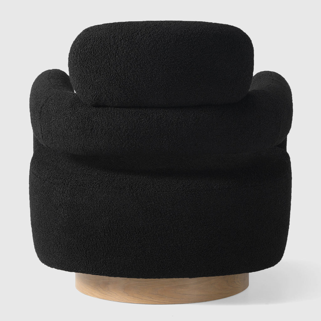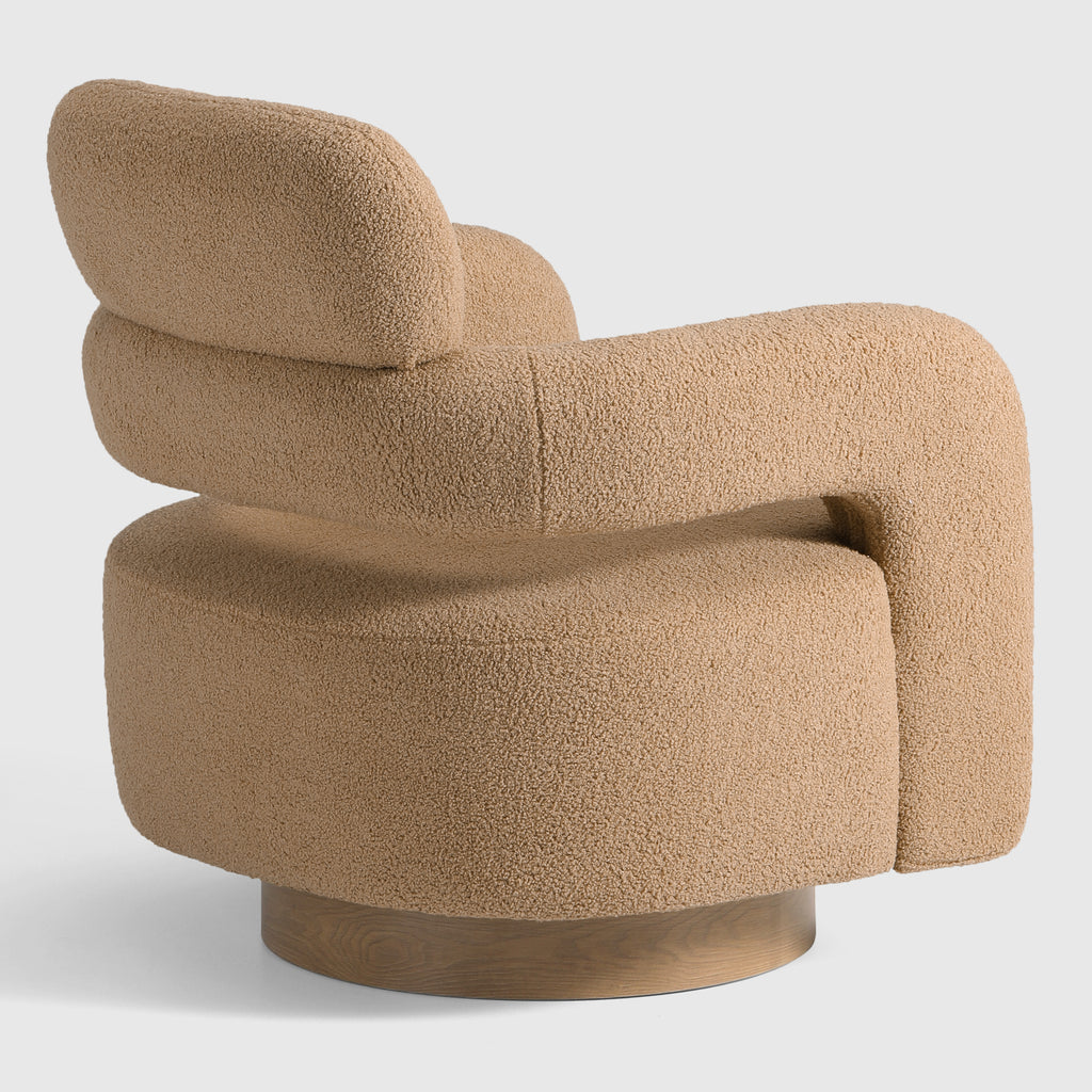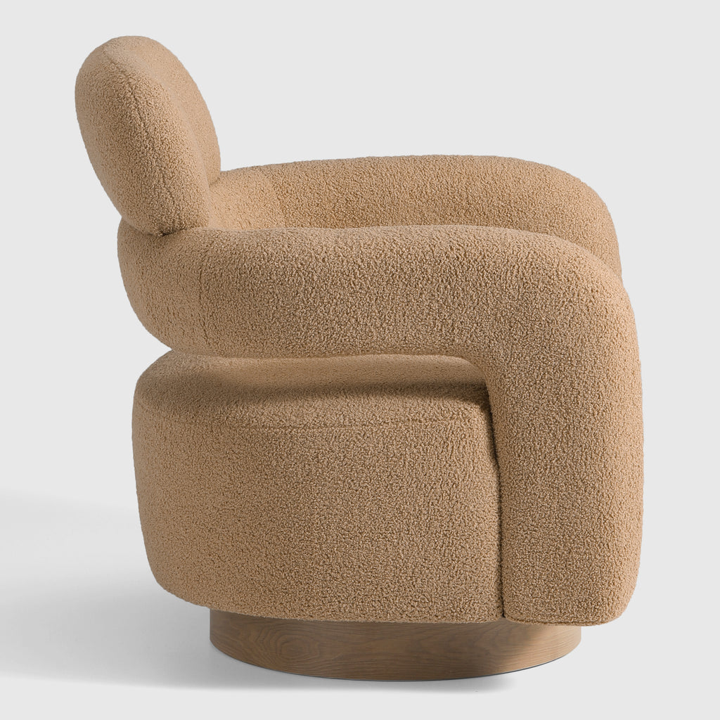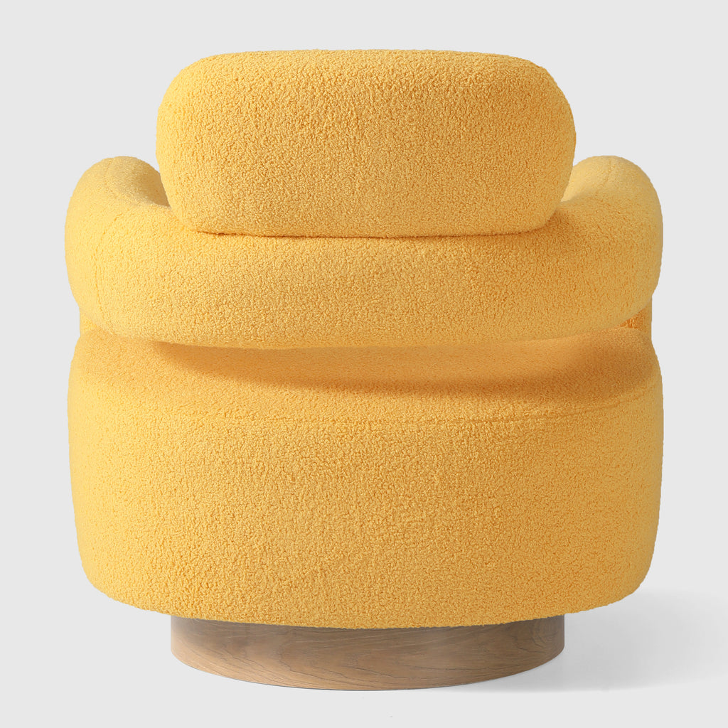 Indulge in the luxurious comfort of our barrel swivel chair. Its curved silhouette and 360° swivel function add a touch of sophistication to your living space. Wrapped in plush, soft teddy fabric upholstery, this round arm and round headrest accent chair exudes a sense of refinement. Crafted with a sturdy plywood frame, sinuous springs, and elastic bands, and filled with high-density foam, this chair is built to last. The swivel round base features a warm, wood-like teak pattern, adding a touch of elegance while maintaining a robust metal construction.