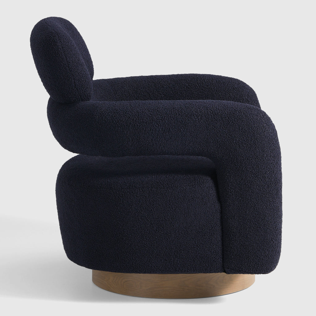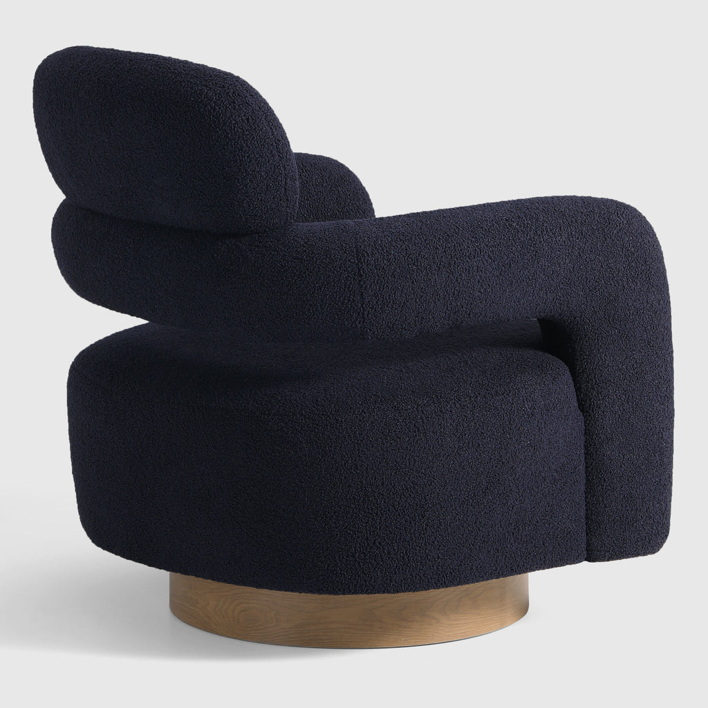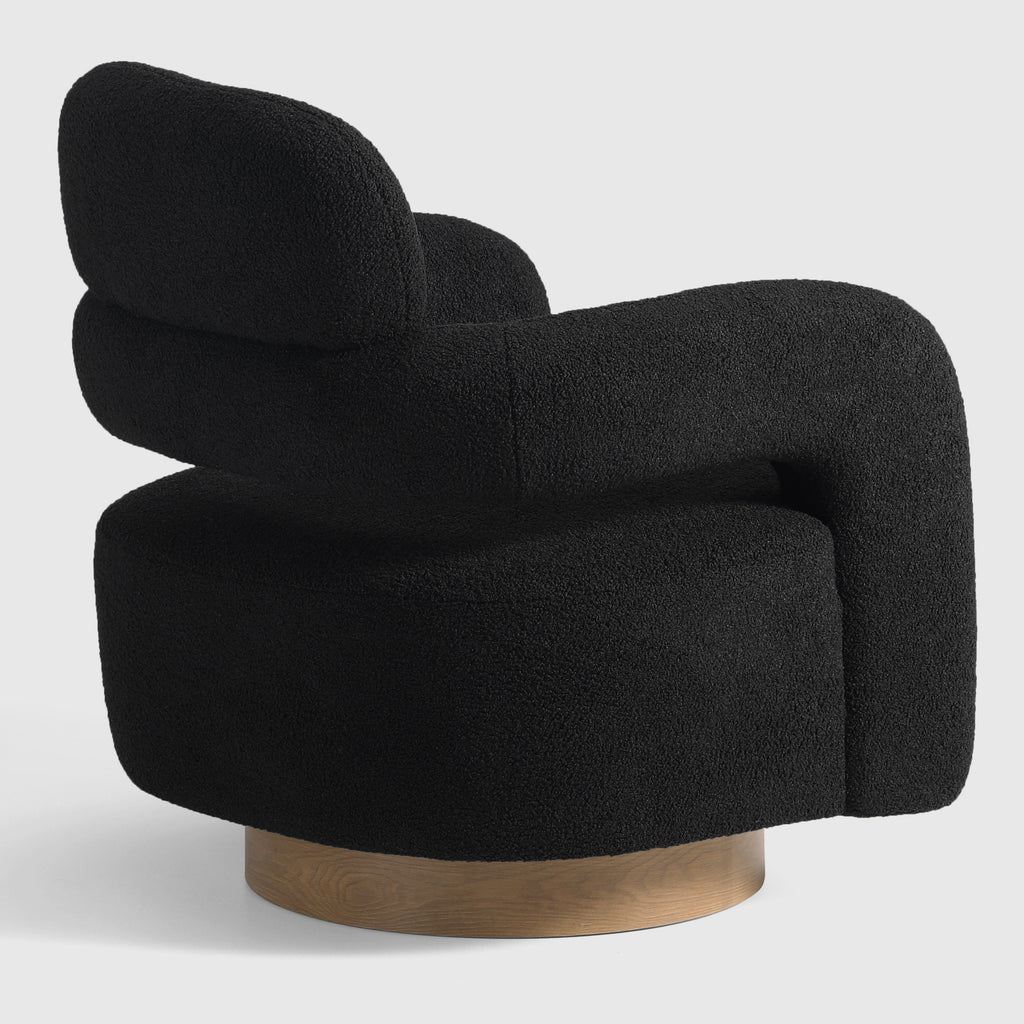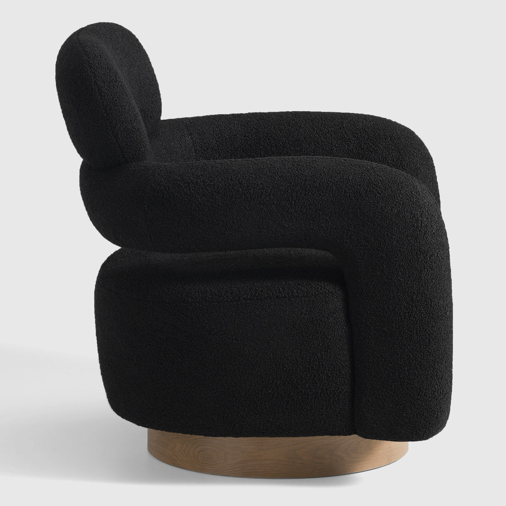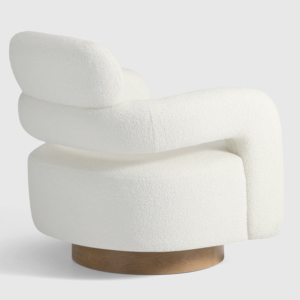 Indulge in the luxurious comfort of our barrel swivel chair. Its curved silhouette and 360° swivel function add a touch of sophistication to your living space. Wrapped in plush, soft teddy fabric upholstery, this round arm and round headrest accent chair exudes a sense of refinement. Crafted with a sturdy plywood frame, sinuous springs, and elastic bands, and filled with high-density foam, this chair is built to last. The swivel round base features a warm, wood-like teak pattern, adding a touch of elegance while maintaining a robust metal construction.