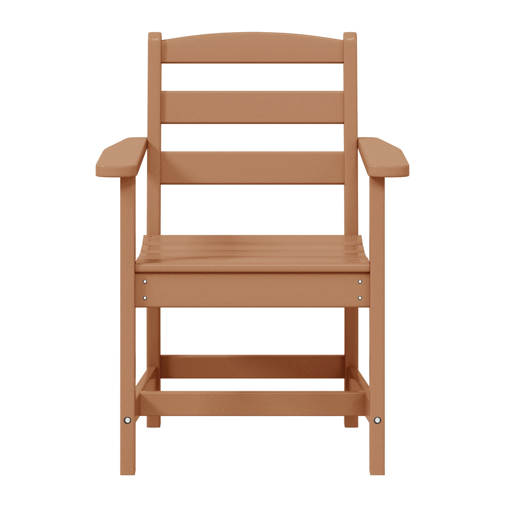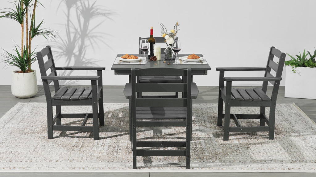 Create a warm and inviting outdoor dining area with our 5-piece HDPE dining set. Made with a durable all-weather HDPE material that is resilient against UV rays and fading, making it the ideal material for the outdoors. Designed for comfort, sturdiness, and functionality from the contoured seats and arched backrest to the durable HDPE-reinforced tabletop construction and the 1.9" built-in umbrella hole that is perfect for adding an umbrella and extra shade during those bright and sunny days.
