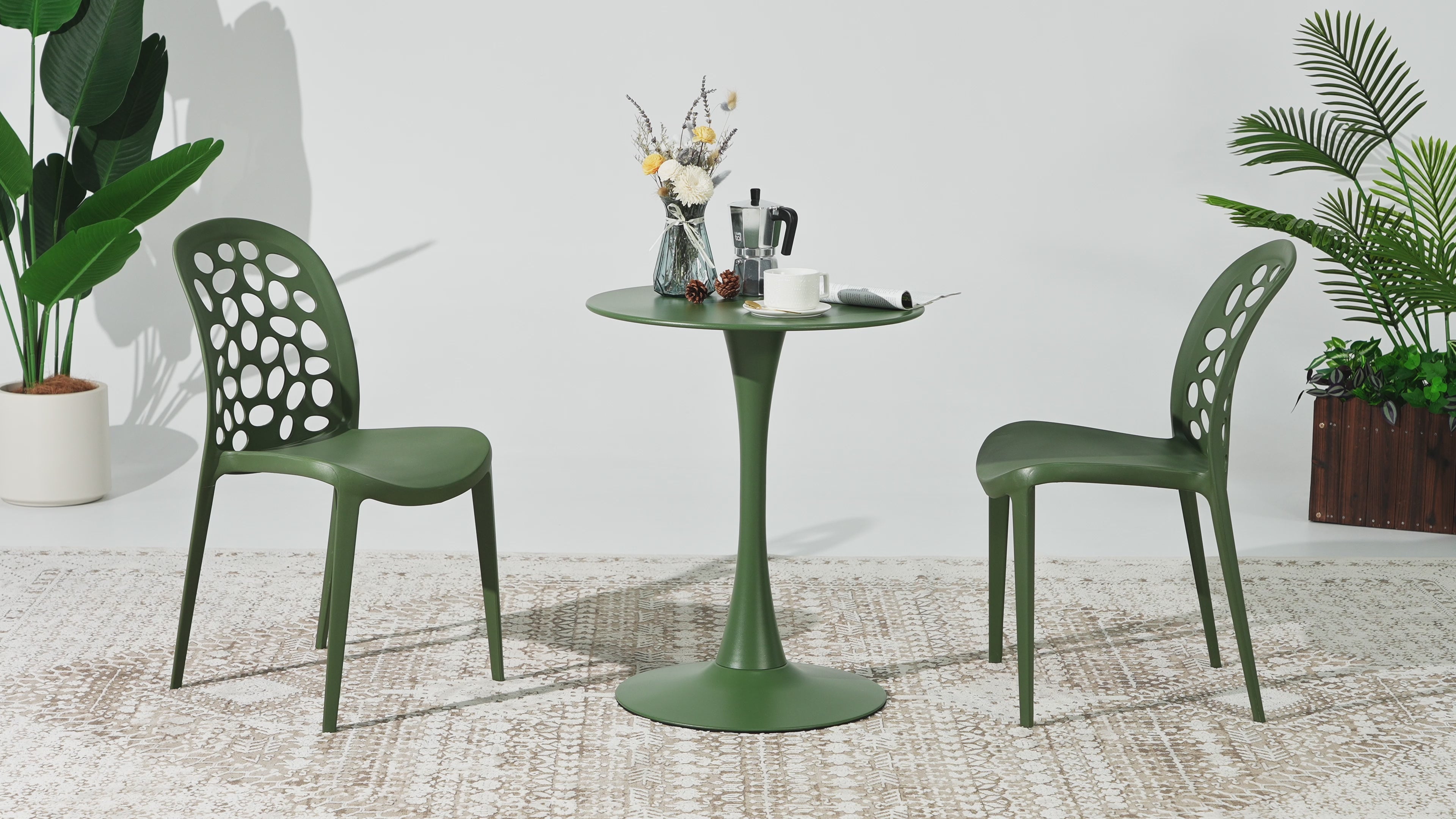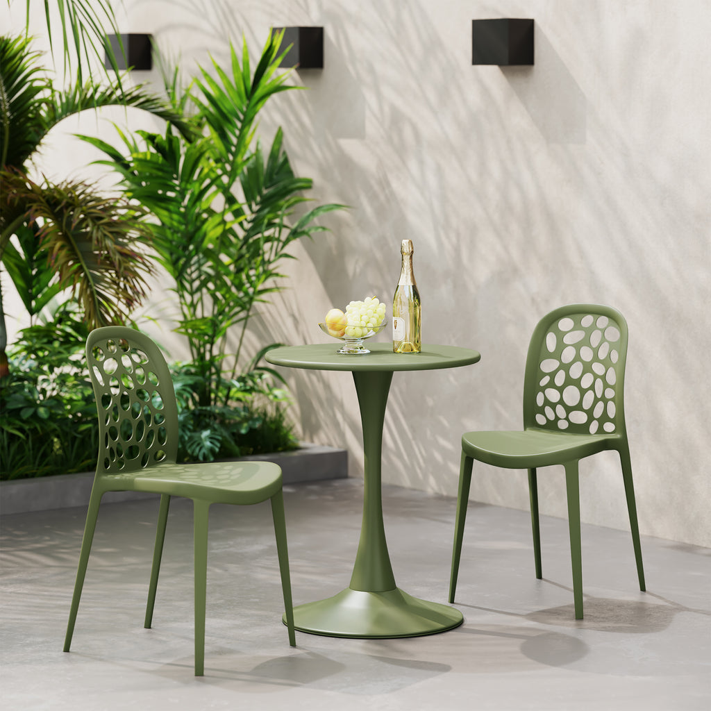 Elevate your outdoor gatherings with this two-person dining table set. The round patio bistro table, crafted from a durable metal, has a rust-resistant e-coating that ensures the longevity of the table and has a wide, flat base to reduce wobbling and promote stability. Complementing the table are two stackable patio chairs, designed for space-conscious living. Made from UV-resistant polypropylene resin, these lightweight chairs allow for effortless rearrangement, adapting to your evolving patio aesthetic. The patio dining chairs are designed with an avant-garde backrest offering a more comfortable design with added charm. The ventilated backrest promotes airflow to keep you cool during those warmer days, and the arched backrest provides optimal comfort while sitting. Enjoy instant gratification with the fully assembled chairs, while the table's assembly allows for quick setup, making it the perfect 3-piece round patio dining table set for 2 for your patio this season.