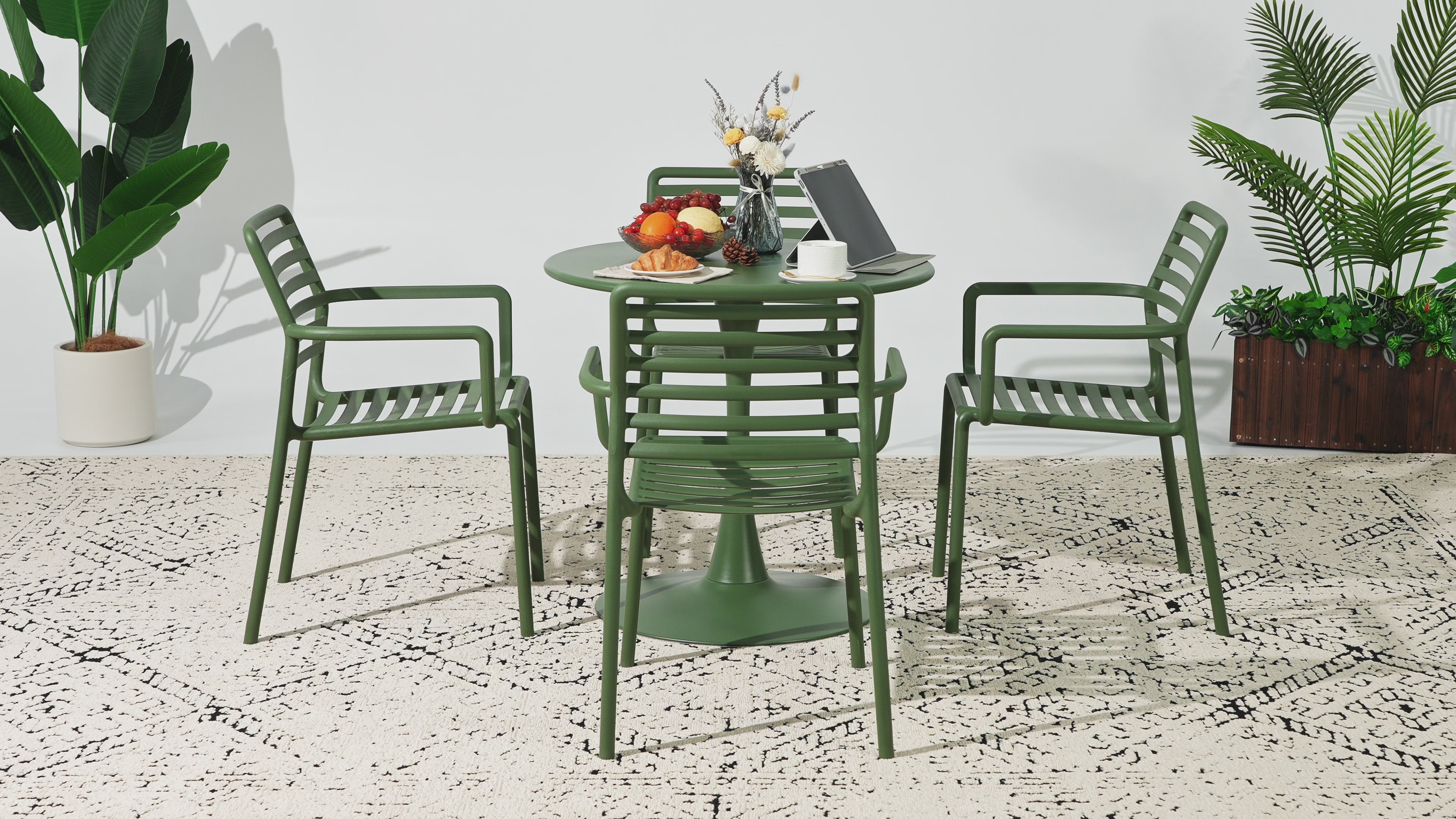 - Set Includes: One (1) 31.5" Metal Patio Dining Table & Four (4) Stackable Patio Dining Arm Chairs