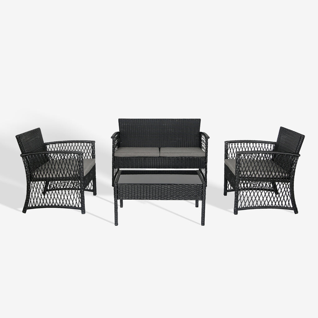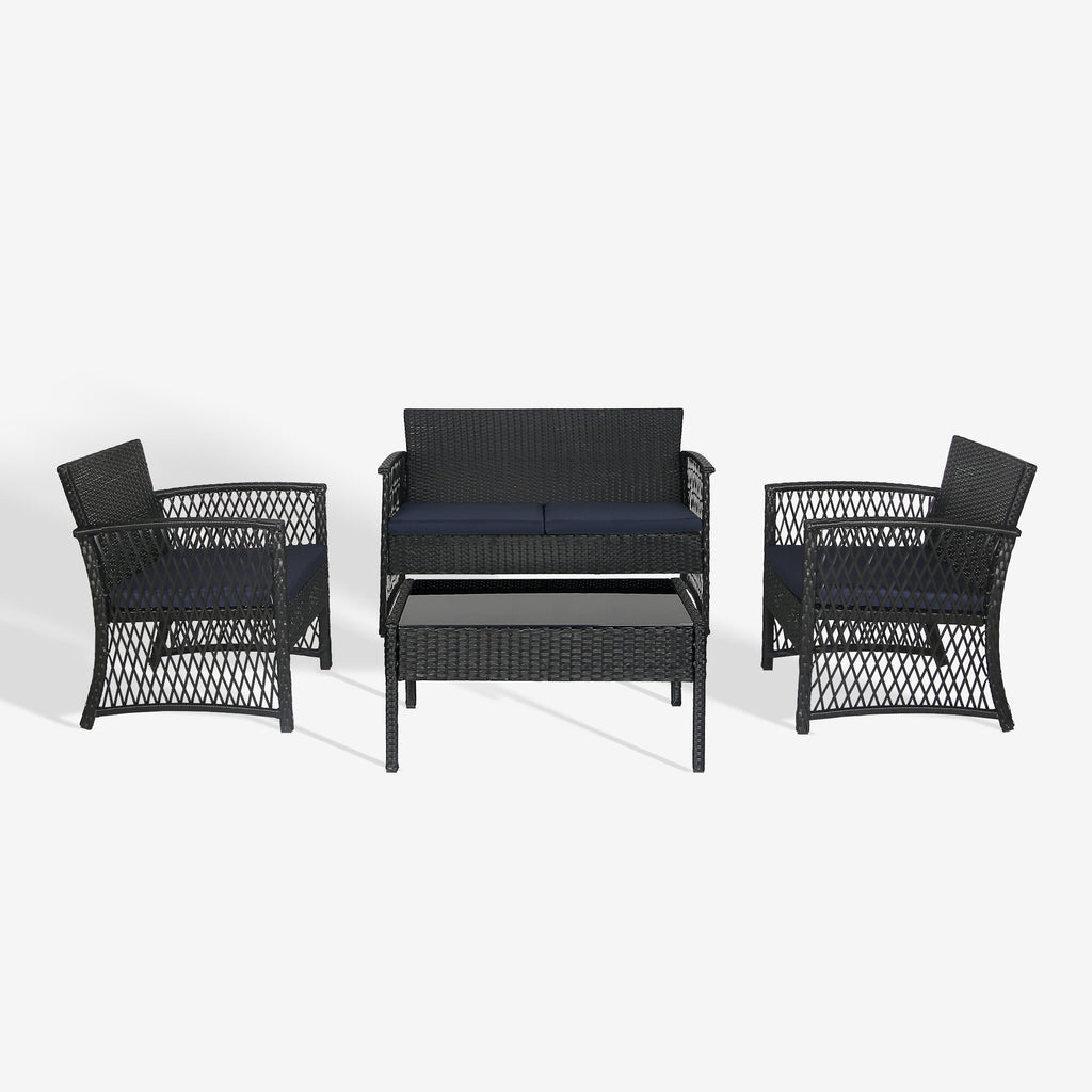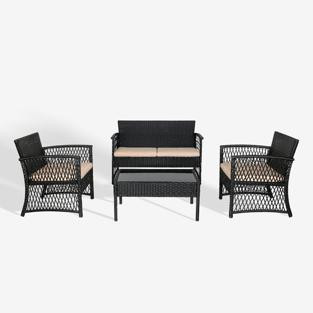 Turn your backyard into a place of style,comfort, and conversation space with this beautiful 4-piece woven rattan wicker and coffee table conversation set. The entire set is wrapped in a beautiful black woven rattan wicker that is made up of PE material that adds durability and strength to the set and with a UV and weather resistant coating that prevents fading and keeps the set in prime condition. The beige padded cushion covers are made of a polyester blend that is both an all-weather fabric and fade resistant, so they keep your furniture looking good all year long. This is the perfect set to make your backyard the place to be.