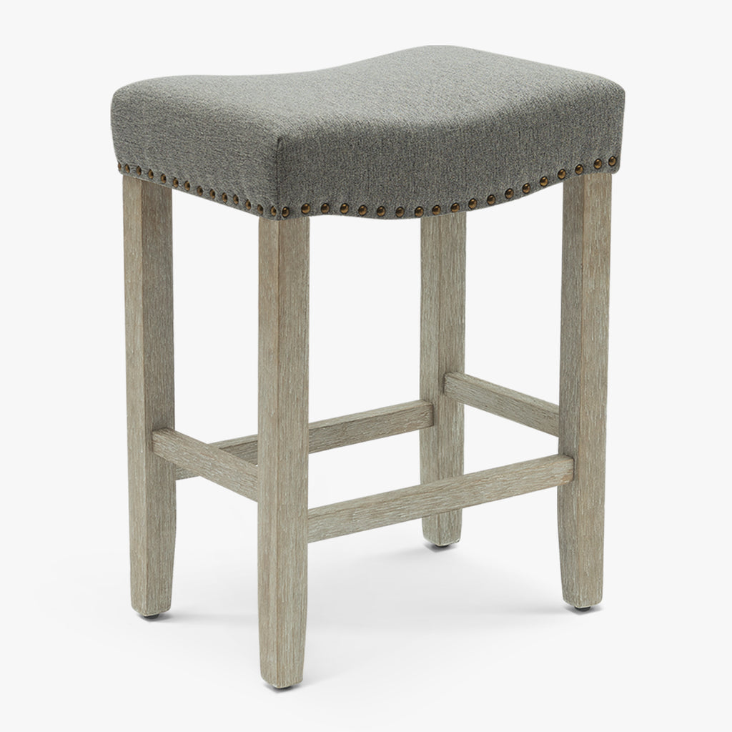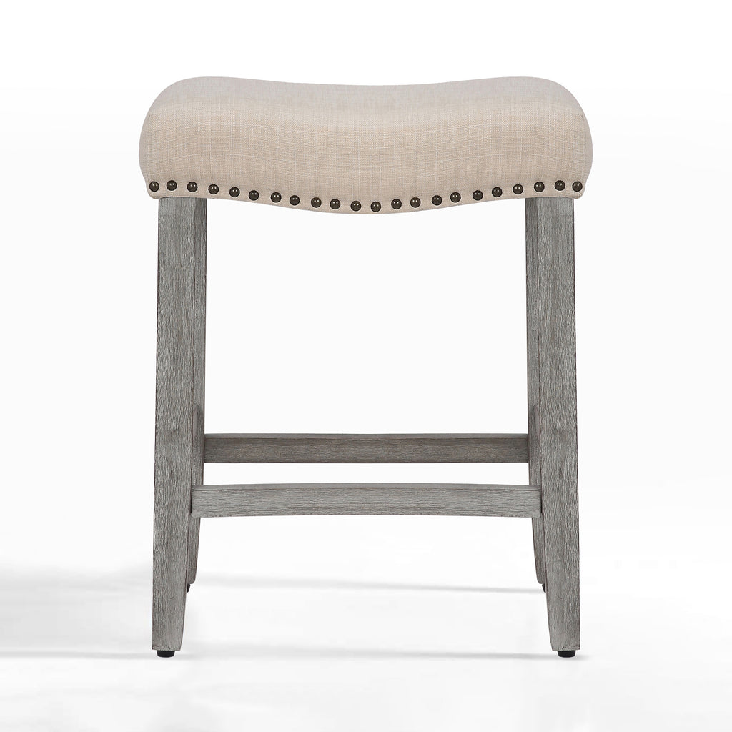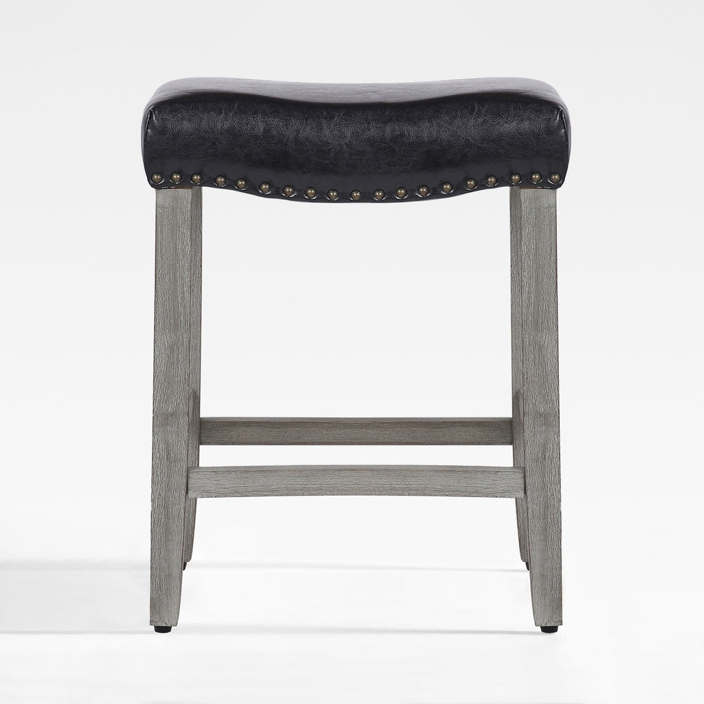 Enjoy a refreshing update to your home bar with this modern counter stool. The saddle-style seat delivers stylish comfort for your kitchen or bar area. Plus, it boasts a backless design and a convenient footrest for added comfort. The upholstered seat is foam-filled for cushioning and has a subtle rustic bronze nail-head trim for a modern touch on a traditional silhouette.