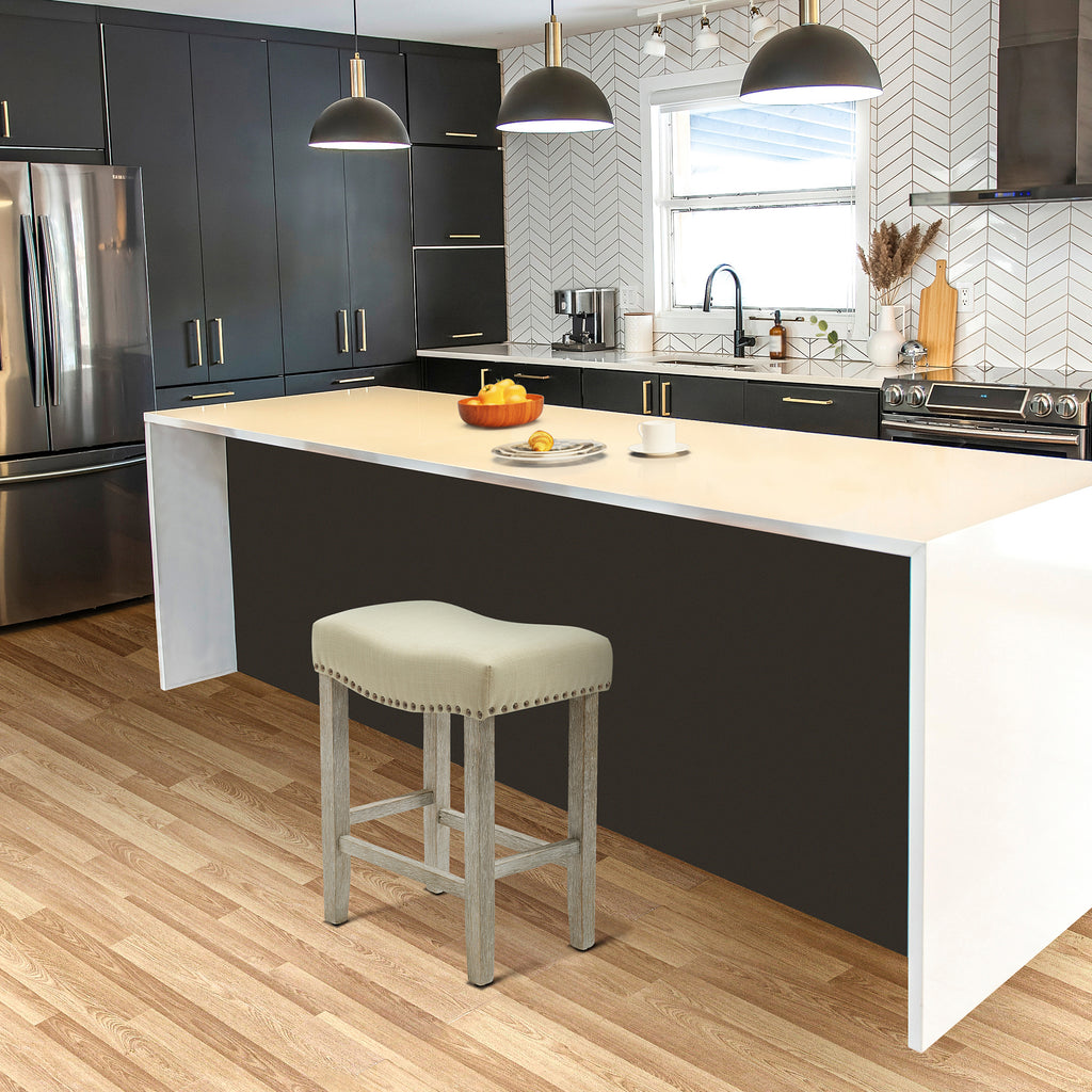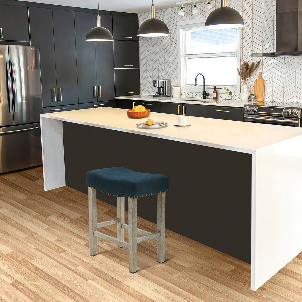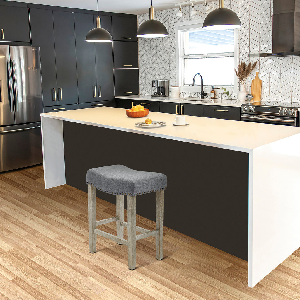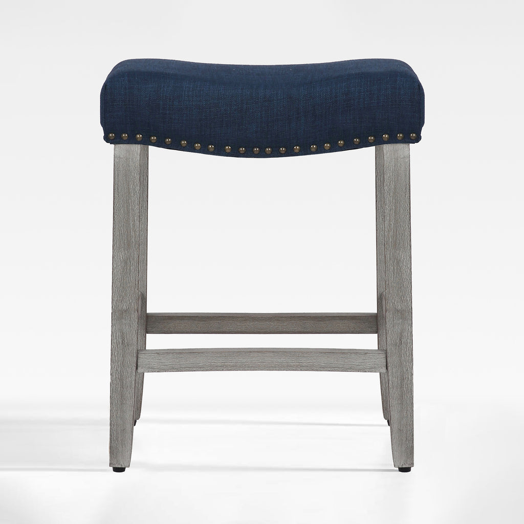 Enjoy a refreshing update to your home bar with this modern counter stool. The saddle-style seat delivers stylish comfort for your kitchen or bar area. Plus, it boasts a backless design and a convenient footrest for added comfort. The upholstered seat is foam-filled for cushioning and has a subtle rustic bronze nail-head trim for a modern touch on a traditional silhouette.