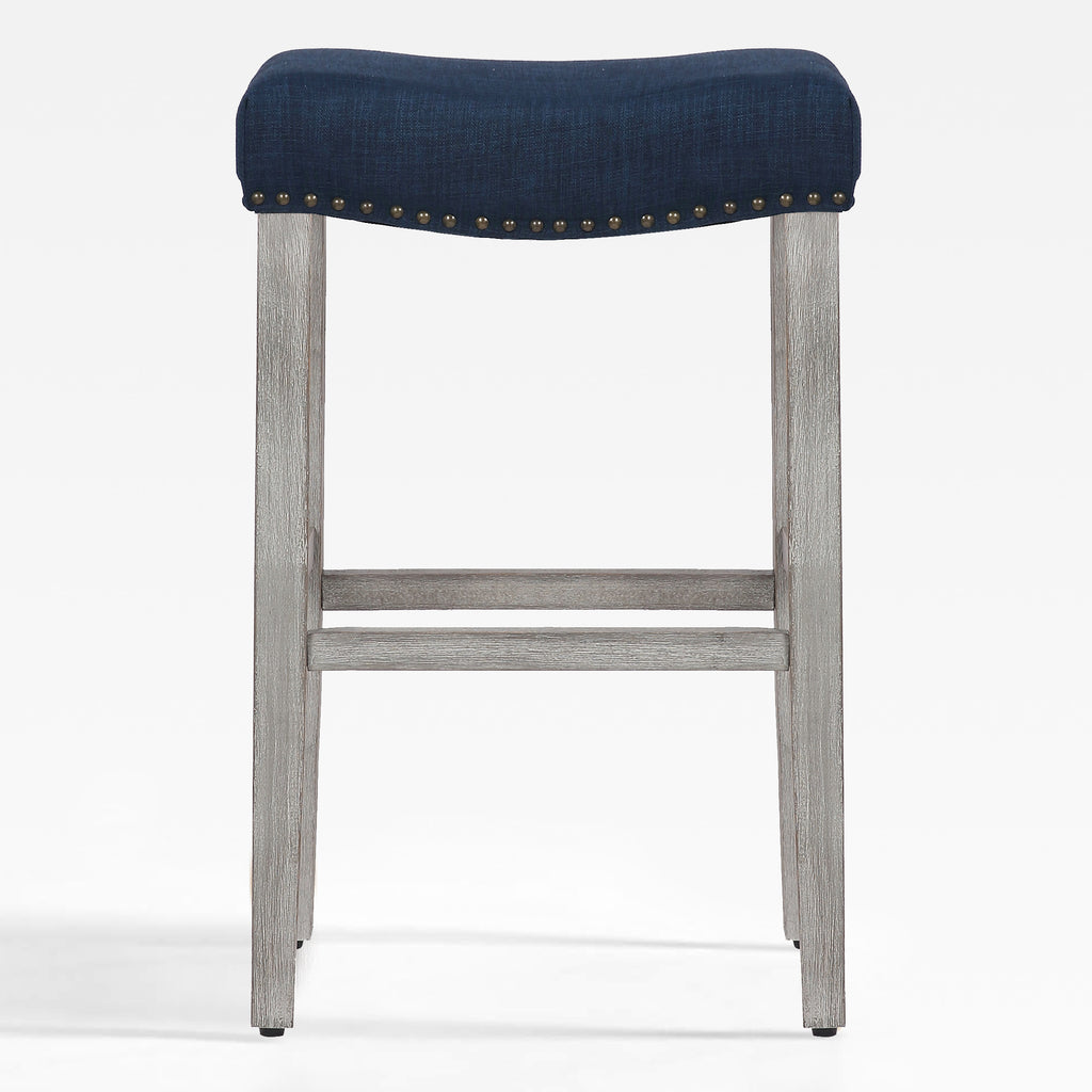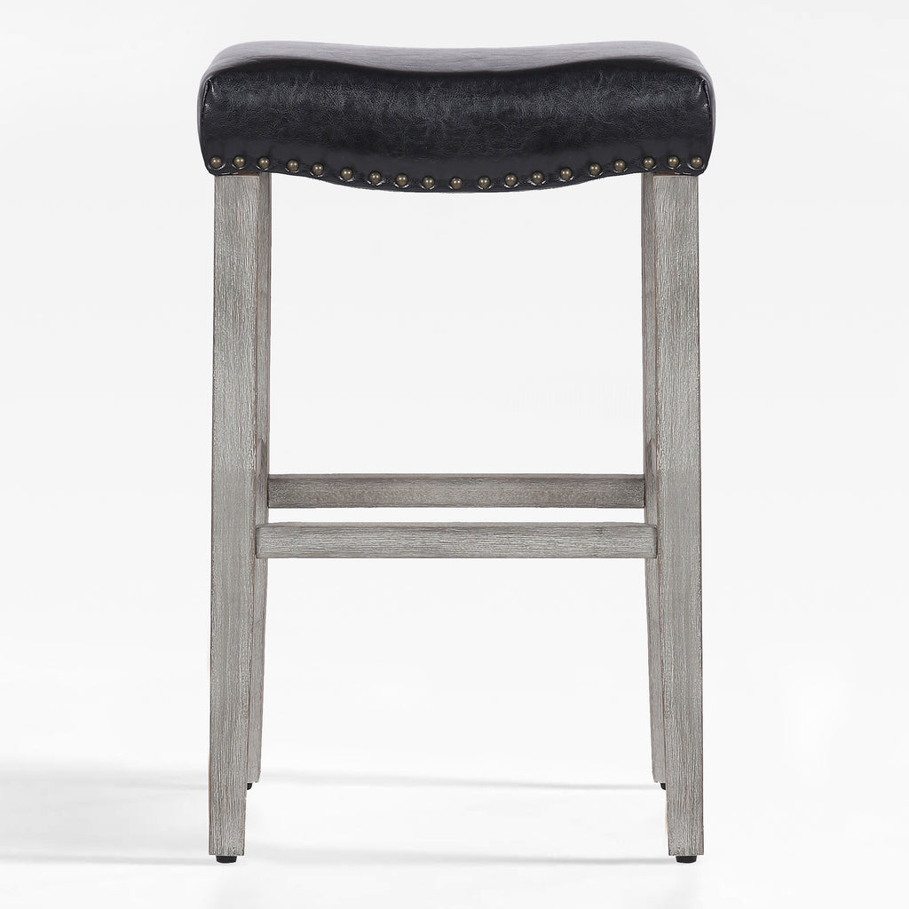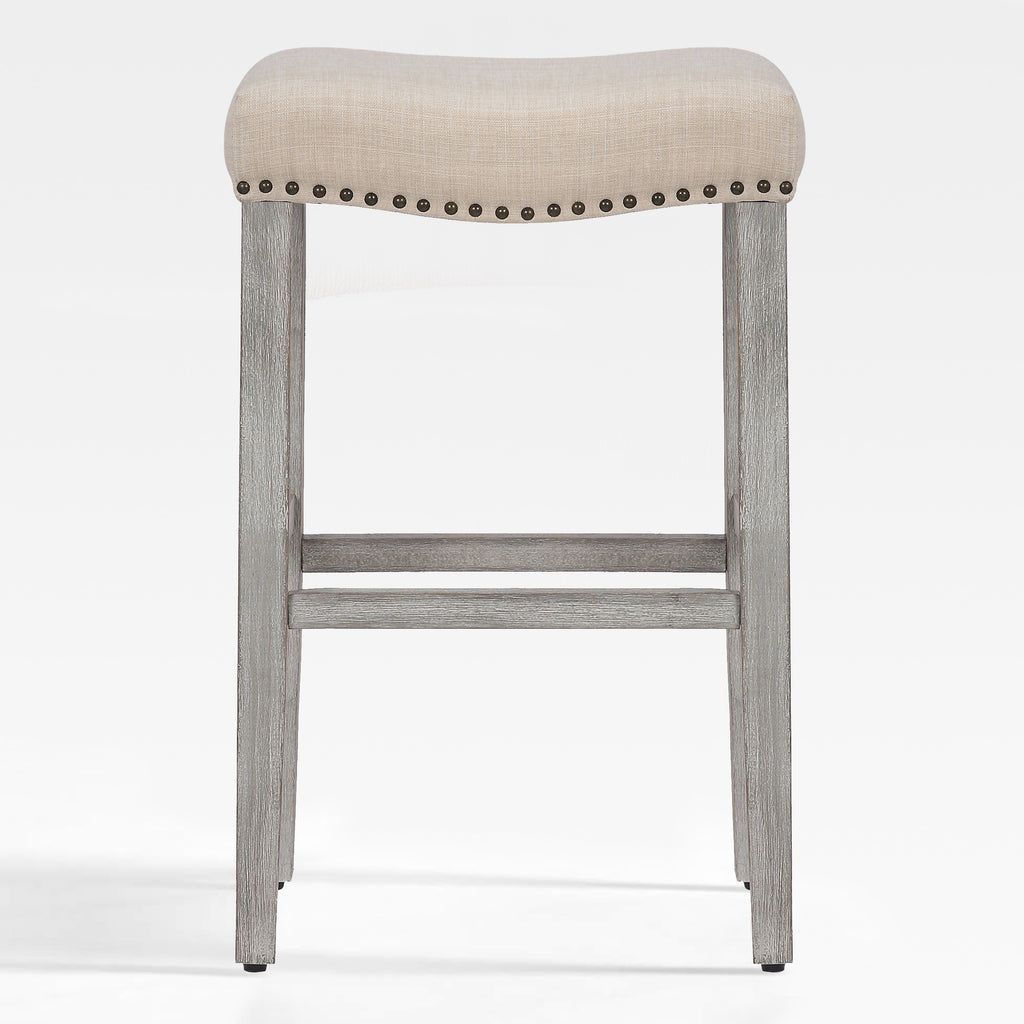 Enjoy a refreshing update to your home bar with this modern bar stool. The saddle-style seat delivers stylish comfort for your kitchen or bar area. Plus, it boasts a backless design and a convenient footrest for added comfort. The upholstered seat is foam-filled for cushioning and has a subtle rustic bronze nail-head trim trim for a modern touch on a traditional silhouette.