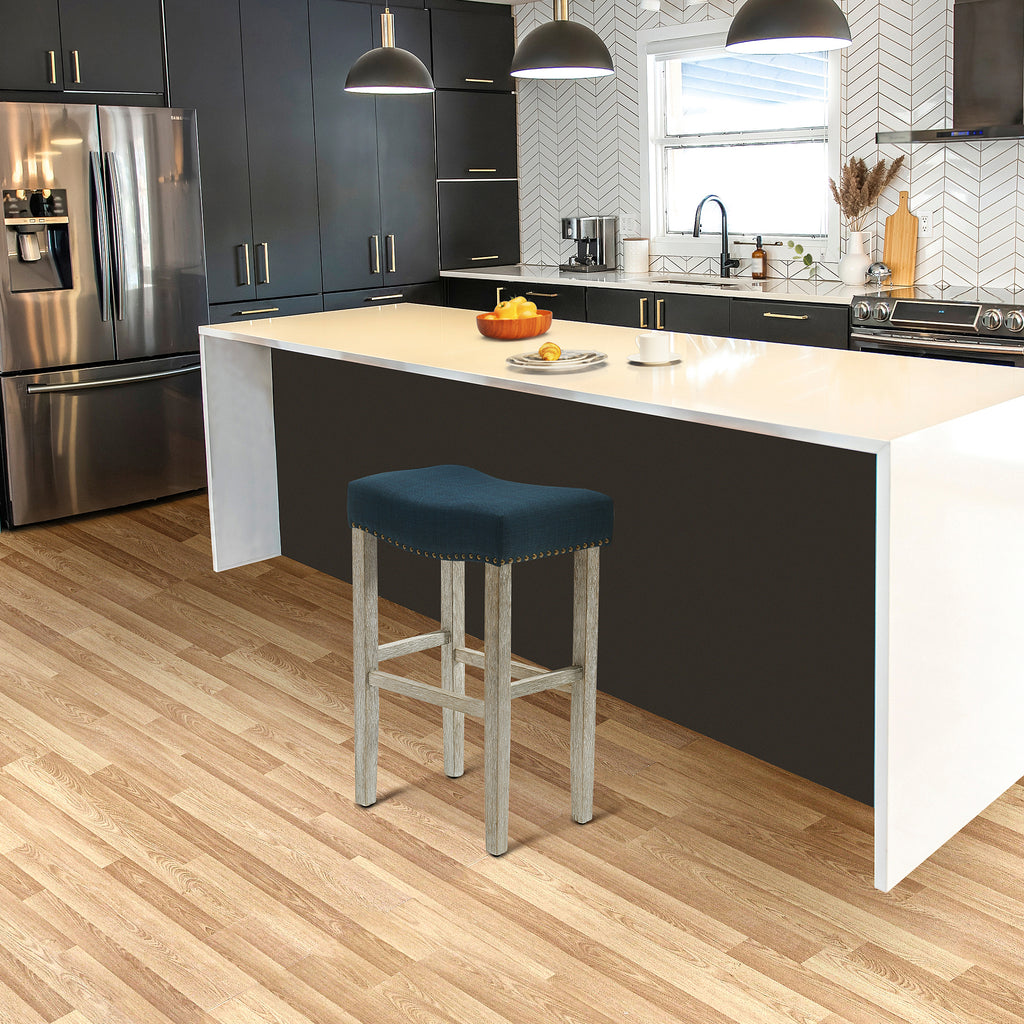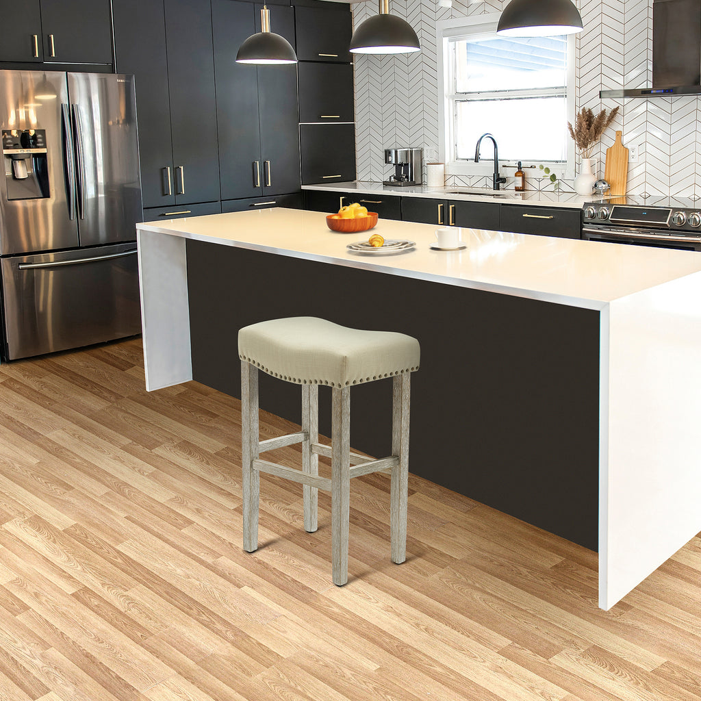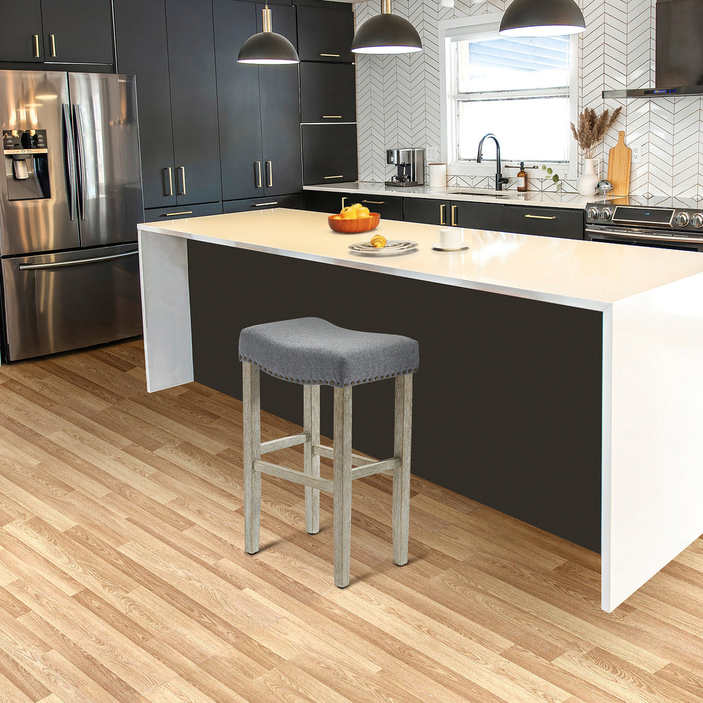 Enjoy a refreshing update to your home bar with this modern bar stool. The saddle-style seat delivers stylish comfort for your kitchen or bar area. Plus, it boasts a backless design and a convenient footrest for added comfort. The upholstered seat is foam-filled for cushioning and has a subtle rustic bronze nail-head trim trim for a modern touch on a traditional silhouette.