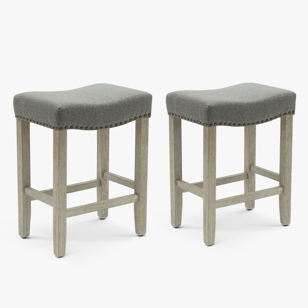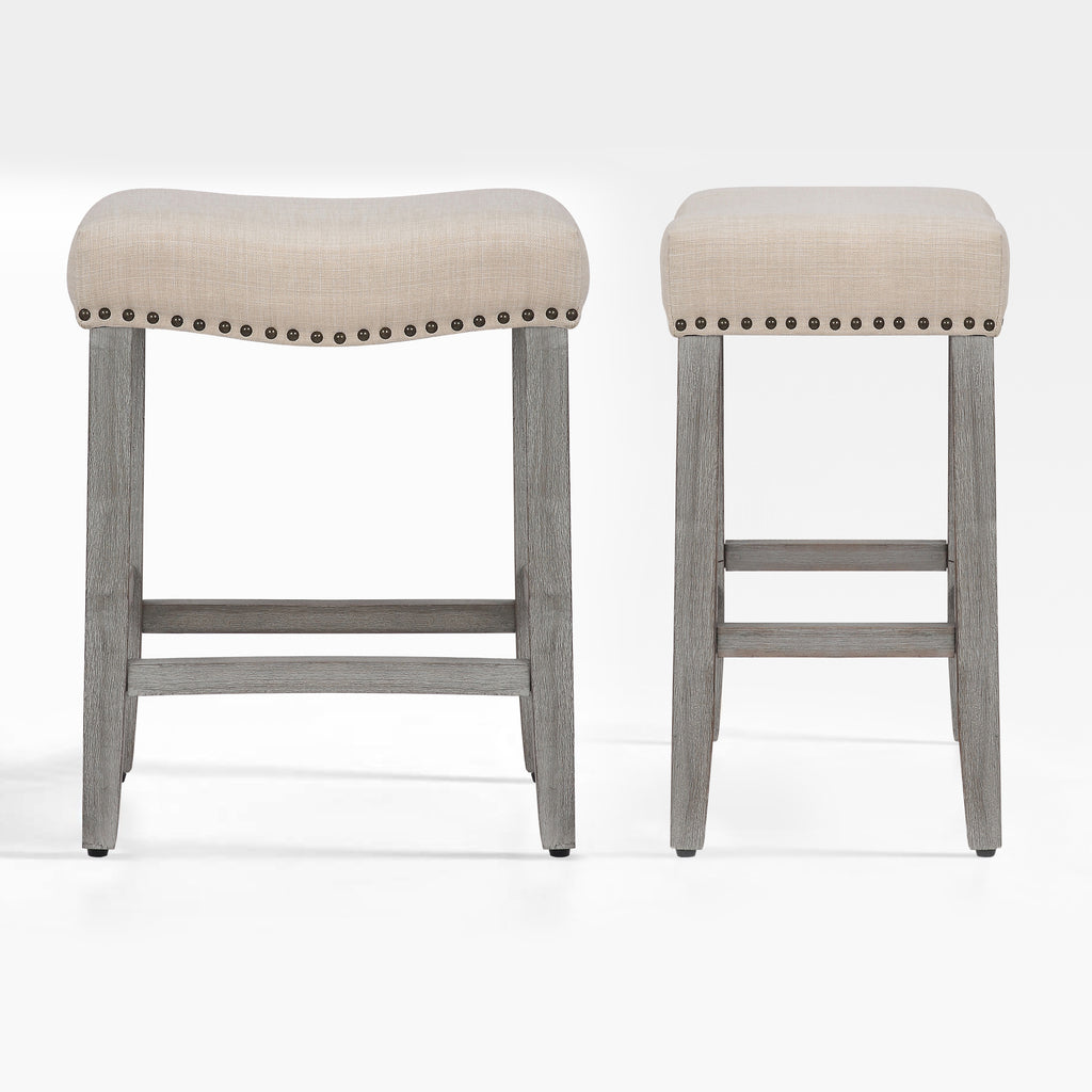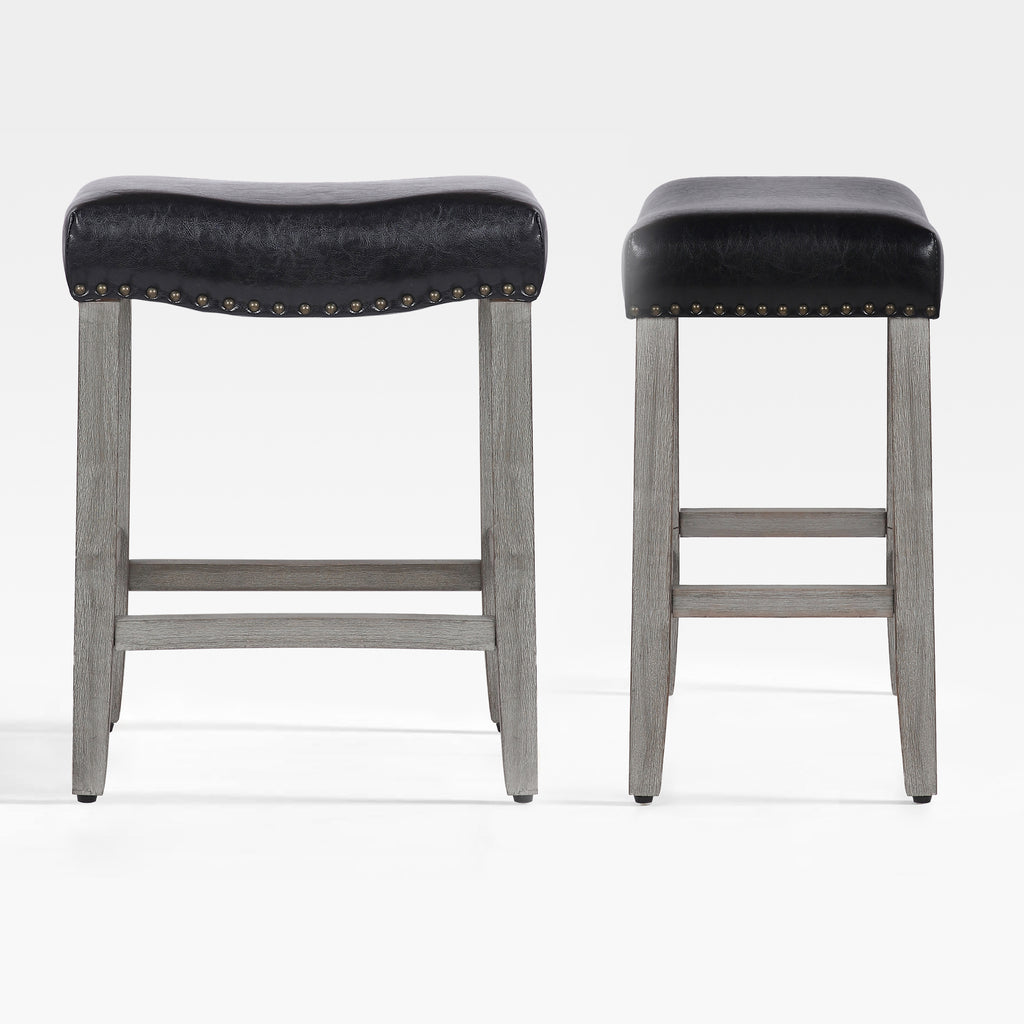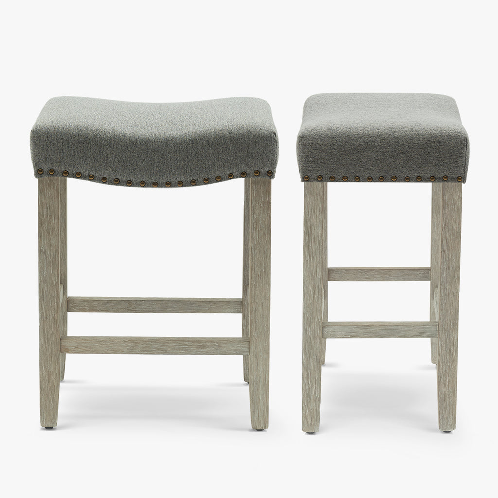 Enjoy a refreshing update to your home bar with this modern counter stool set. The saddle-style seat delivers stylish comfort for your kitchen or bar area. Plus, it boasts a backless design and a convenient footrest for added comfort. The upholstered seat is foam-filled for cushioning and has rustic bronze nail-head trim detailing for a modern touch on a traditional silhouette.