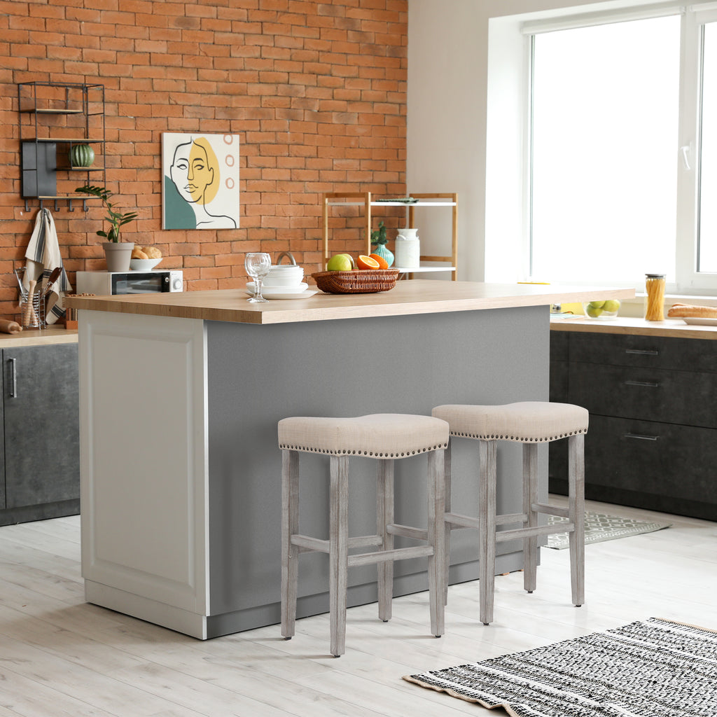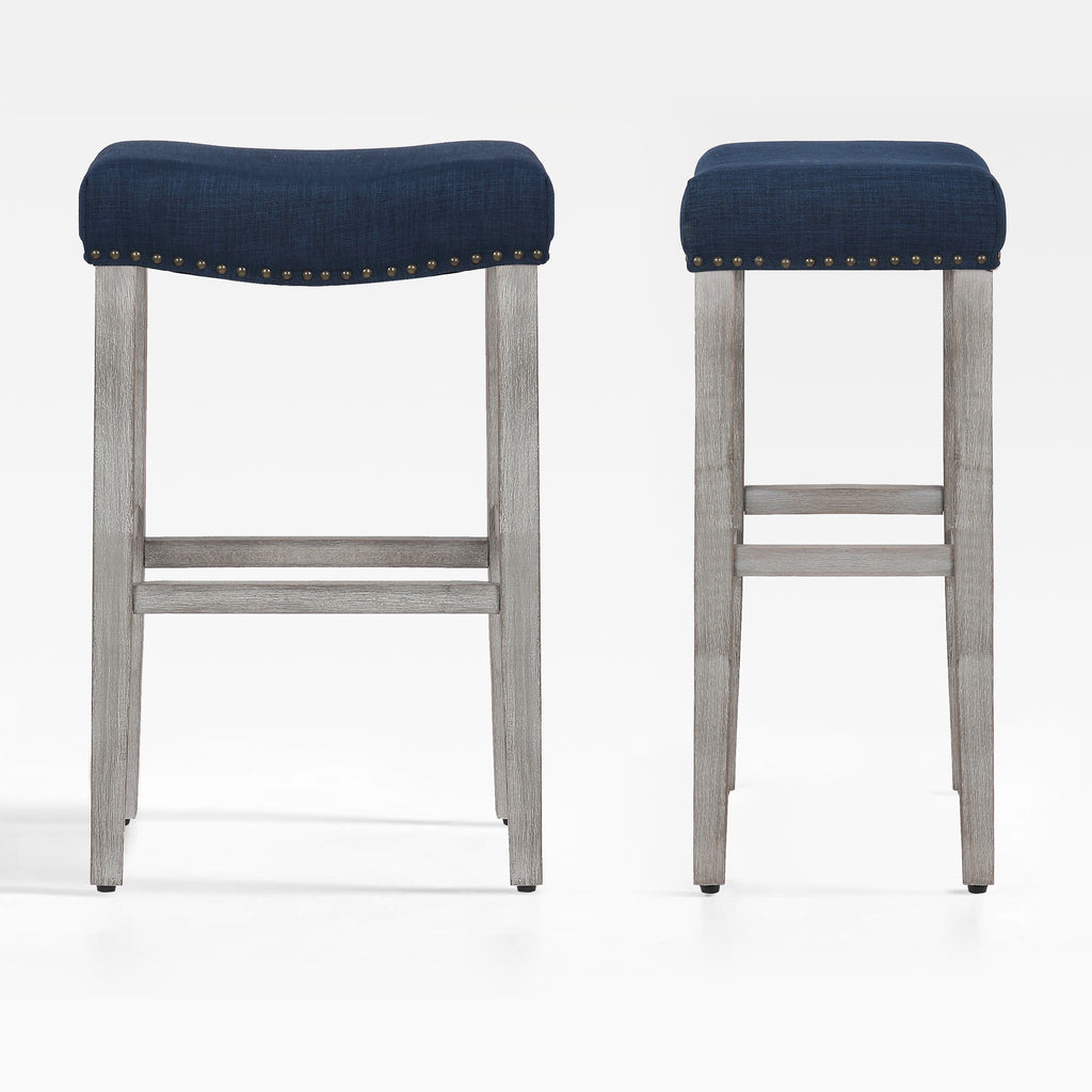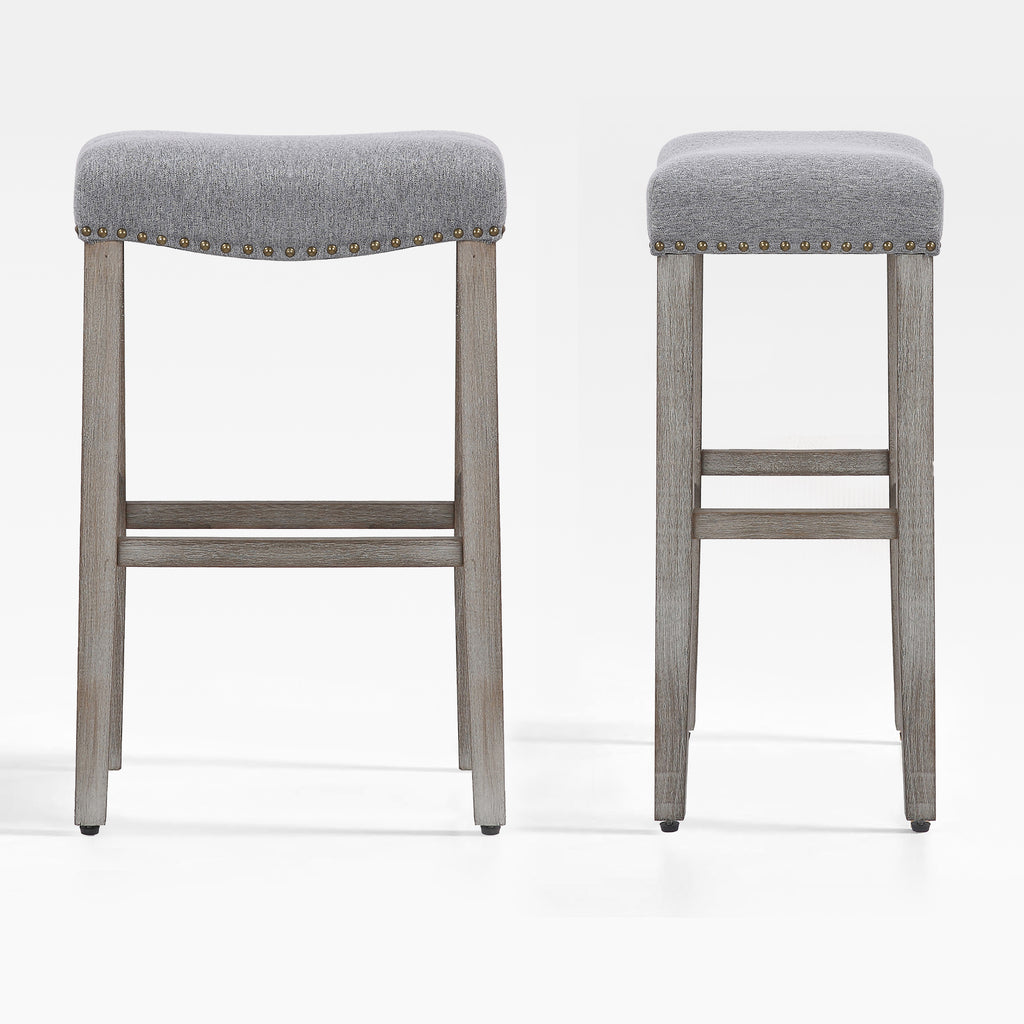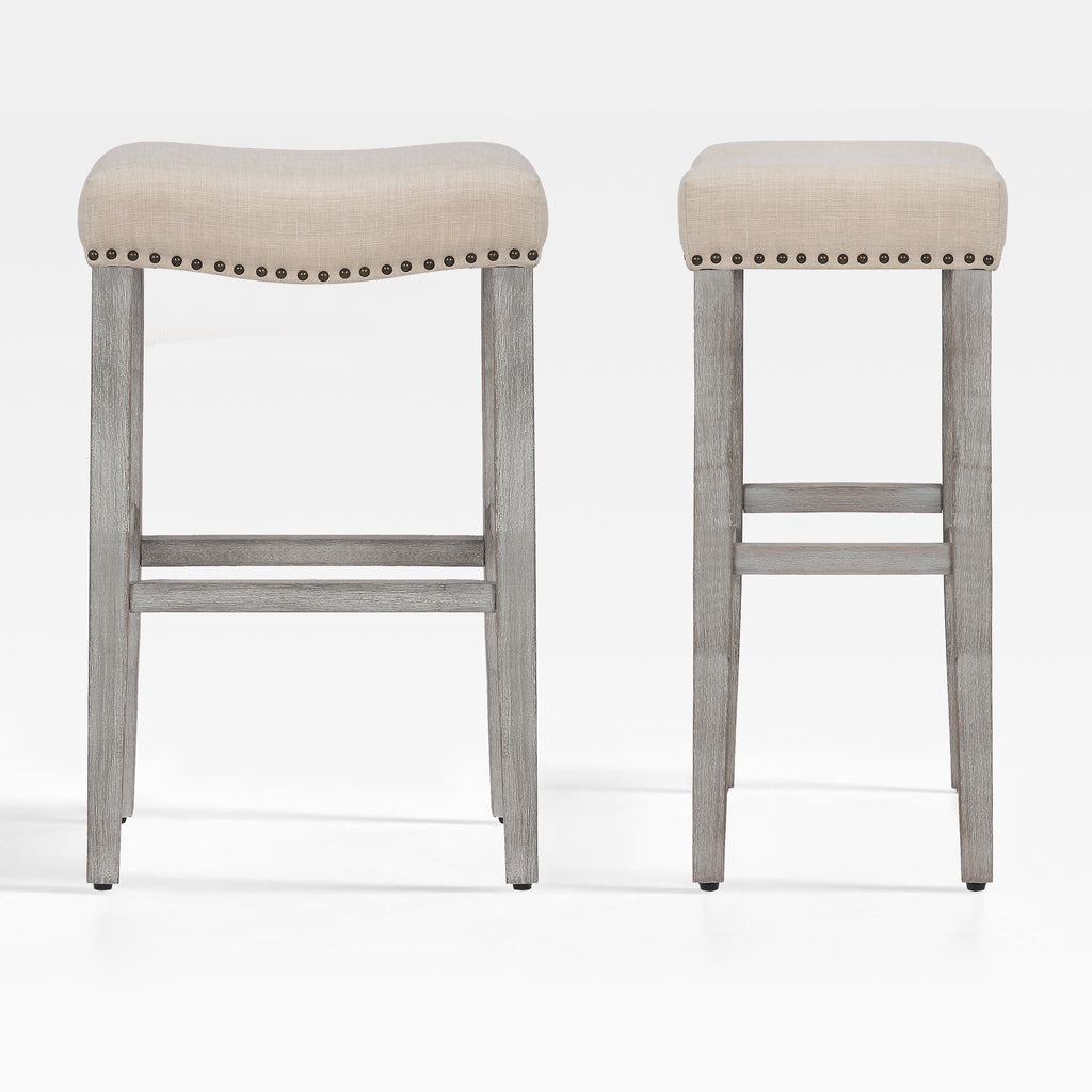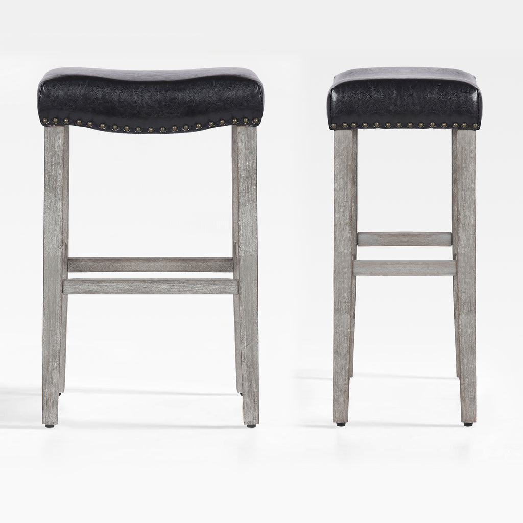 Enjoy a refreshing update to your home bar with this modern counter stool set. The saddle-style seat delivers stylish comfort for your kitchen or bar area. Plus, it boasts a backless design and a convenient footrest for added comfort. The upholstered seat is foam-filled for cushioning and has subtle stud detailing for a modern touch on a traditional silhouette.