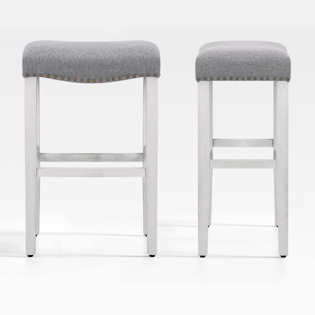 Enjoy a refreshing update to your home bar with this modern 29" bar stool. The saddle-style seat delivers stylish comfort for your kitchen or bar area. Plus, it boasts a backless design and a convenient footrest for added comfort. The upholstered seat is foam-filled for cushioning and has subtle silver nail head trim for a modern touch on a traditional silhouette.