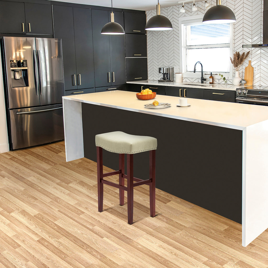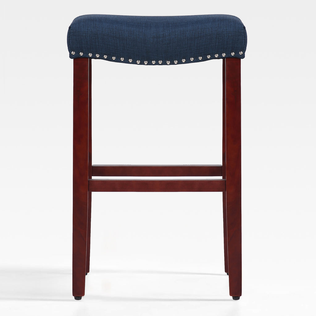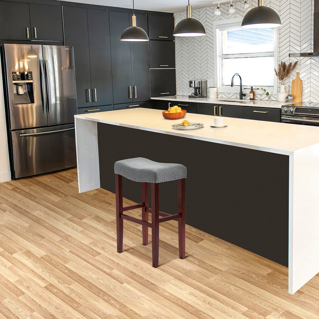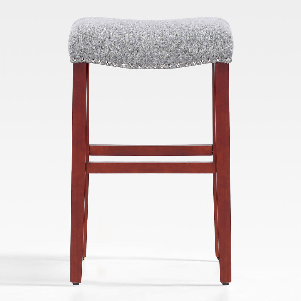 Enjoy a refreshing update to your home bar with this modern 29" barstool. The saddle-style seat delivers stylish comfort for your kitchen or bar area. Plus, it boasts a backless design and a convenient footrest for added comfort. The upholstered seat is foam-filled for cushioning and has subtle stud detailing for a modern touch on a traditional silhouette.
