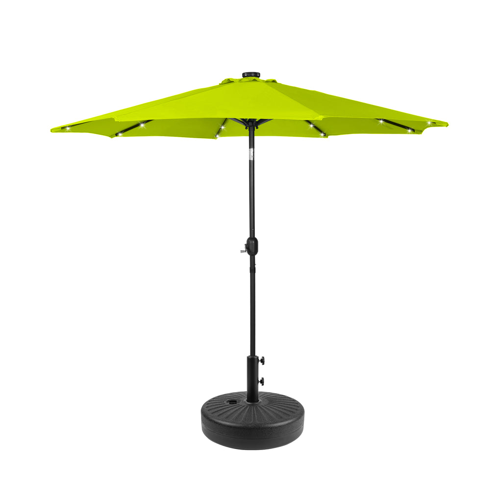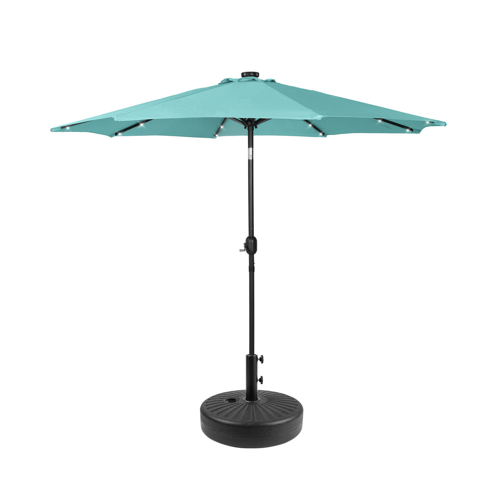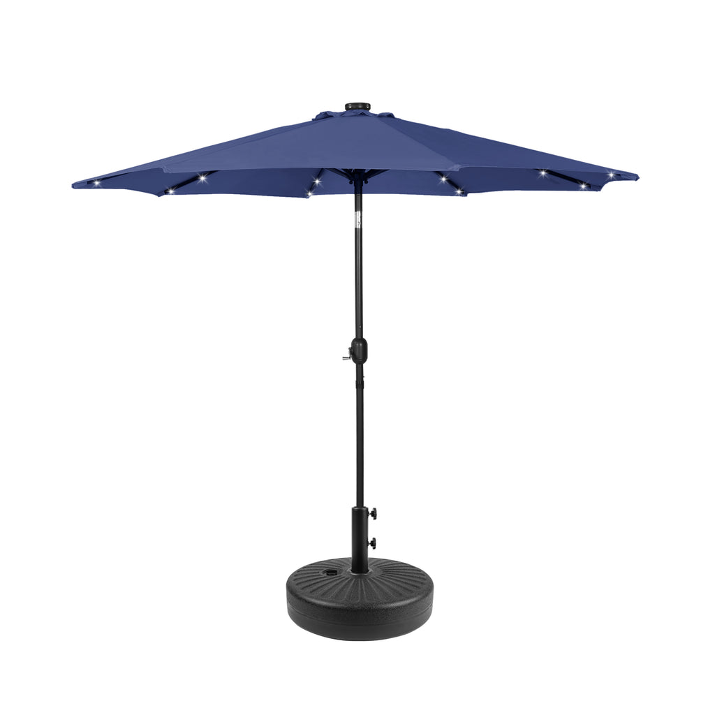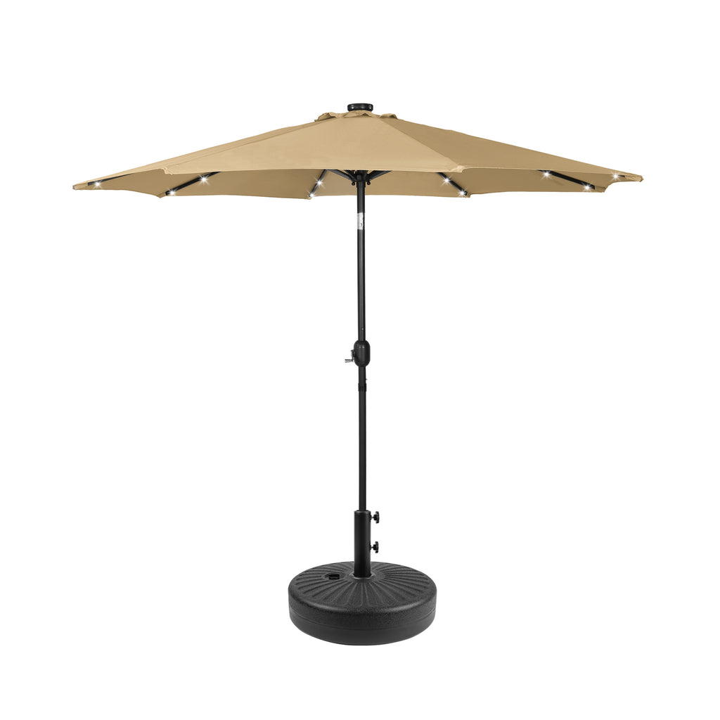 The 9-ft umbrella with LED lighting will keep you well-lit all night long while you unwind in the shade and relax at night under the light. The 32 solar-powered LED lights are powered by the solar panel on top of the umbrella, which keeps them on all night. It features a simple hand cranked lift and a easy-to-push button tilt that can easily cover the sun at any angle and power the solar lights at the same time! Keep cool all day long with the umbrella's vented design, that promotes airflow to keep you cool while under the umbrella and makes it easier for strong gusts to move through the fabric. With the round bronze base, it makes for a sturdier design. A long-lasting, water and fade-resistant polyester fabric blocks the sun and harmful UV rays. This umbrella is perfect for all your needs and will make the perfect addition to your backyard.