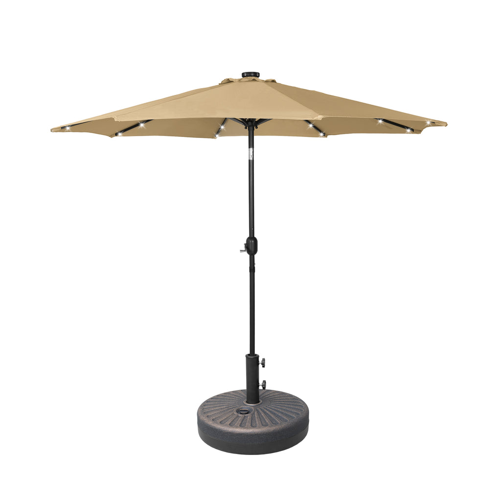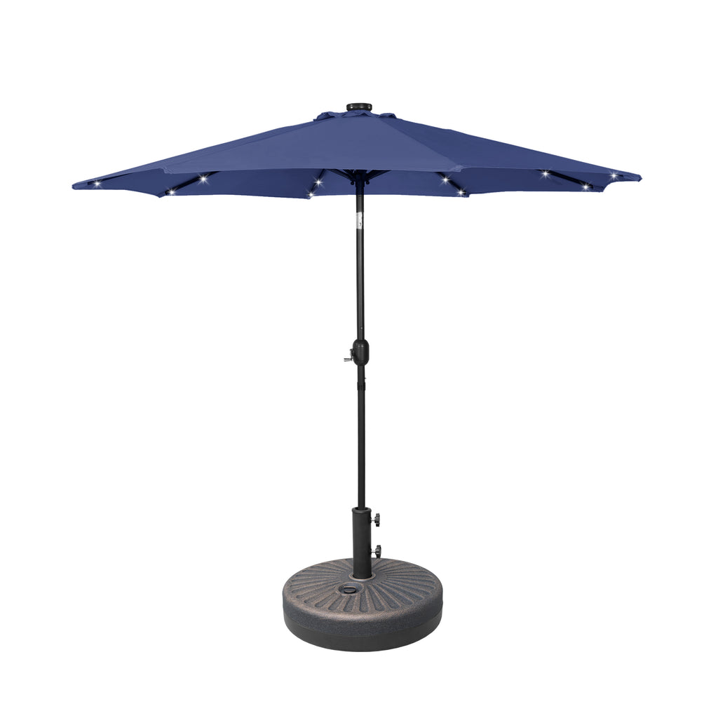 The 9-ft umbrella with LED lighting will keep you well-lit all night long while you unwind in the shade and relax at night under the light. The 32 solar-powered LED lights are powered by the solar panel on top of the umbrella, which keeps them on all night. It features a simple hand cranked lift and a easy-to-push button tilt that can easily cover the sun at any angle and power the solar lights at the same time! Keep cool all day long with the umbrella's vented design, that promotes airflow to keep you cool while under the umbrella and makes it easier for strong gusts to move through the fabric. With the round bronze base, it makes for a sturdier design. A long-lasting, water and fade-resistant polyester fabric blocks the sun and harmful UV rays. This umbrella is perfect for all your needs and will make the perfect addition to your backyard.