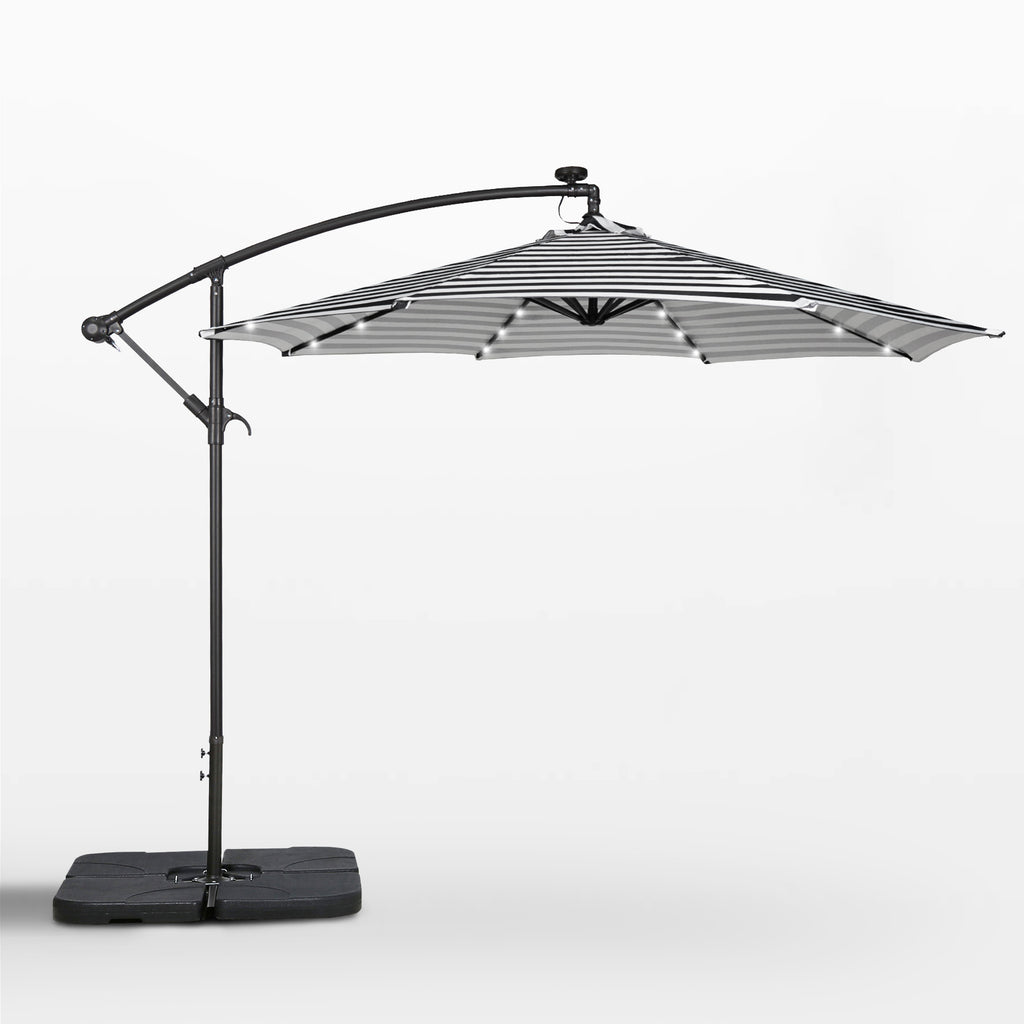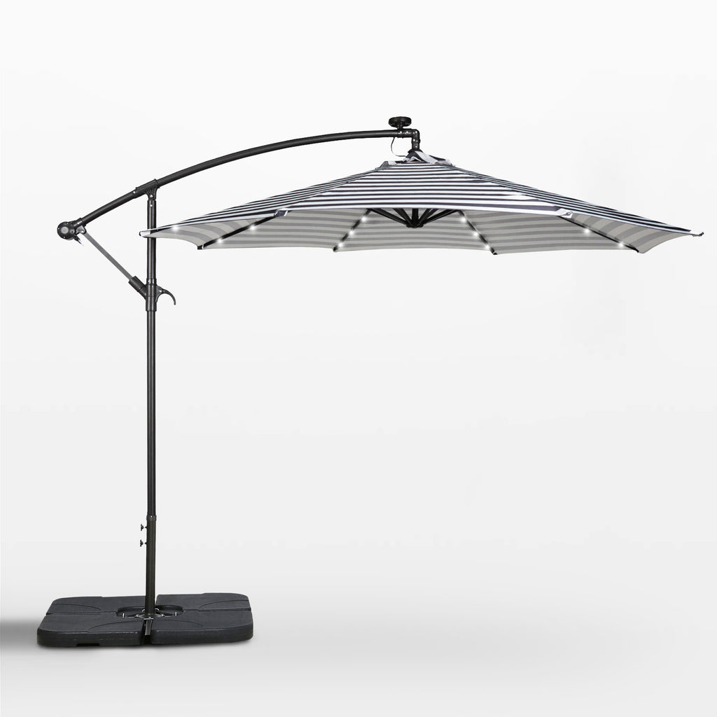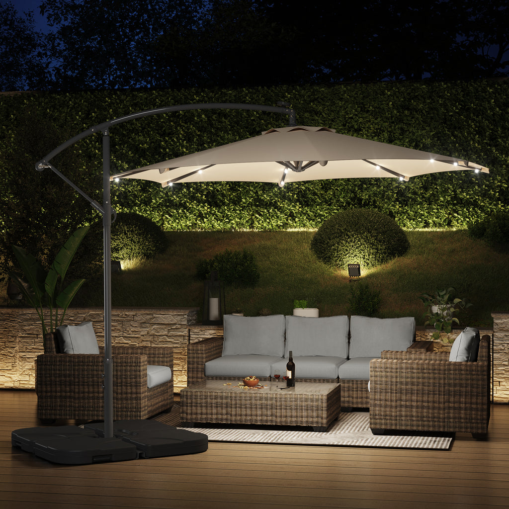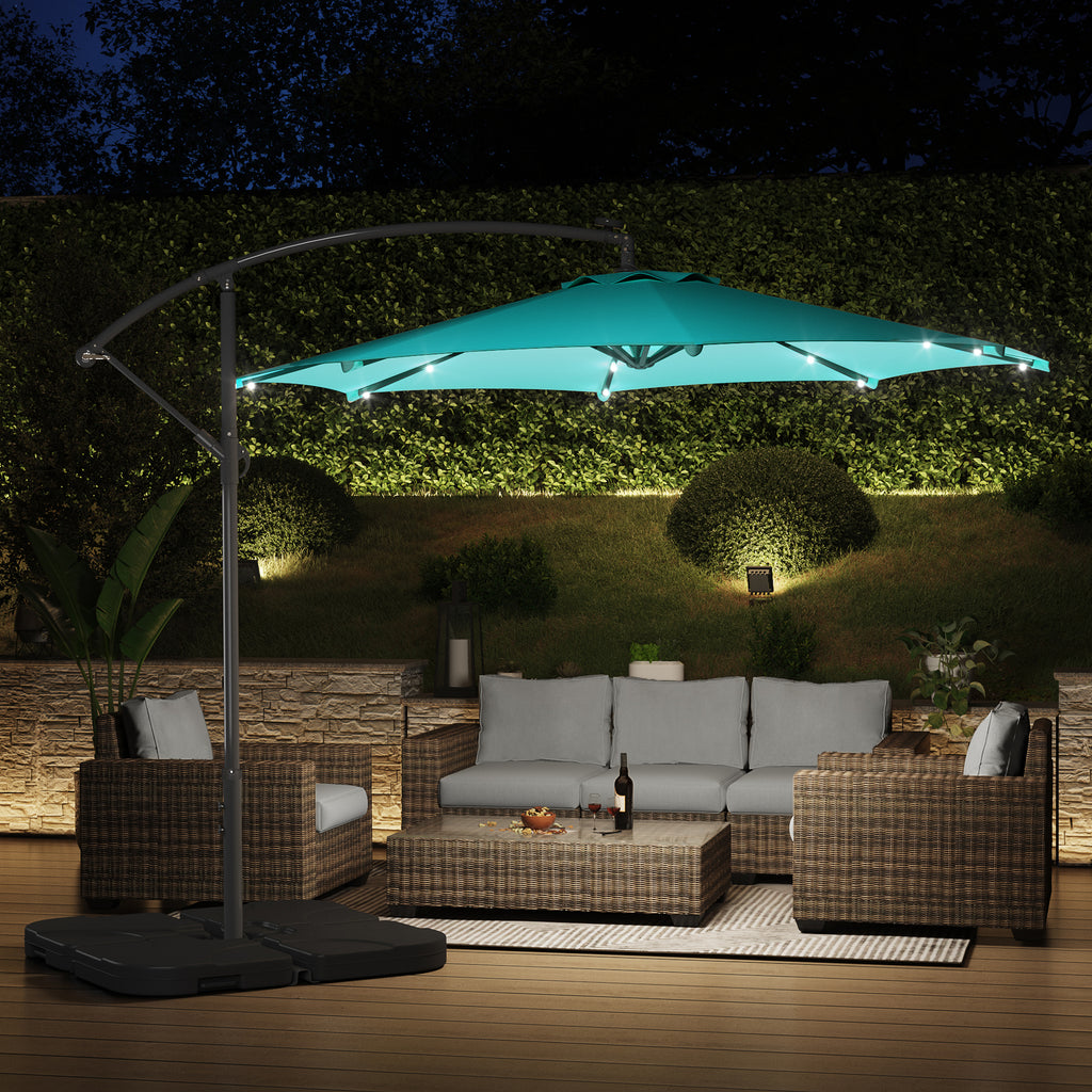 Block out the shining sun during the day and create a romantic space during the evening with this amazing 10 ft LED cantilever umbrella. Stay protected in the shade with the polyester canopy that blocks that warm, bright sun, and protects you from the harmful UV rays. The canopy has a vented top to help with airflow, keep things cool underneath the umbrella, and prevent the umbrella from falling during strong gust of winds with the help of 4 plastic base weights to weigh down the umbrella. The canopy has 32 pre-installed, solar-powered LED lights that will light up your night and create a place of peace that you can enjoy.