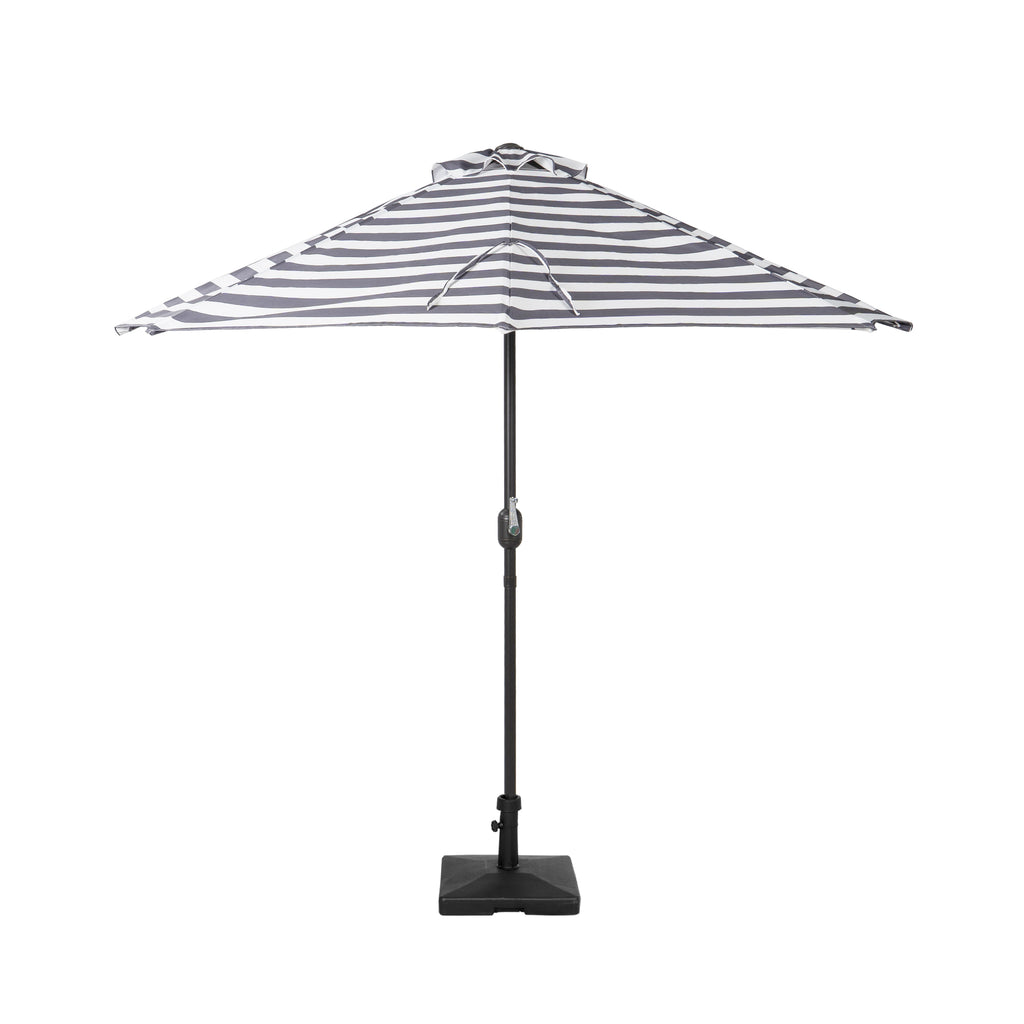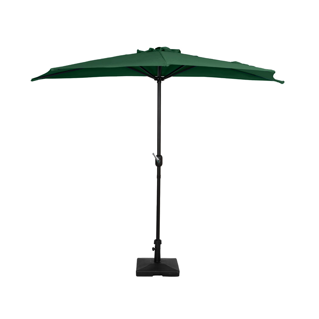 Stay out the sun this season with this 9ft half market patio umbrella. Raise the umbrella with the simple hand crank to open and close the umbrella in seconds to block out the sun on those warm days. The half umbrella is perfect for a balcony, porch, or small patio to place against the wall and cover you. A strong polyester canopy that is water and weather resistant is ideal for protecting the canopy. The canopy also includes a vented canopy to keep the umbrella cool and allow air to pass through easily. This is the perfect umbrella to protect you from the sun without taking up to much space and the concrete base will keep the umbrella upright.