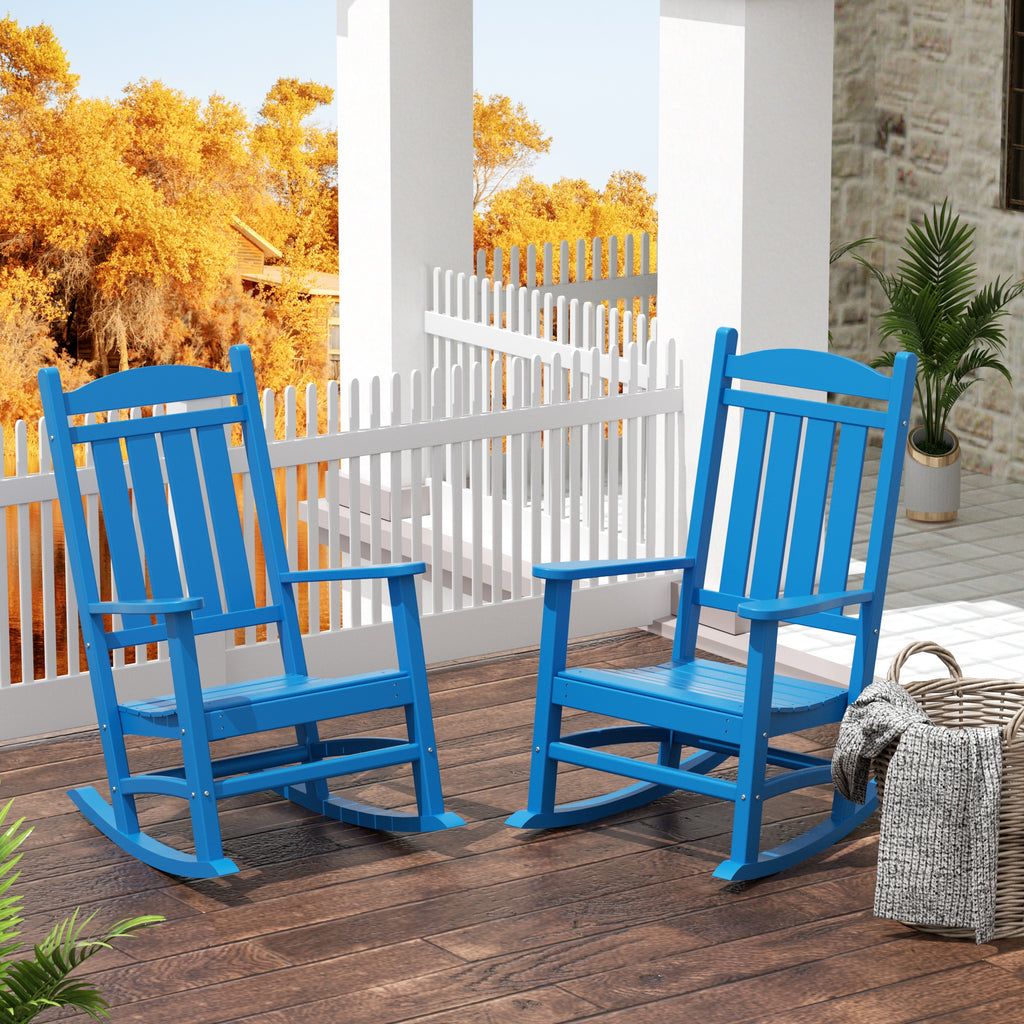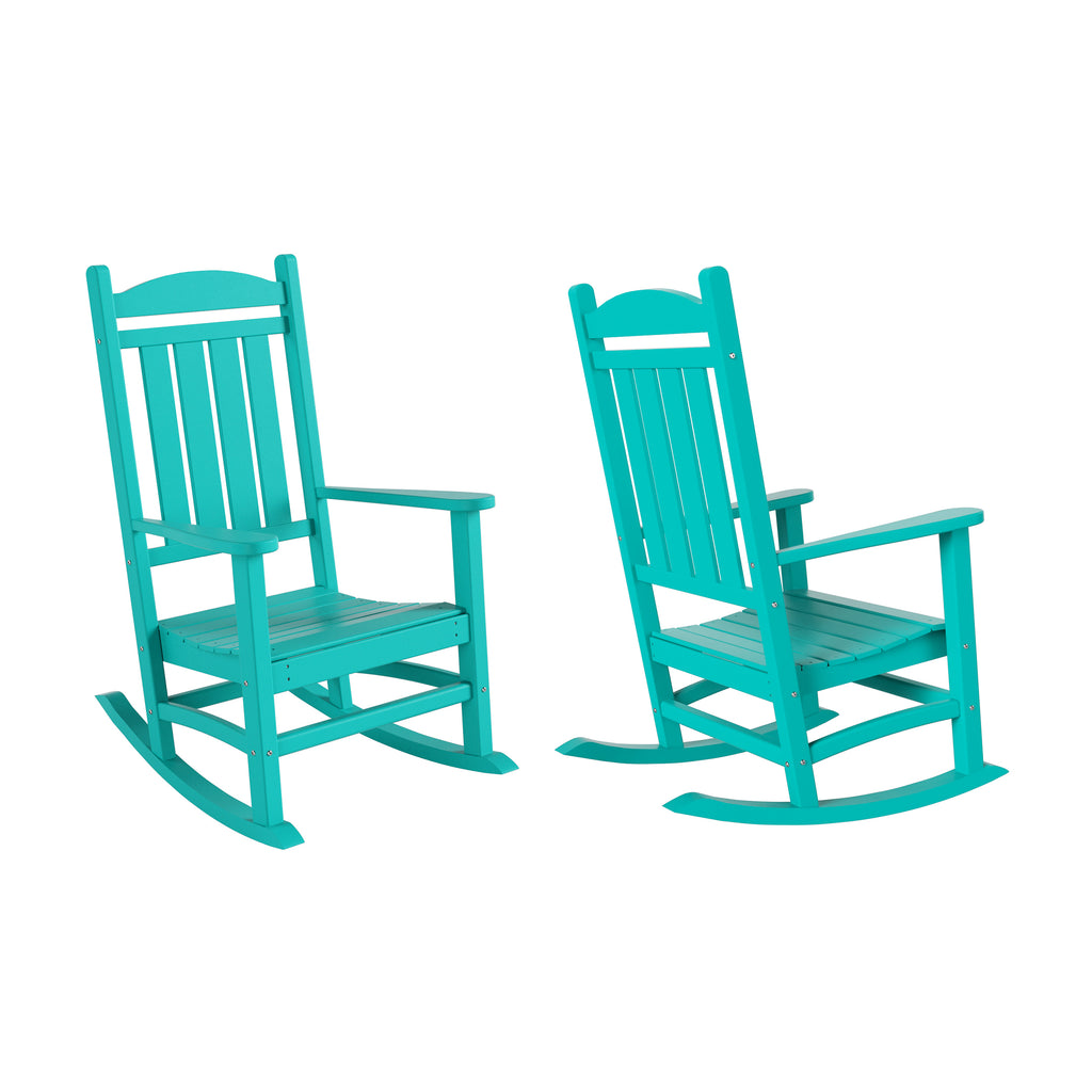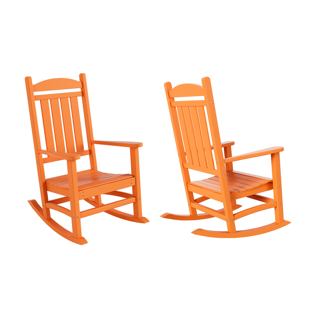 Lean into comfort with these lovely rocking chairs. These beautiful rocking chairs have a contoured seat, an open armrest, a slatted back, and a high back for added comfort and body support, and when combined with the gently sloped rocker rails, adds a smooth rocking motion that will make you feel at ease. These all-weather rockers are made to withstand the elements thanks to the HDPE material, which adds strength as well as a UV and water-resistant finish that helps protect it from harsh weather.