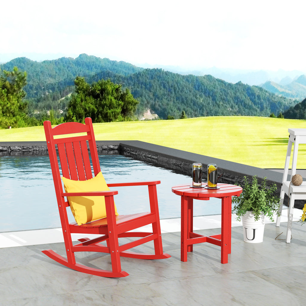 Sit in comfort with this beautiful and durable weather resistant plastic outdoor 2-piece Rocking Chair Set. Provides all day comfort seating while you enjoy your patio, balcony, or garden. Adjustable backrest can be positioned to your liking. Perfect seating for around the pool, lounge area, or outdoor living space. Design with a classic Adirondack style it's a perfect combination of practicality and aesthetics. Made of premium poly plastic material, this 2pc set is weather resistant and durable for everyday outdoor use. Our lounge chair is an ideal choice for poolside, patio, porch, and seaside to enjoy fresh air everywhere. Available in a variety of easy to match colors. This deck chair is made of high-quality plastic, which makes it weather resistant and easy to clean and it is easy to move into any space seating is needed. UV protected frame is fade-resistant and any colors to choose, you can mix or match to create just the right look. A must have patio furniture seating options ensure you are comfortable while enjoying your relaxation. Makes a great porch chair bundle. Round Side table is perfect for keeping items nearby. A must have for any deck, den or balcony.