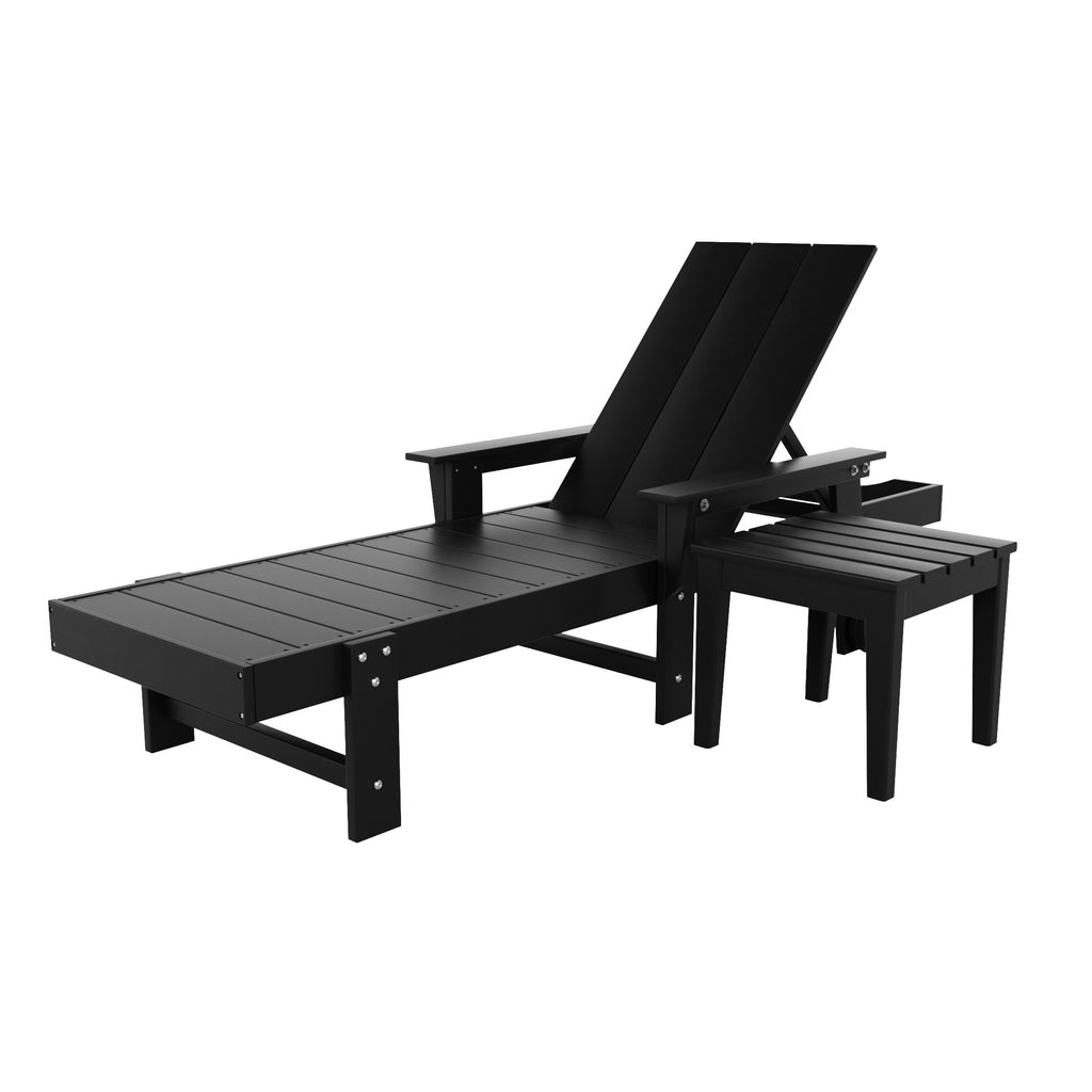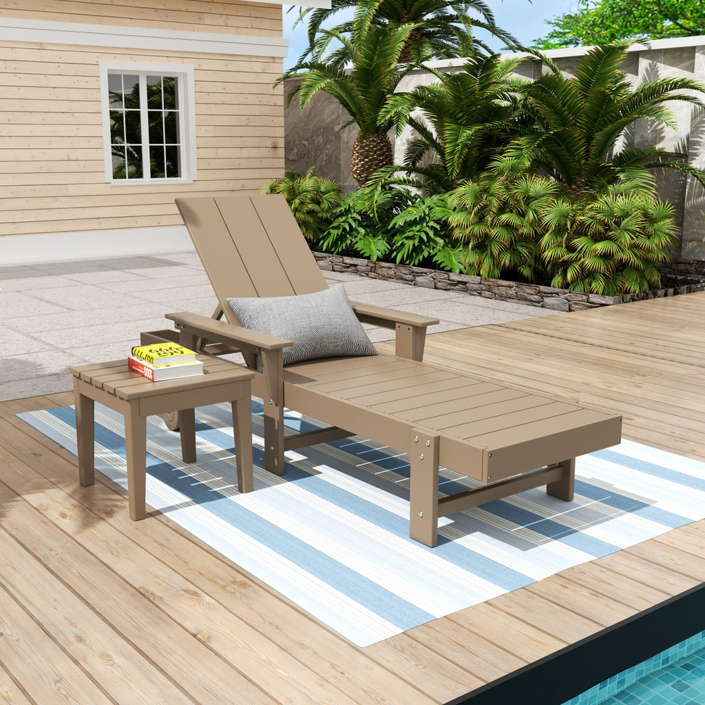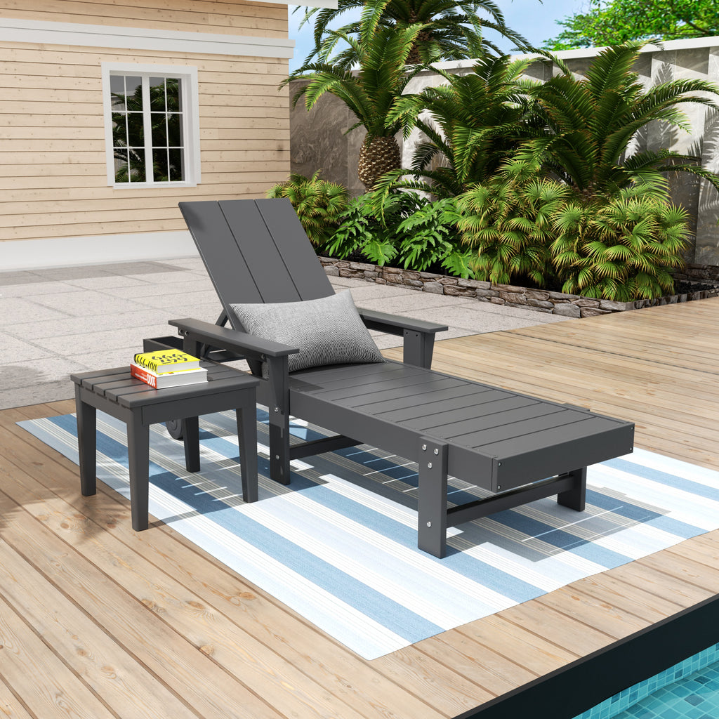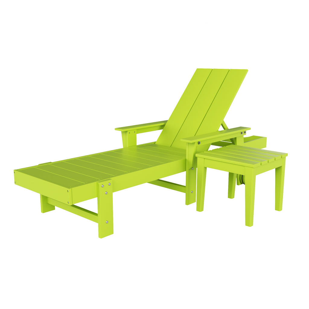 Lounge back and relax this summer with our charming Chaise Lounger with Arms and Wheels and side table. Relax by the pool this season in style with the modern Adirondack backrest that is easy to adjust, so you can sit up, lay your arms on the armrest and read a book, or lay back and catch a tan while having your drink right by your side with our matching 18" side table. Made with a durable, eco-friendly HDPE material that is resistant to the harsh UV rays and has fade-resistant coloring, so you can keep your lounger looking great all season. If you need to move the lounger from storage or just need some more shade, simply pick up the lounger from the front and move to wherever you need with the helpful wheels that make moving it an ease. This lounger is sure to make your summer more relaxing and comfortable.
