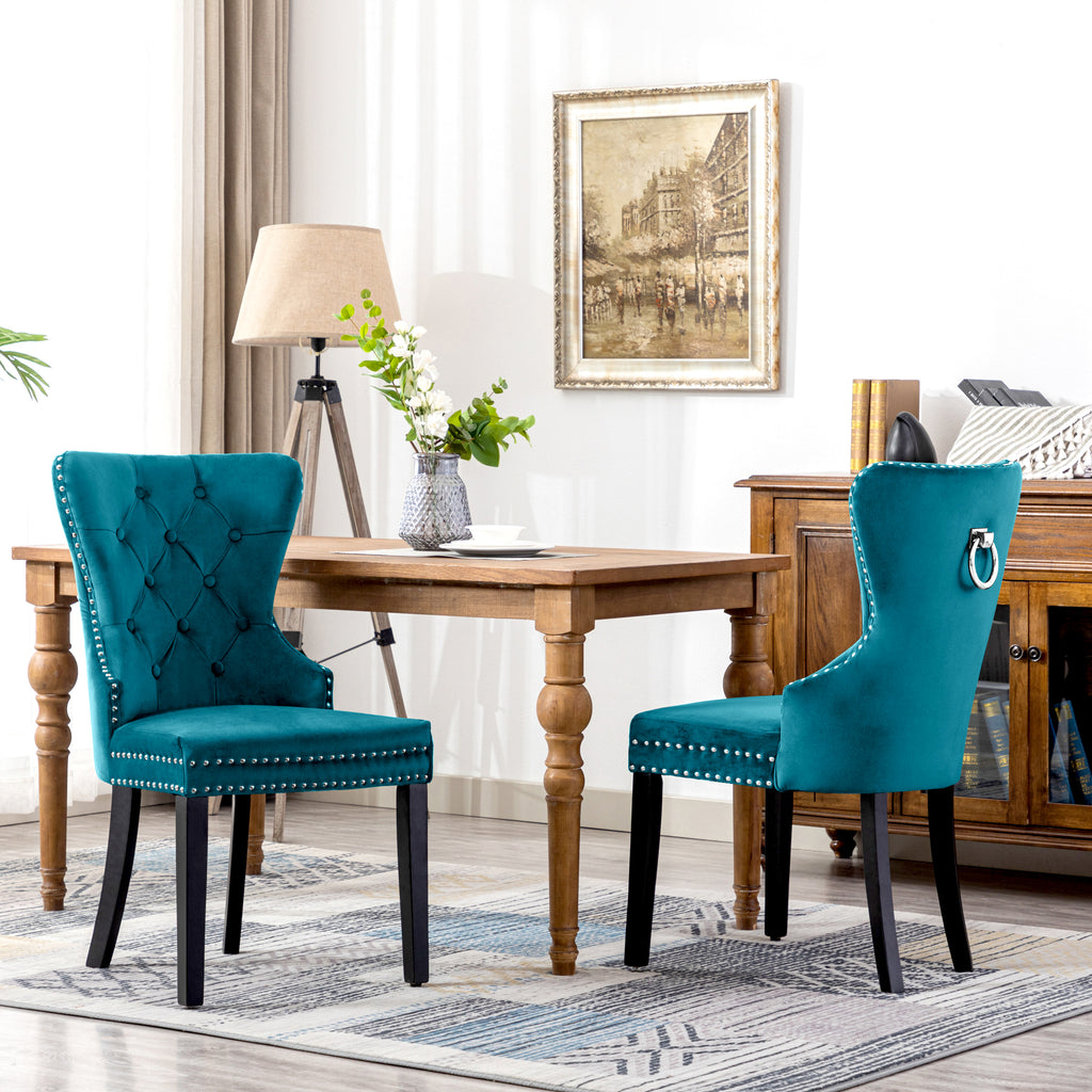 Turn any room into a place of royalty with this beautiful dining chair set. Upholstered in a soft velvet fabric with a button-tufted design and a diamond stitched pattern that adds character and complements the silver nail head trim. The wingback design adds a vintage aesthetic that gives your home a rustic feel with a modern update. This set adds charm to your home and will make any room feel more refreshing.