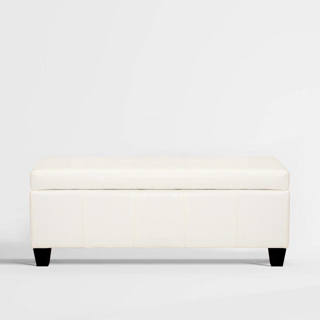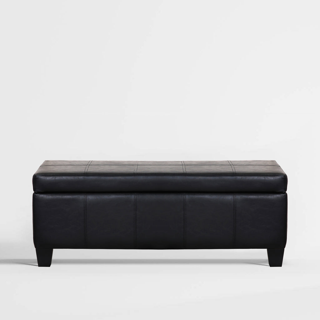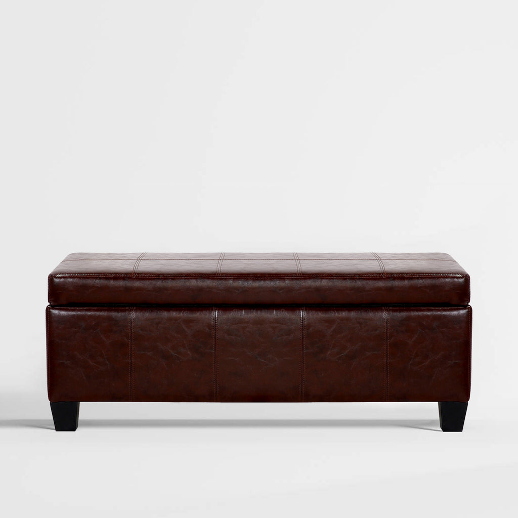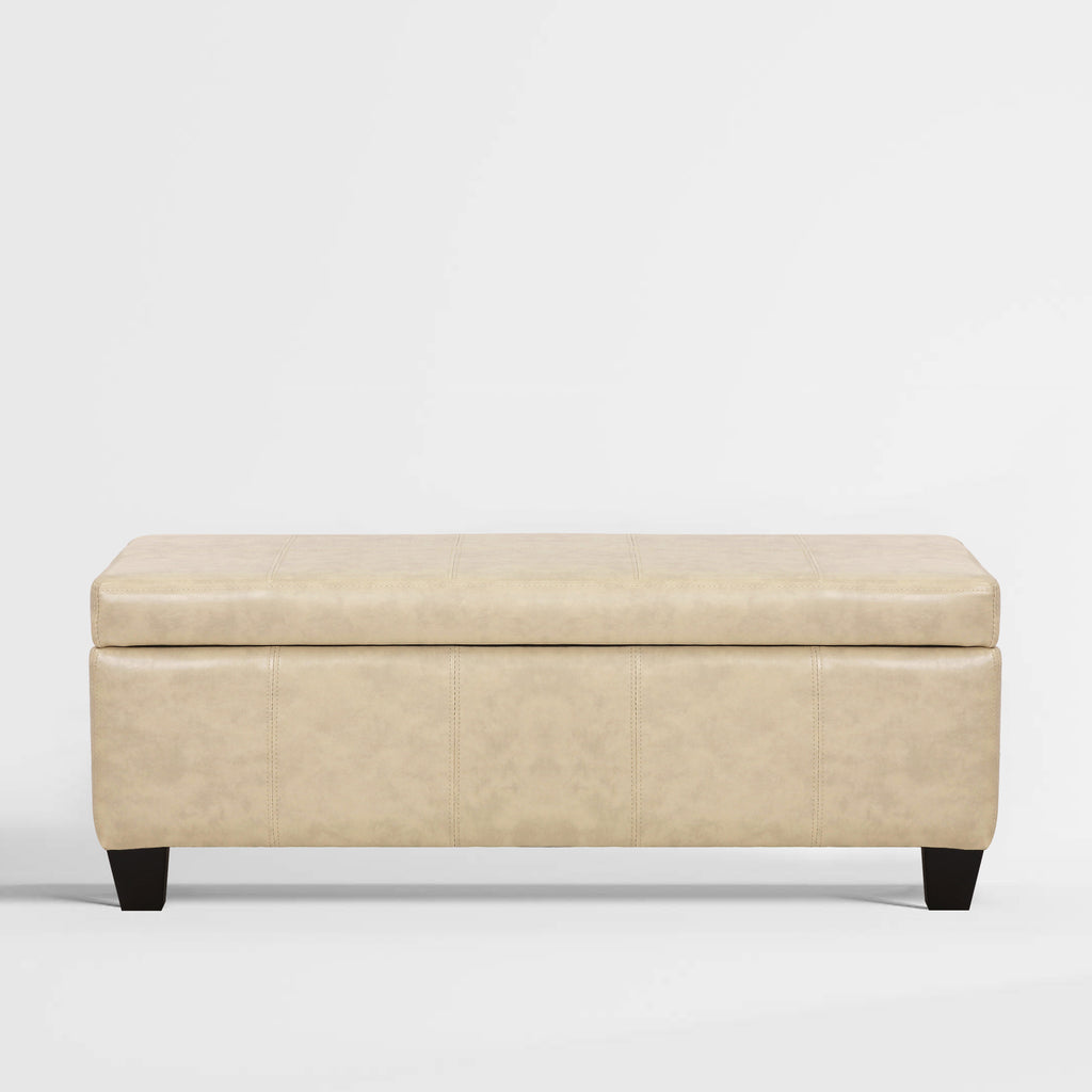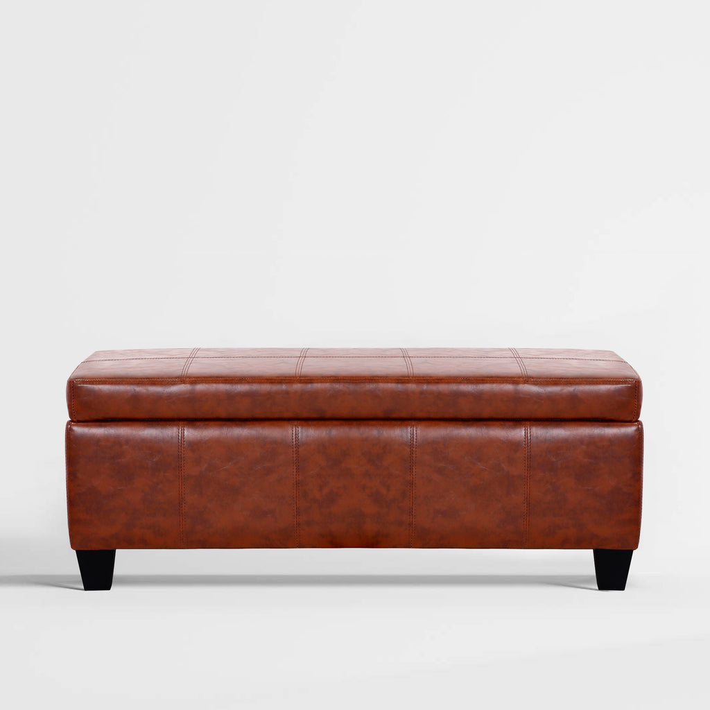 Maximize your living space with a multi-use faux leather storage ottoman. Made from a solid rubberwood frame, the durable construction of this storage bench is great for holding extra blankets, pillows, magazines, or other household items. The attached safety hinge prevents the ottoman from closing too quickly. Thanks to its versatility, this padded storage ottoman bench can be used in offices, living rooms, bedrooms, or walkways. The smooth and shiny faux leather and marble design add a modern feel to any space. This storage ottoman is available in several colors to match most interior décor styles.