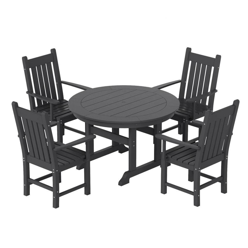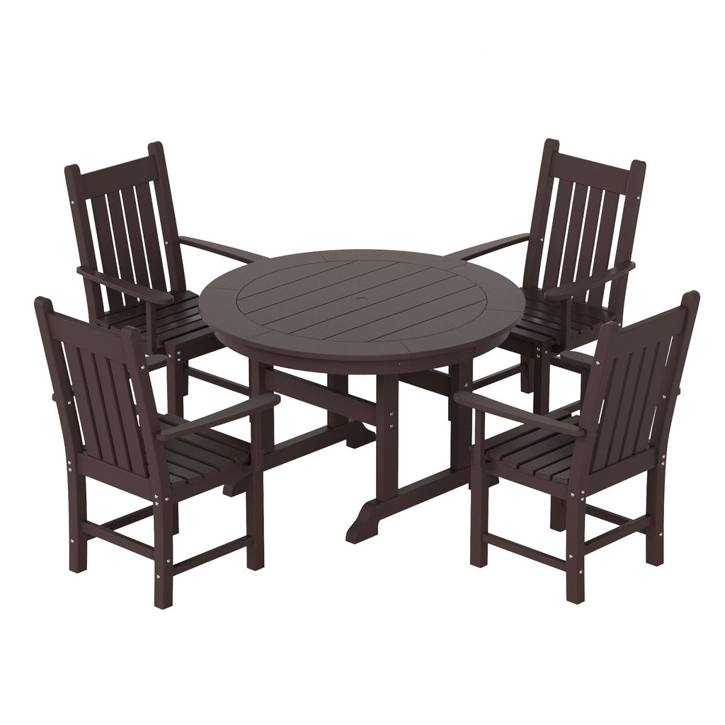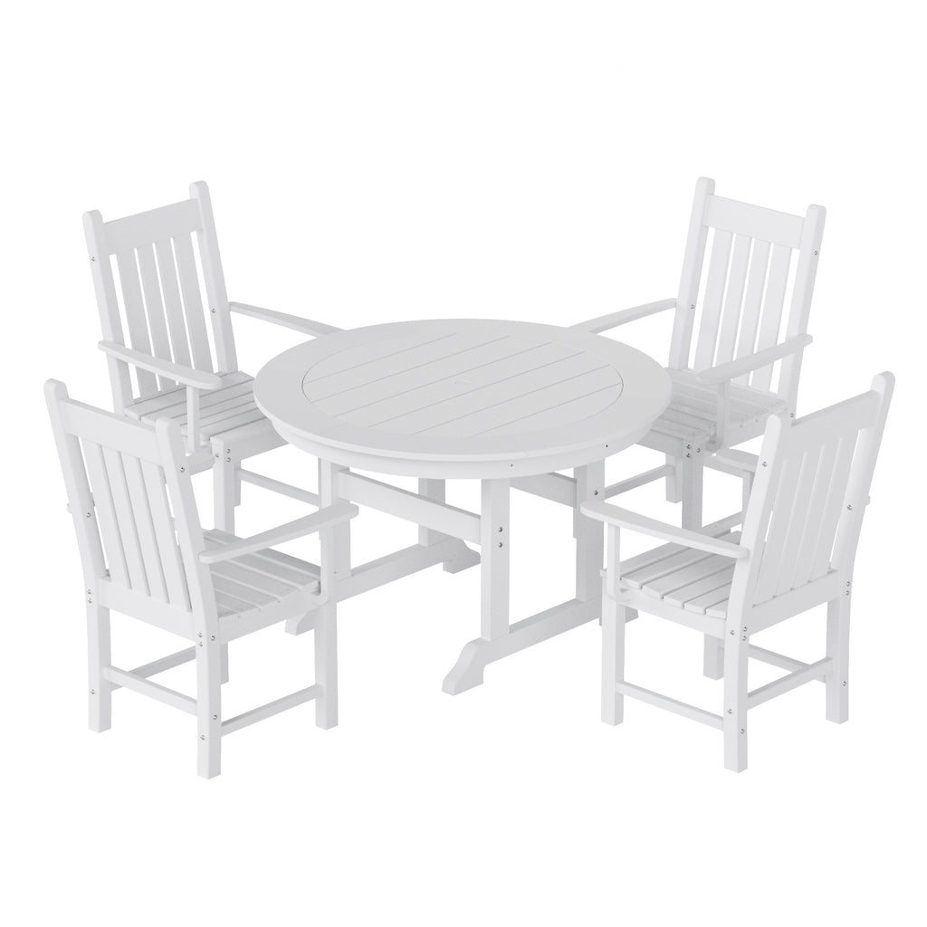 This outdoor dining set is sure to complete your patio or backyard. Created with HDPE material adds durability and can withstand the outdoor elements thanks to the HDPE's natural UV and weather resistant. The dining table and chair are made to look like natural wood without any of the disadvantages of natural wood, meaning that this outdoor dining set isn't prone to splinters, cracks, or peeling. This dining set is perfect for the outdoors and will have your home looking great with the semi-gloss finish that is sure to shine.