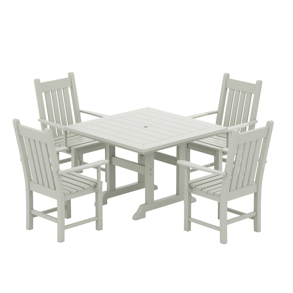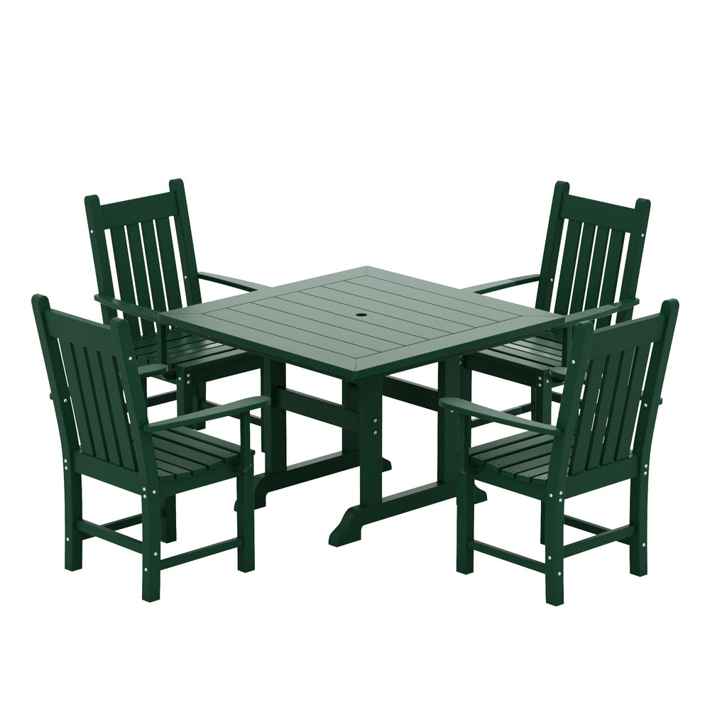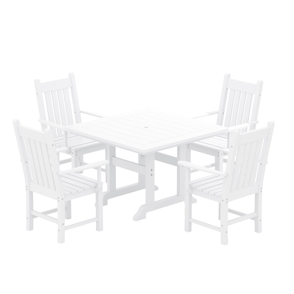 This outdoor dining set is sure to complete your patio or backyard. Created with HDPE material adds durability and can withstand the outdoor elements thanks to the HDPE's natural UV and weather resistant. The dining table and chair are made to look like natural wood without any of the disadvantages of natural wood, meaning that this outdoor dining set isn't prone to splinters, cracks, or peeling. This dining set is perfect for the outdoors and will have your home looking great with the semi-gloss finish that is sure to shine.
