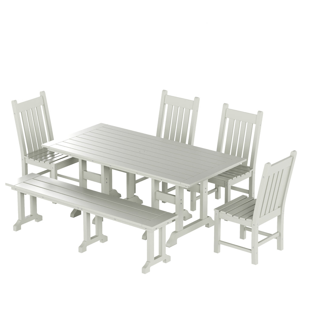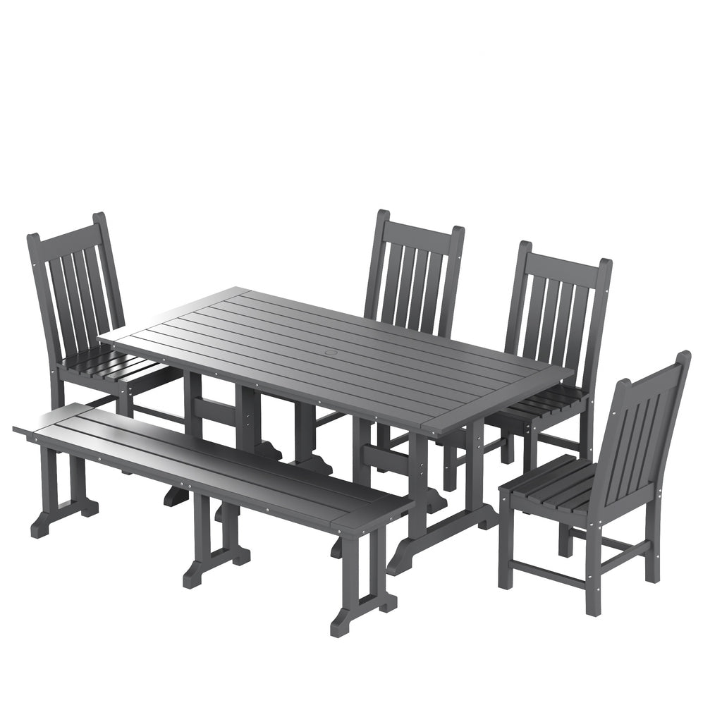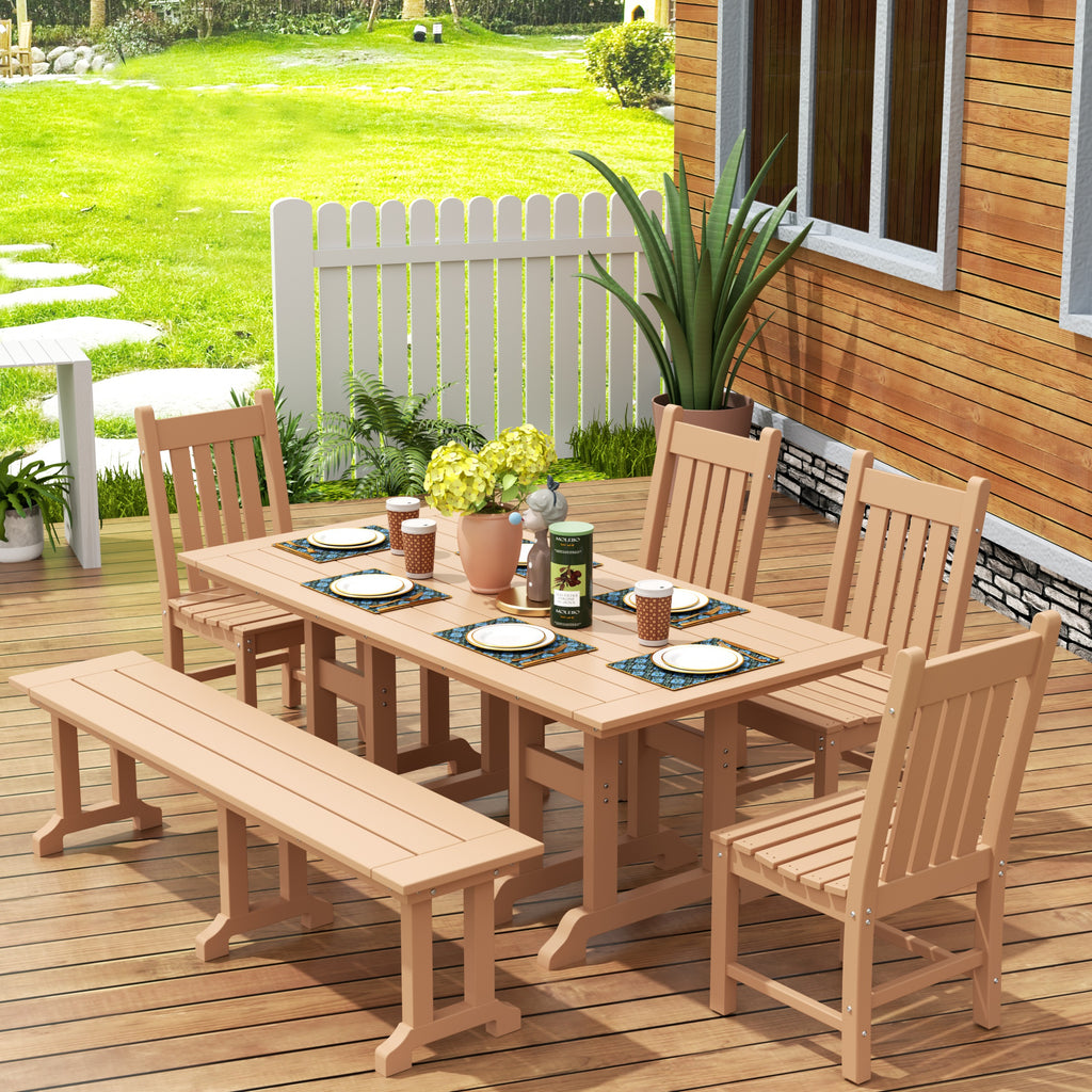 This outdoor dining set is sure to complete your patio or backyard. Created with HDPE material adds durability and can withstand the outdoor elements thanks to the HDPE's natural UV and weather resistant. The dining table, bench and chair are made to look like natural wood without any of the disadvantages of natural wood, meaning that this outdoor dining set isn't prone to splinters, cracks, or peeling. This dining set is perfect for the outdoors and will have your home looking great with the semi-gloss finish that is sure to shine.