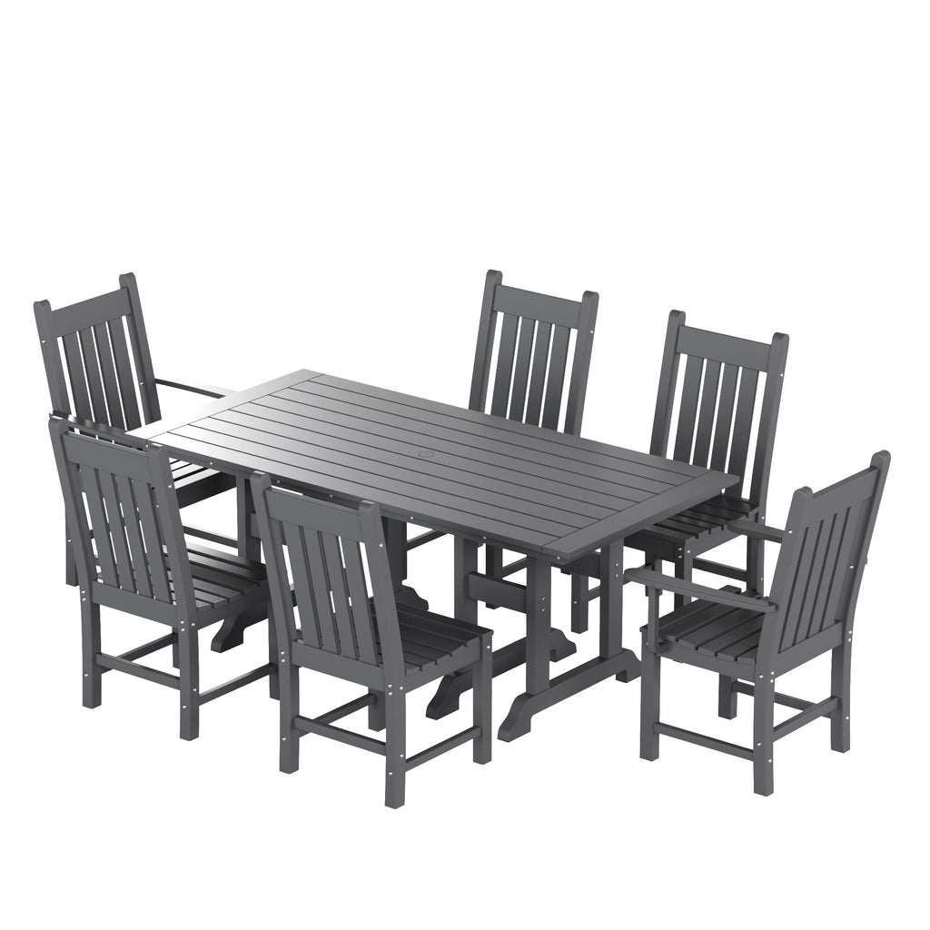 - Set Includes: One (1) Rectangle table, Four (4) Dining Chairs, Two (2) Dining Armchairs
