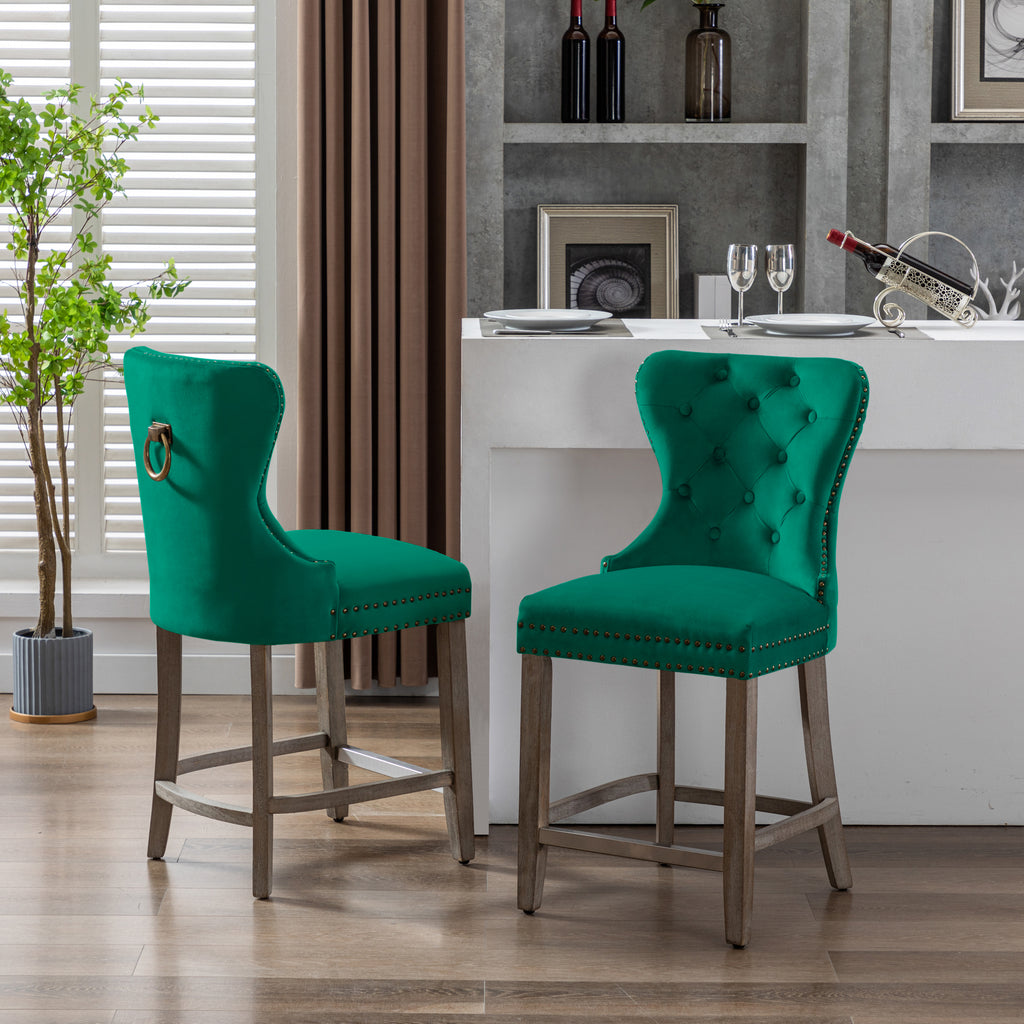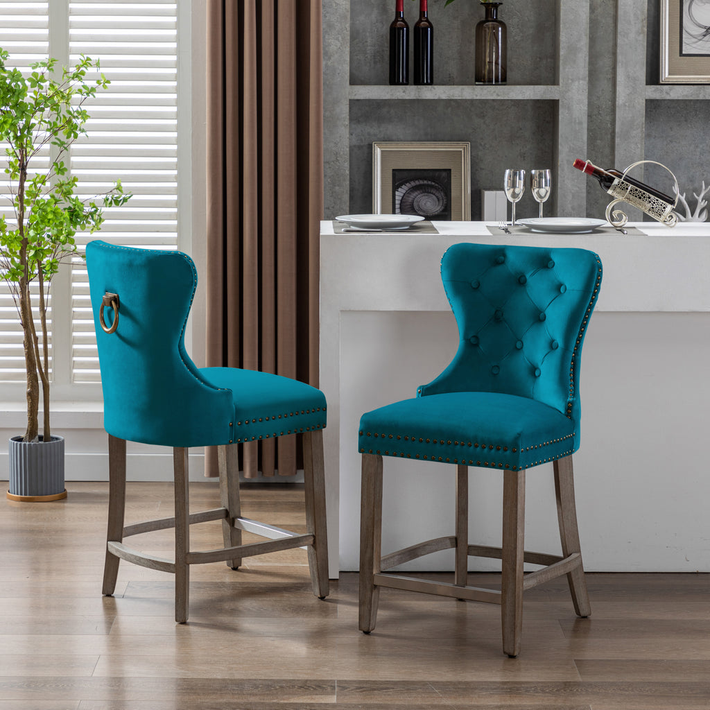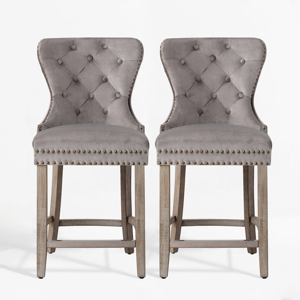 Glam up your counter space with a set of two 24" velvet button-tufted stools. The wingback design and dazzling nailhead trim bring beauty and artistic flair to any dining space. For optimum sitting comfort, place your feet on the silver-plated footrest. The antique gray rubberwood legs make these armless stools durable and comfortable. The ornamental ring will add a touch of style to your unique décor.