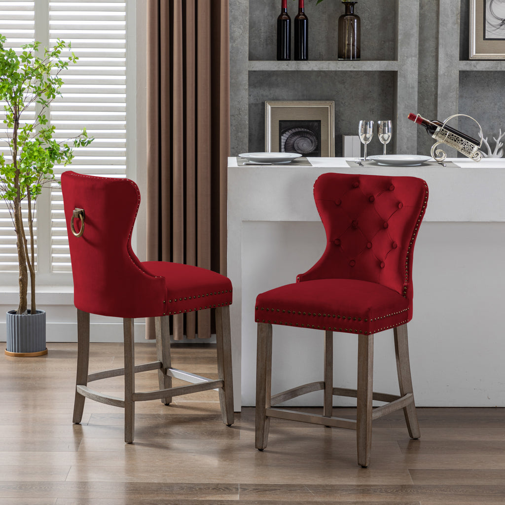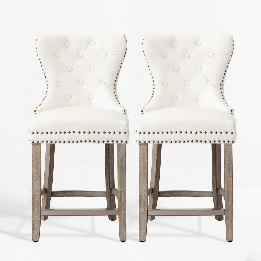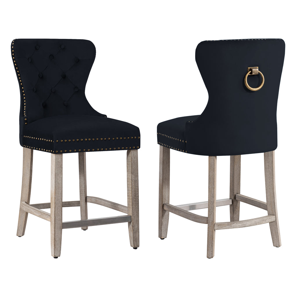 Glam up your counter space with a set of two 24" velvet button-tufted stools. The wingback design and dazzling nailhead trim bring beauty and artistic flair to any dining space. For optimum sitting comfort, place your feet on the silver-plated footrest. The antique gray rubberwood legs make these armless stools durable and comfortable. The ornamental ring will add a touch of style to your unique décor.